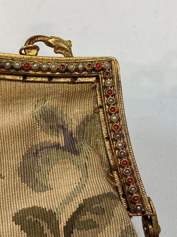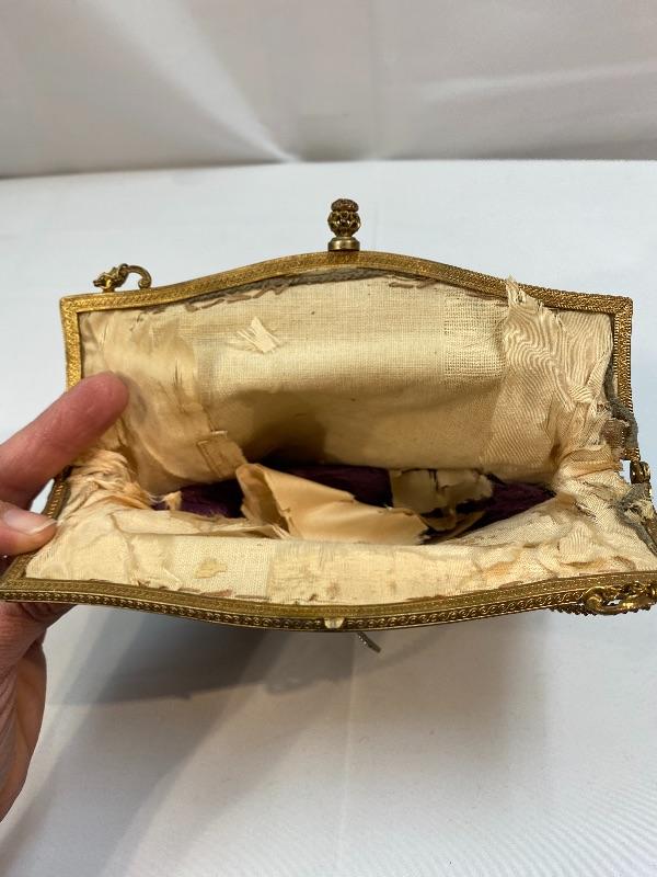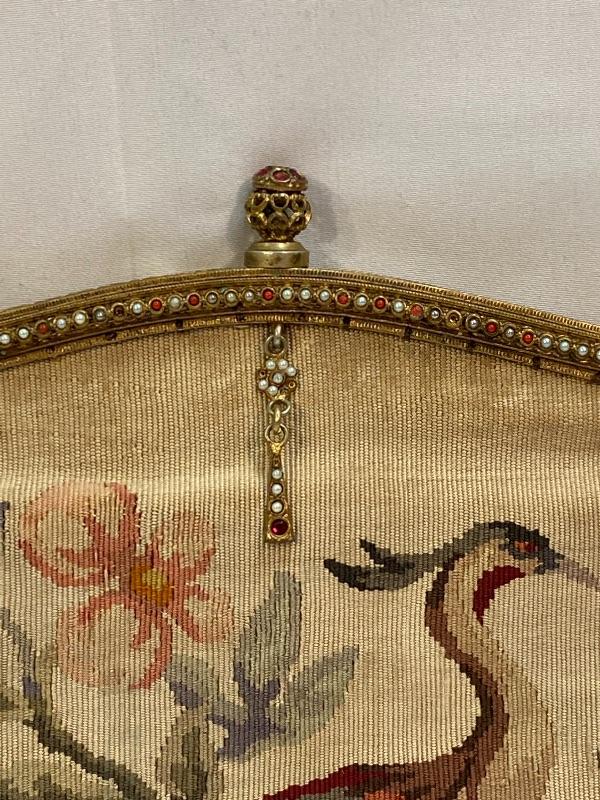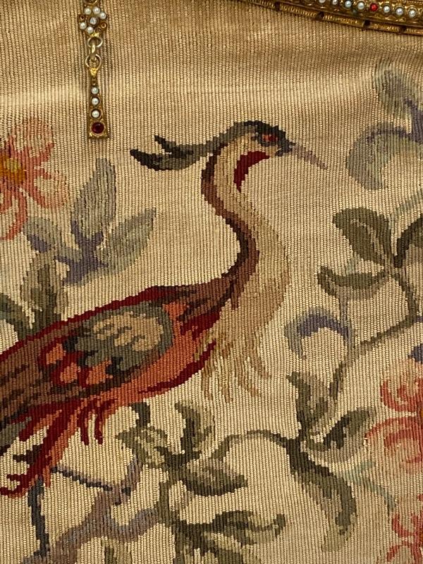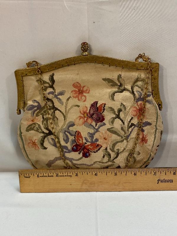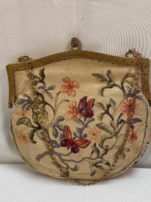 Vintage tapestry stle purse. Features a bird with flowers on one side & butterflies with flowers on the other. Some discolor from age. The lining inside has fallen apart. About 7" size.