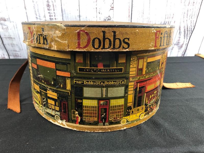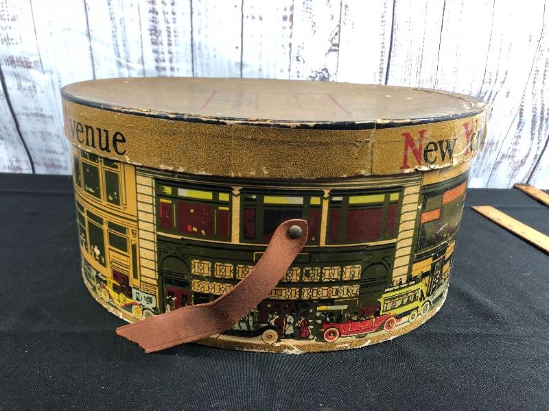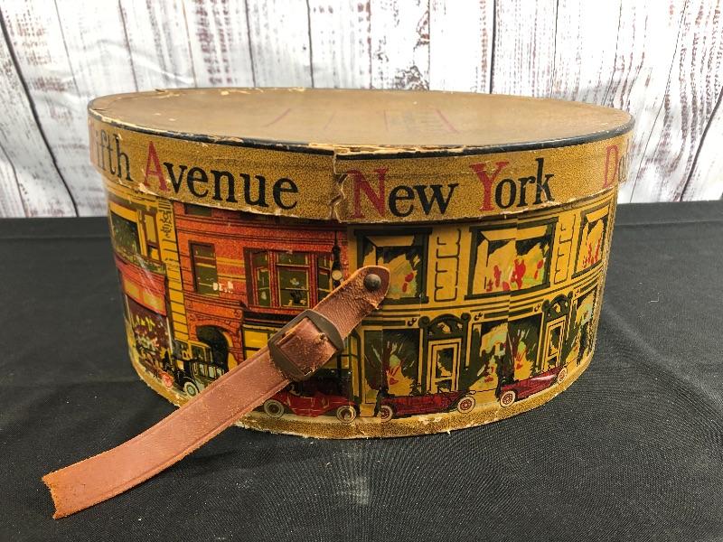 Vintage Dobbs Fifth Ave New York hat box. Round hat box with a city street picture. There is signs of age and wear, but it displays great. Original strap is attached but broken. Oval shape, about 12". #028-009