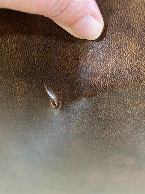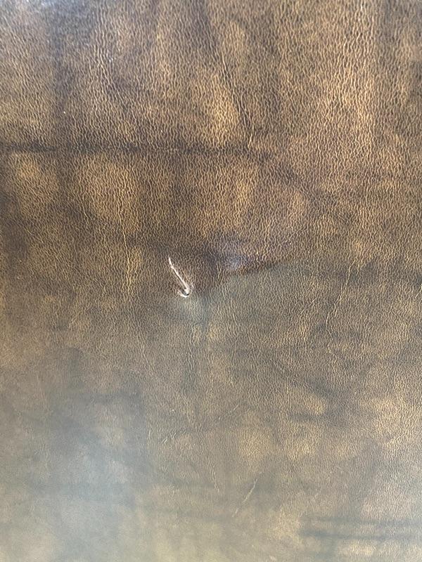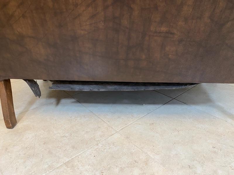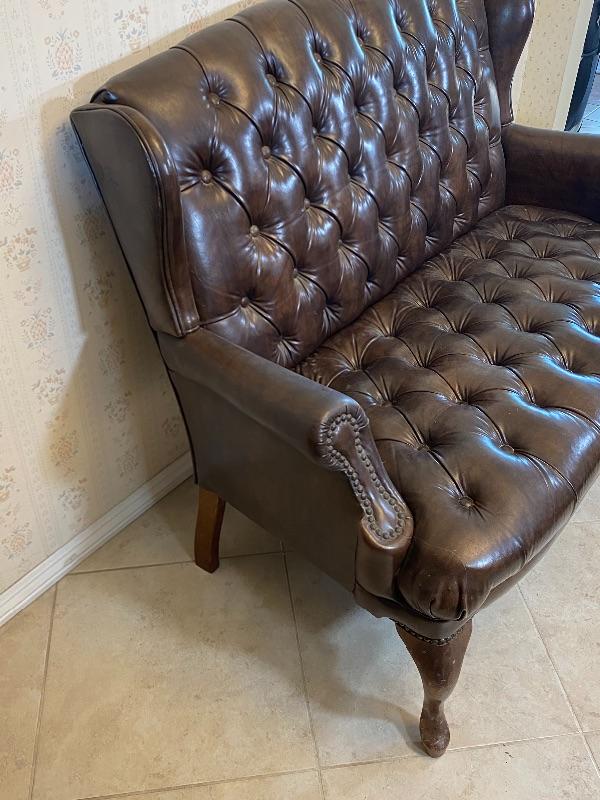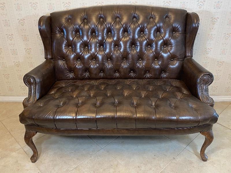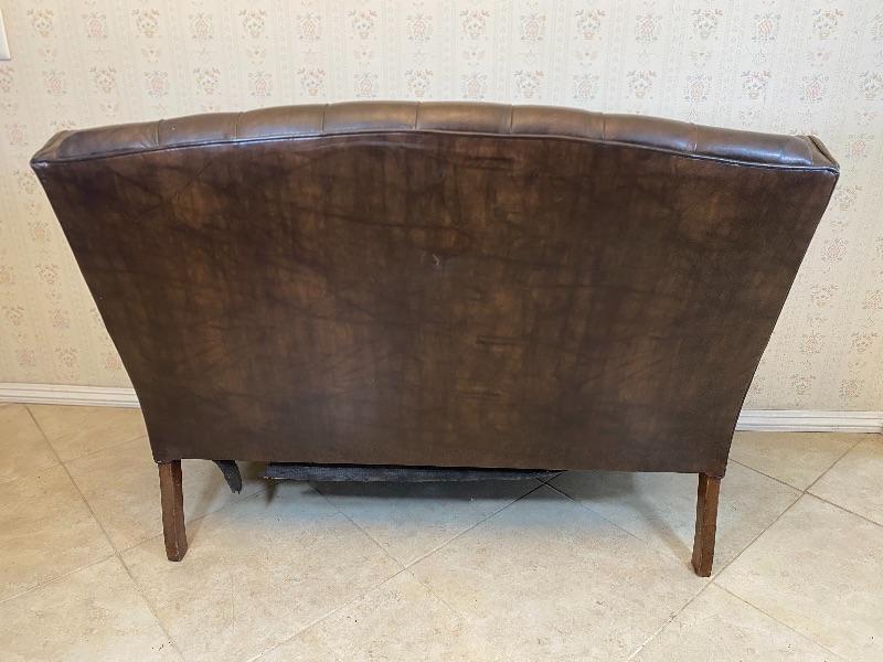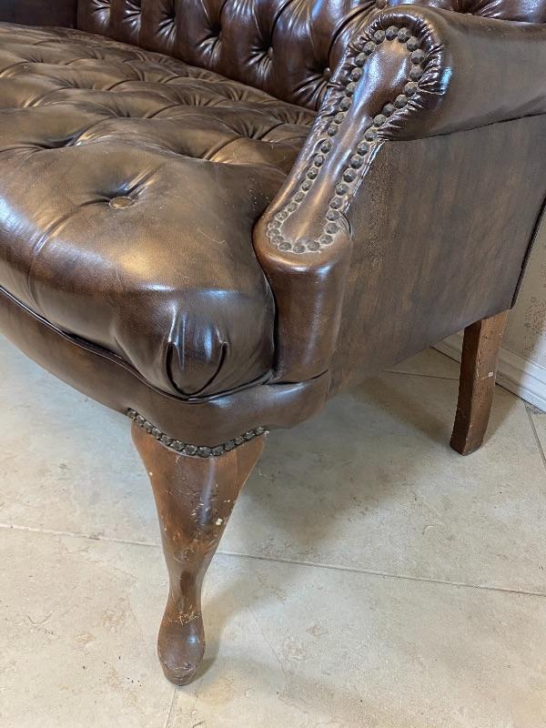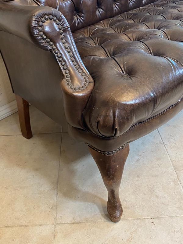Dark brown faux leather tufted/buttoned loveseat. Claw foot style front legs. Studded nail head trim. There is a spot of damage on the back where a inner spring is pressing out slightly. #030-1009