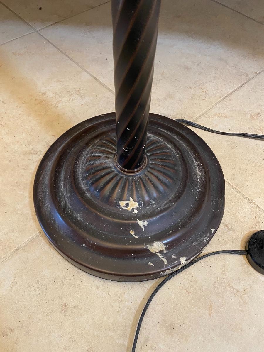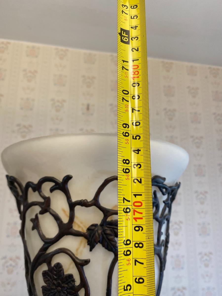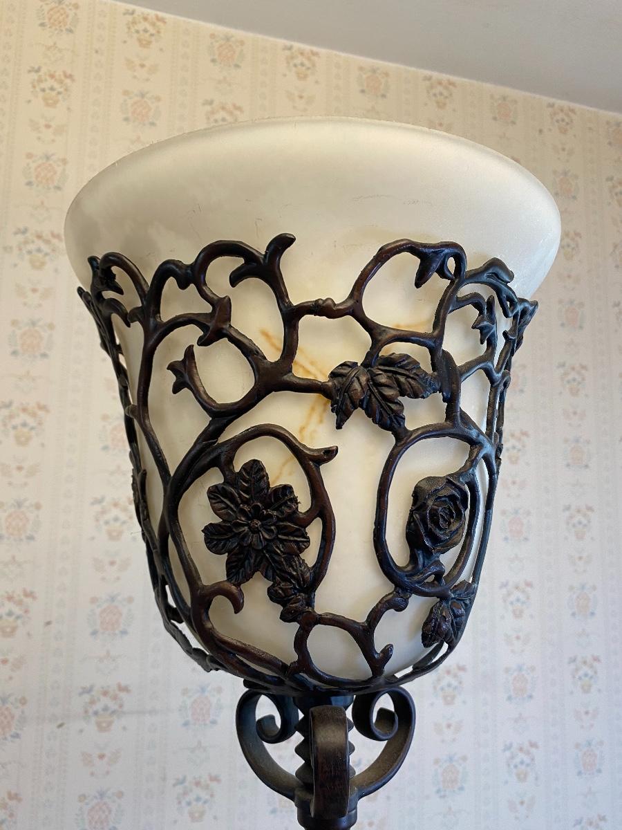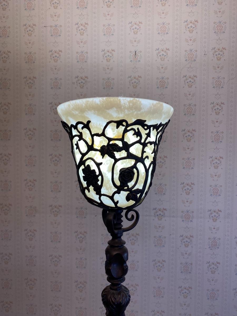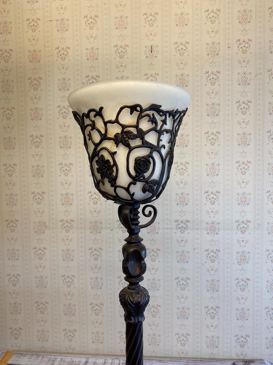Floor Lamp, Torch Style with filligree style metal working and cream colored glass shade
