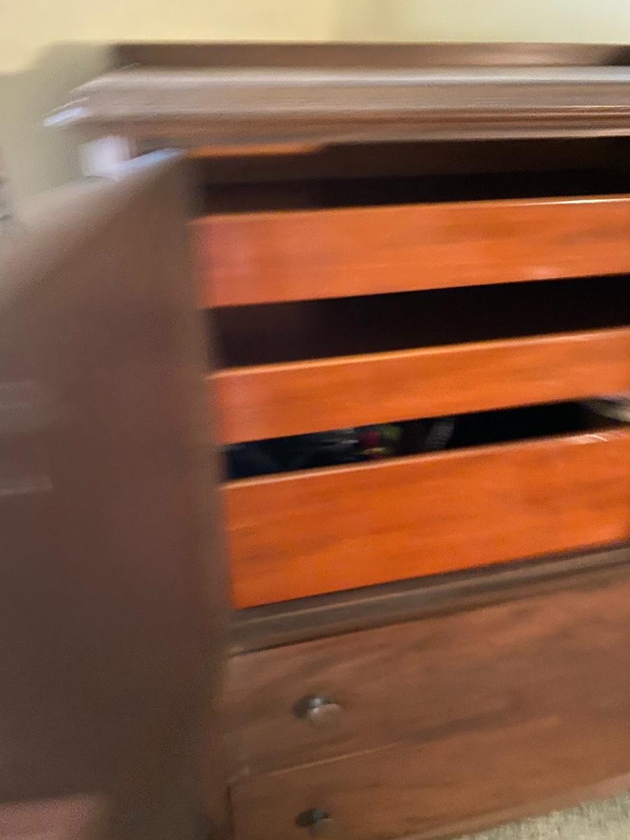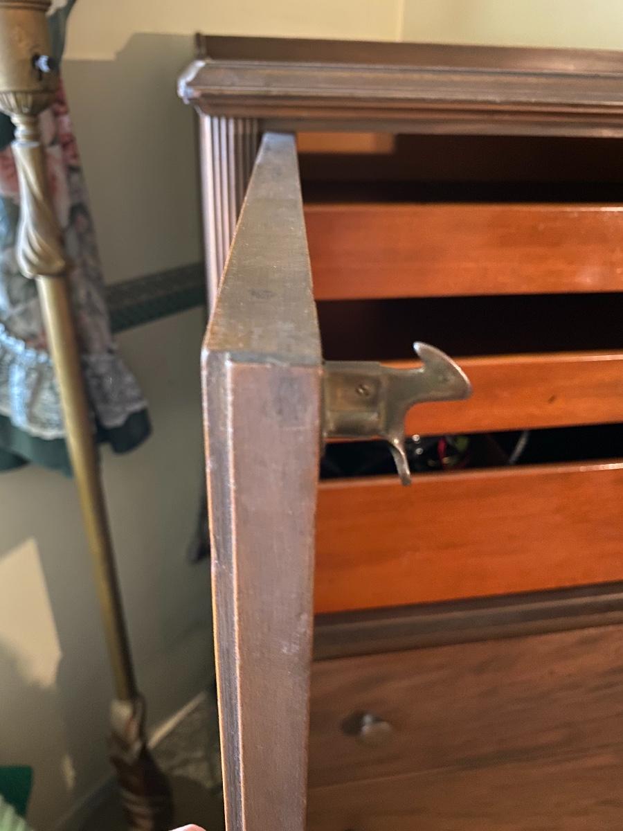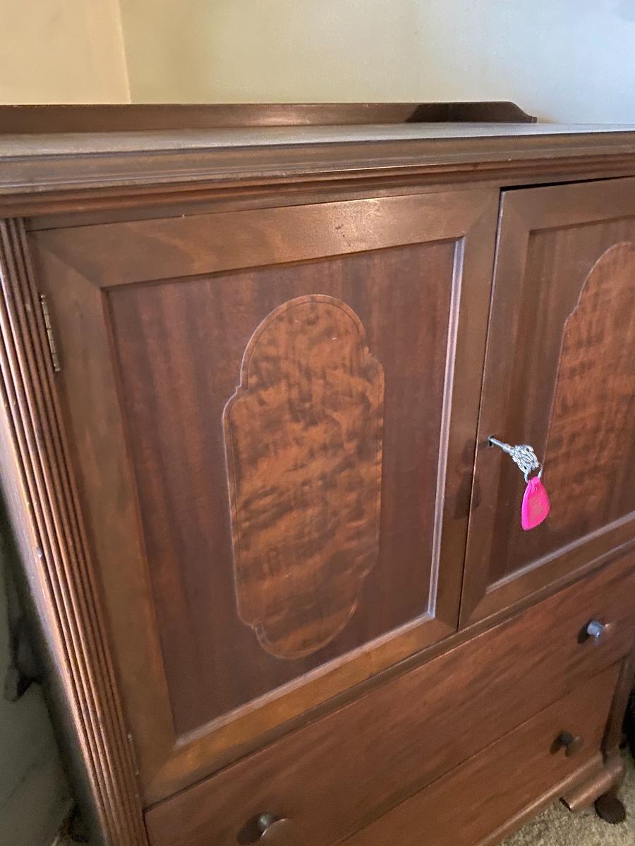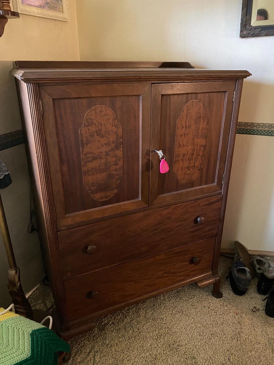 Vintage high boy dresser from Hathaway. Some light wear. About 5' tall. Locking cabinet doors.