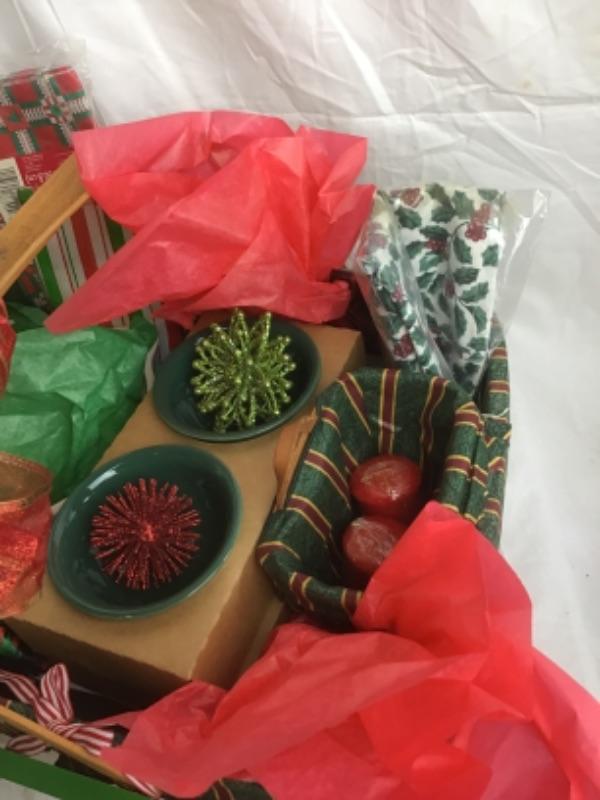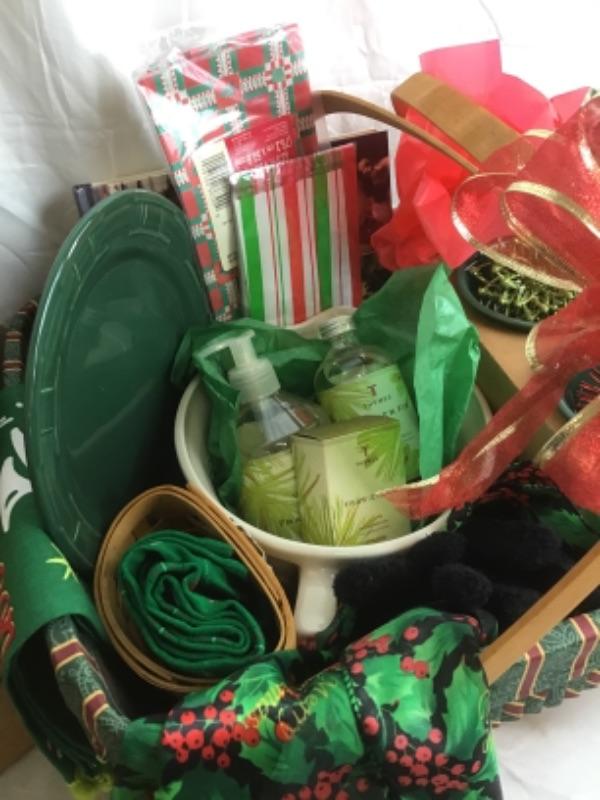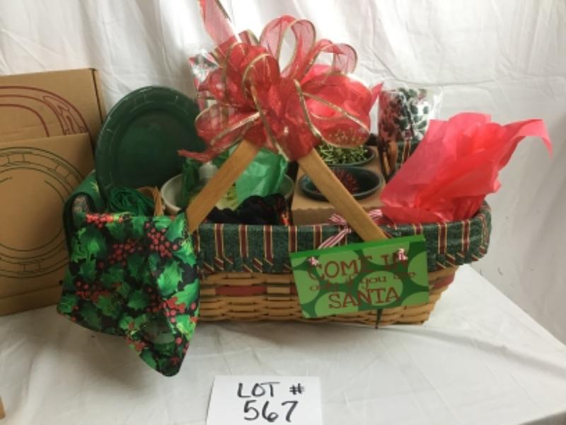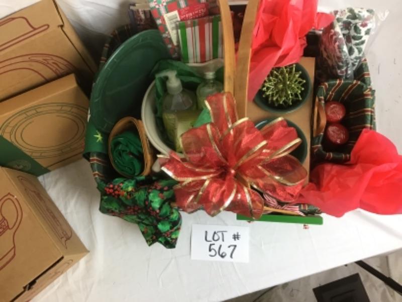 Longaberger Pottery - 3 Qt Baking Dish/Batter Bowl/Luncheon Plate/Dessert Bowls/Apron/2 Small Longaberger Basket 1 ) with fabric liner and candles 1 ) Socks, Book, Tissue Paper, Tea Towel, Scarf & Santa Sign