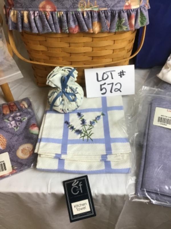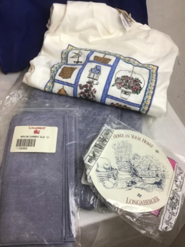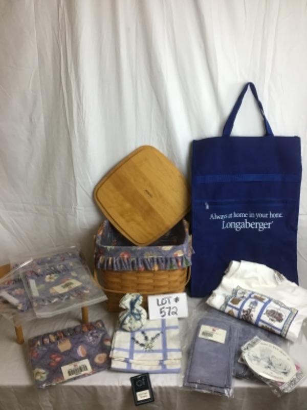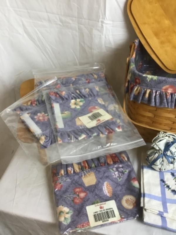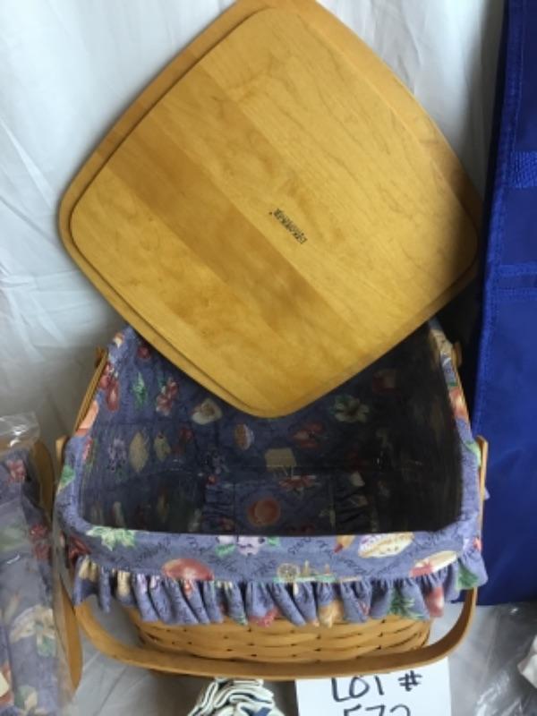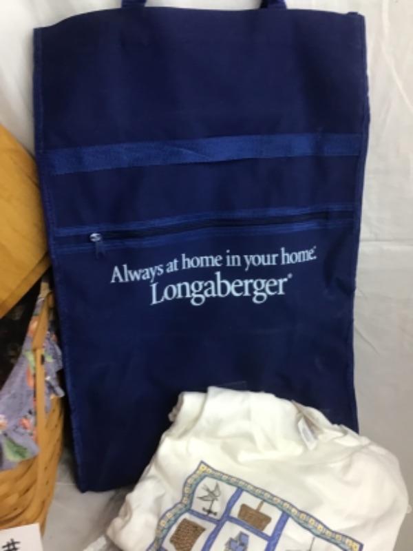we have a 2 Handled Longaberger Basket with Fabric & Plastic Liners & Lid, Extra Liners, Tea Towel, T-shirt, Jar Opener Grippy, Travel Bag on Wheels