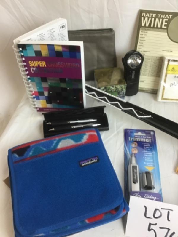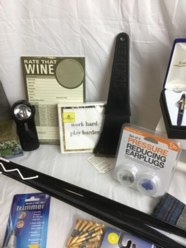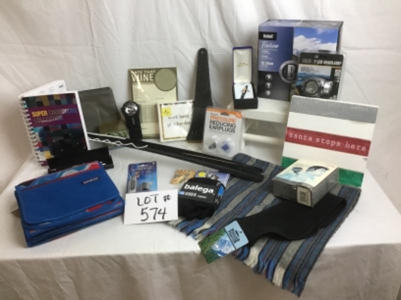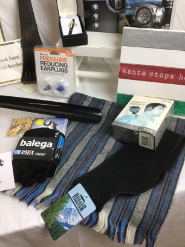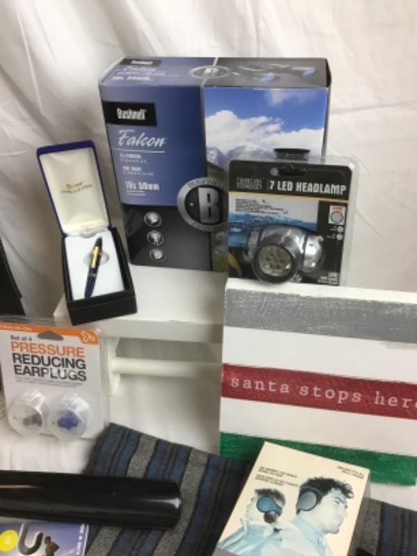 Mens Gift Lot consists of - Wool Scarf/Head Warmer/Socks/Ear Warmers, Crossword Book, Ice Scraper, Bushnell Binoculars, 7 LED Head Lamp, Nose/Ear Trimmer, Golf Tees and more