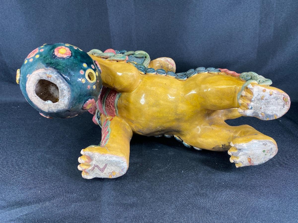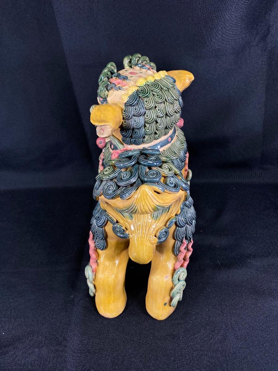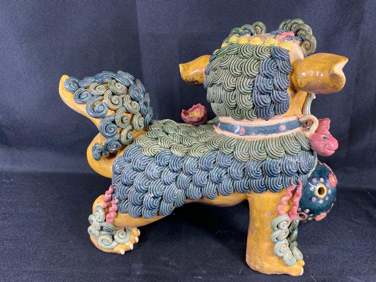 Colorful vintage Foo Dog figurine. Asian pottery statue stands about 10" tall and is 13" long. Nicely done with a ton of details. There is a mark of some kind on bottom of one foot. Small chip in ear, does not stand out to much.