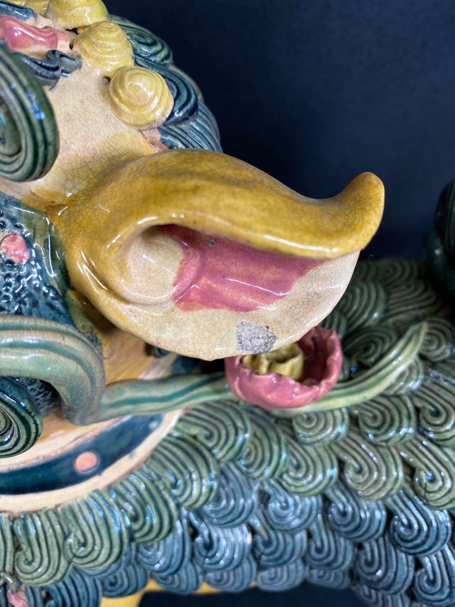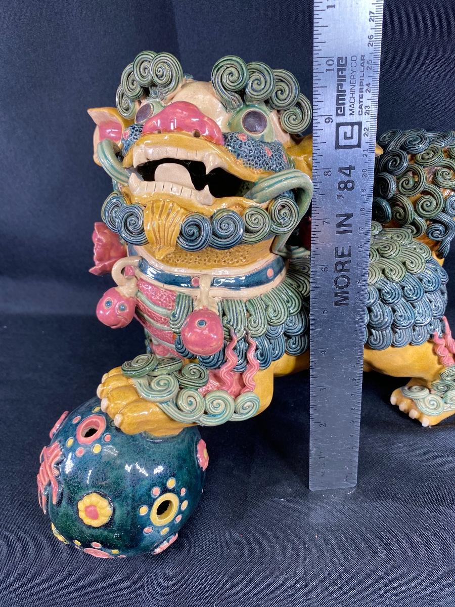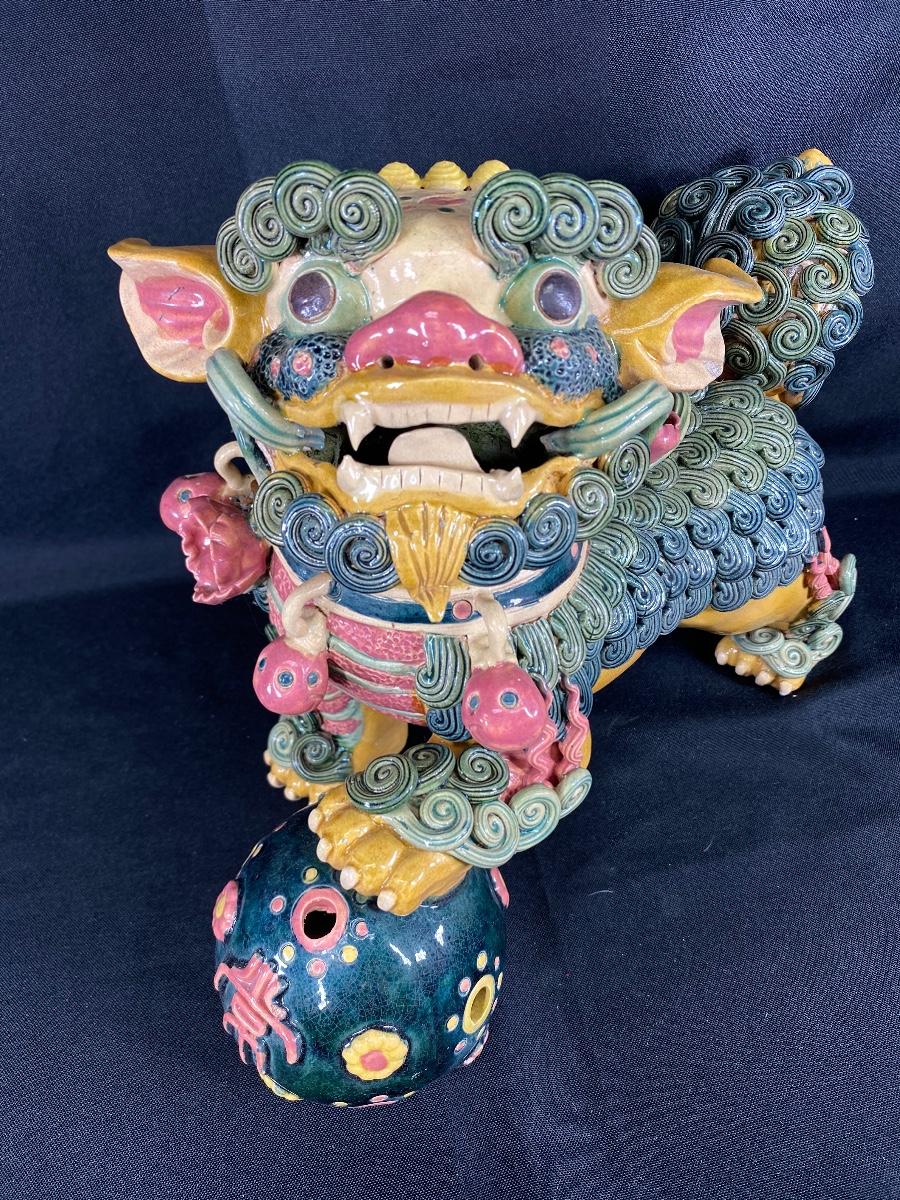 Colorful vintage Foo Dog figurine. Asian pottery statue stands about 10" tall and is 13" long. Nicely done with a ton of details. There is a mark of some kind on bottom of one foot. Small chip in ear, does not stand out to much.