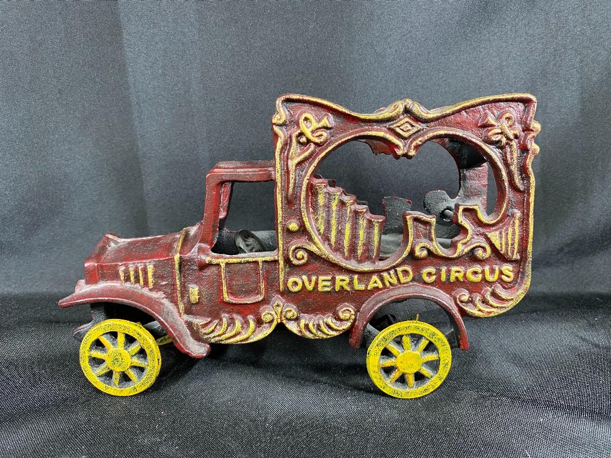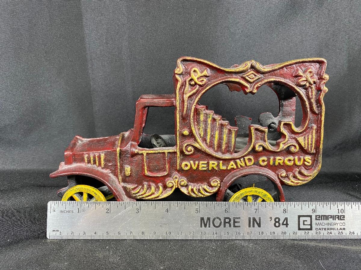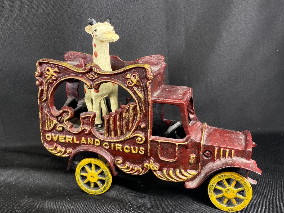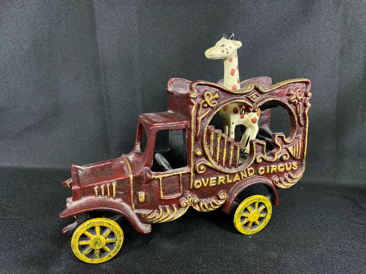 Vintage painted cast iron Overland Circus car with removable giraffe. Heavy, great for a doorstop. Wheels move. Good condition, a little dusty from display.