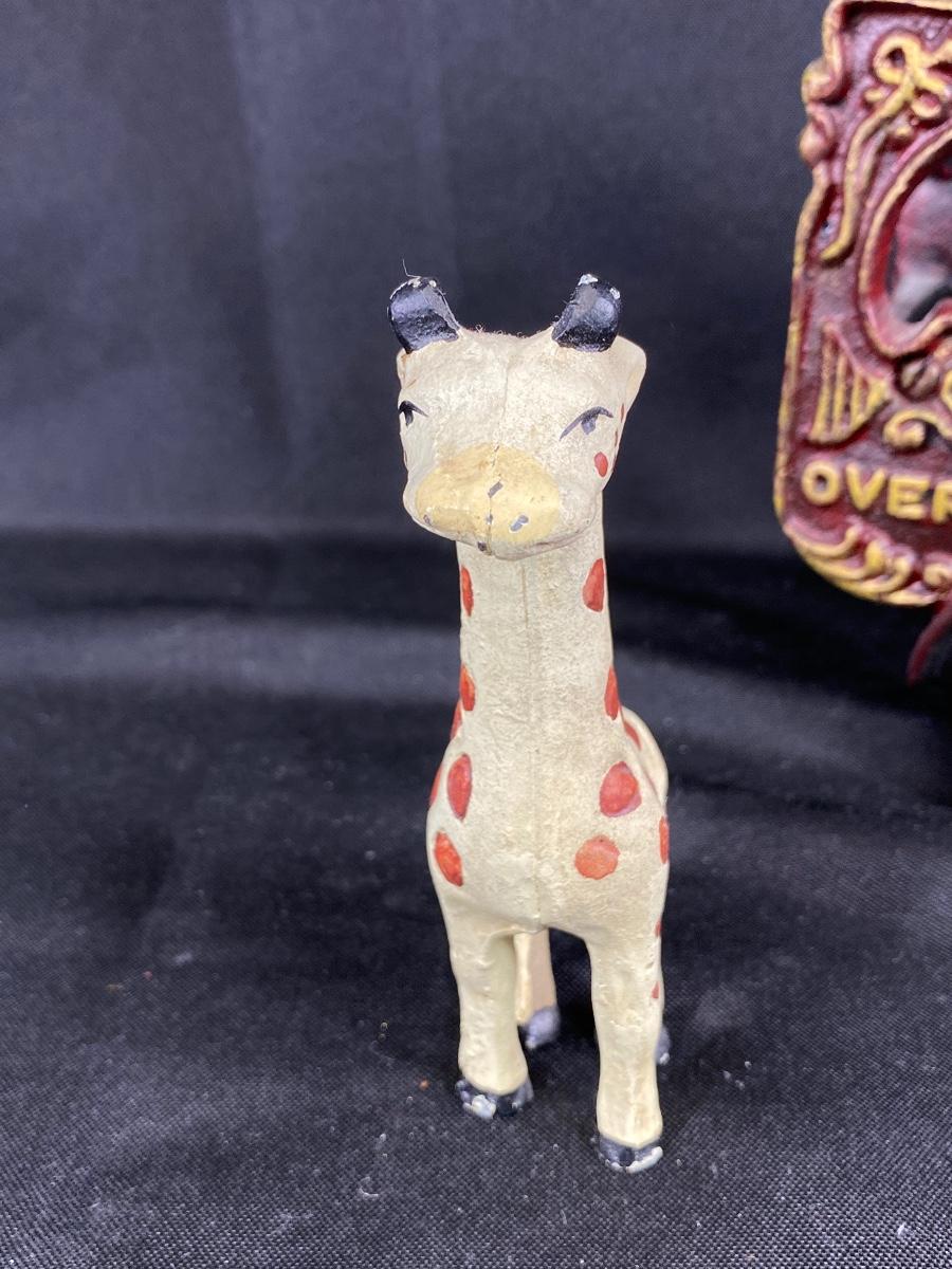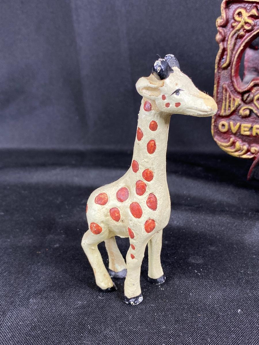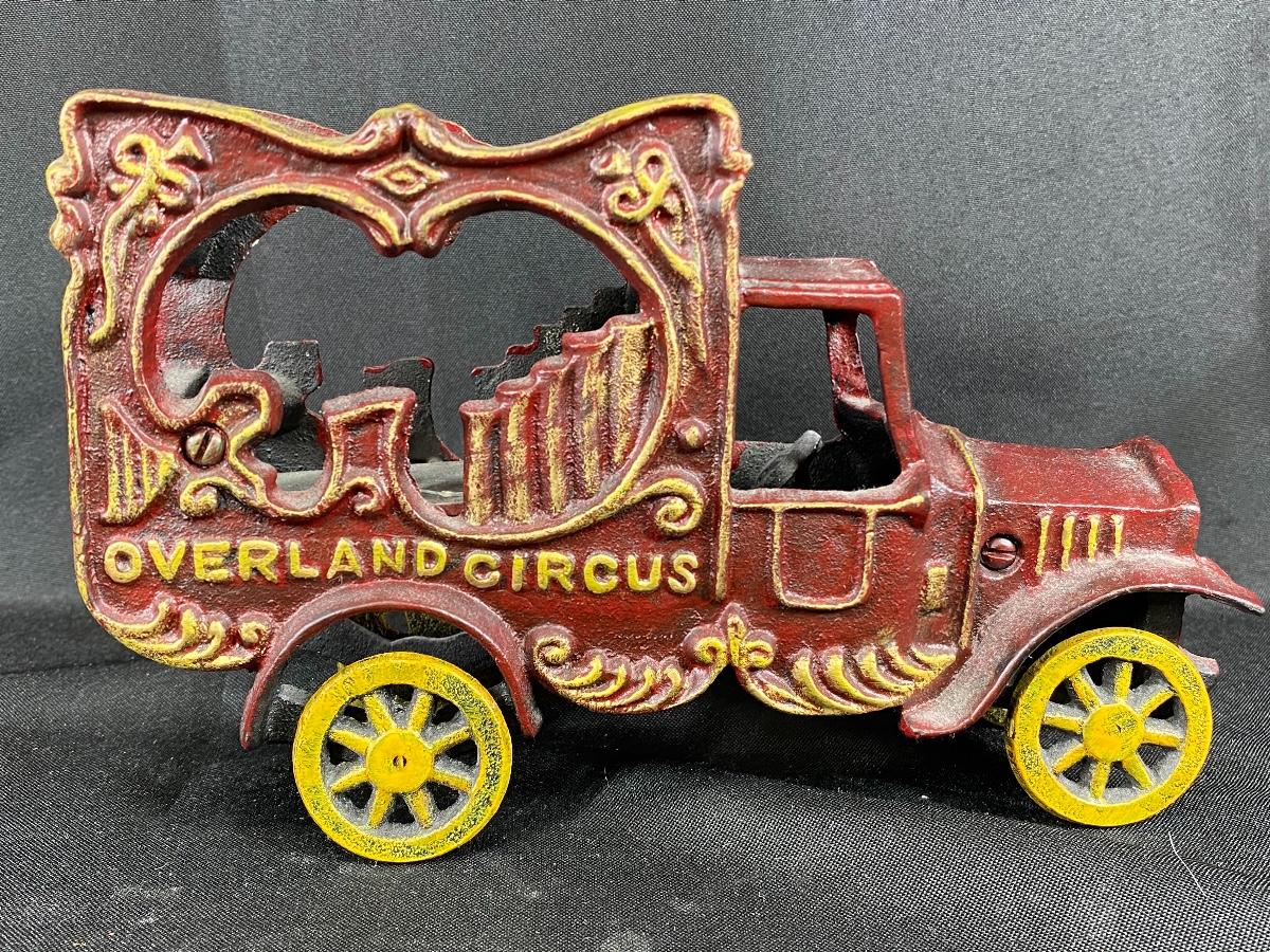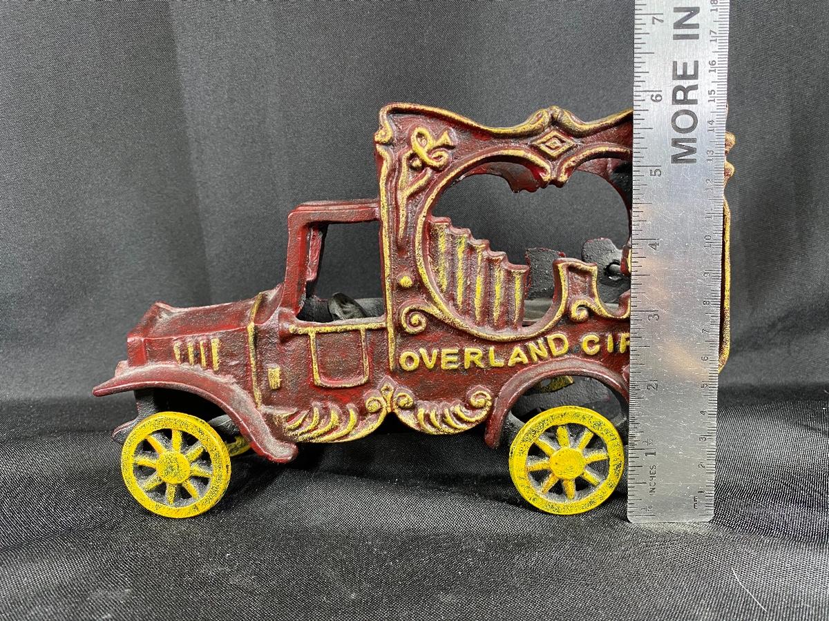 Vintage painted cast iron Overland Circus car with removable giraffe. Heavy, great for a doorstop. Wheels move. Good condition, a little dusty from display.