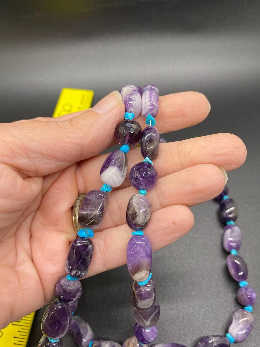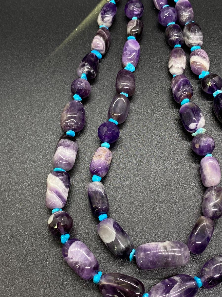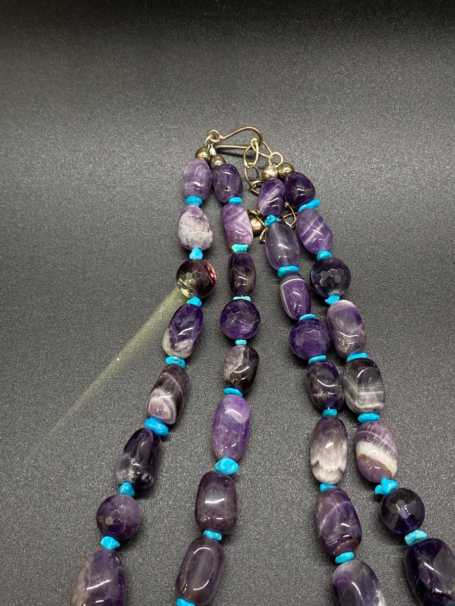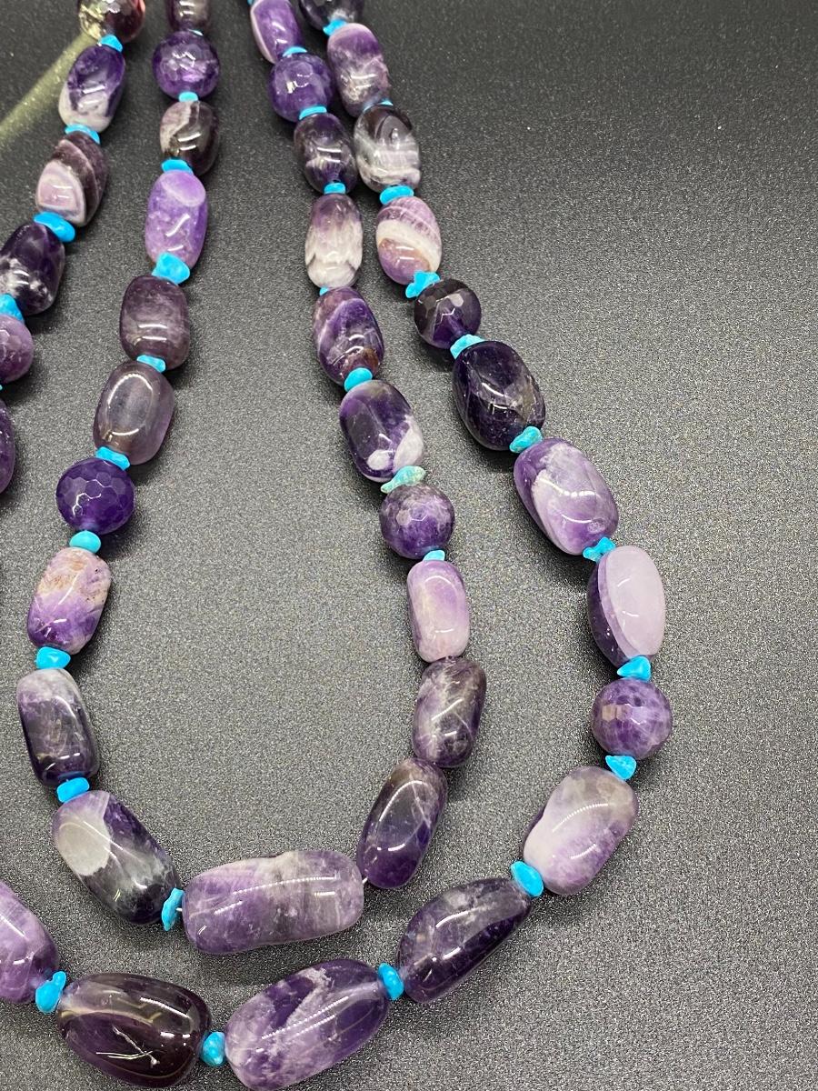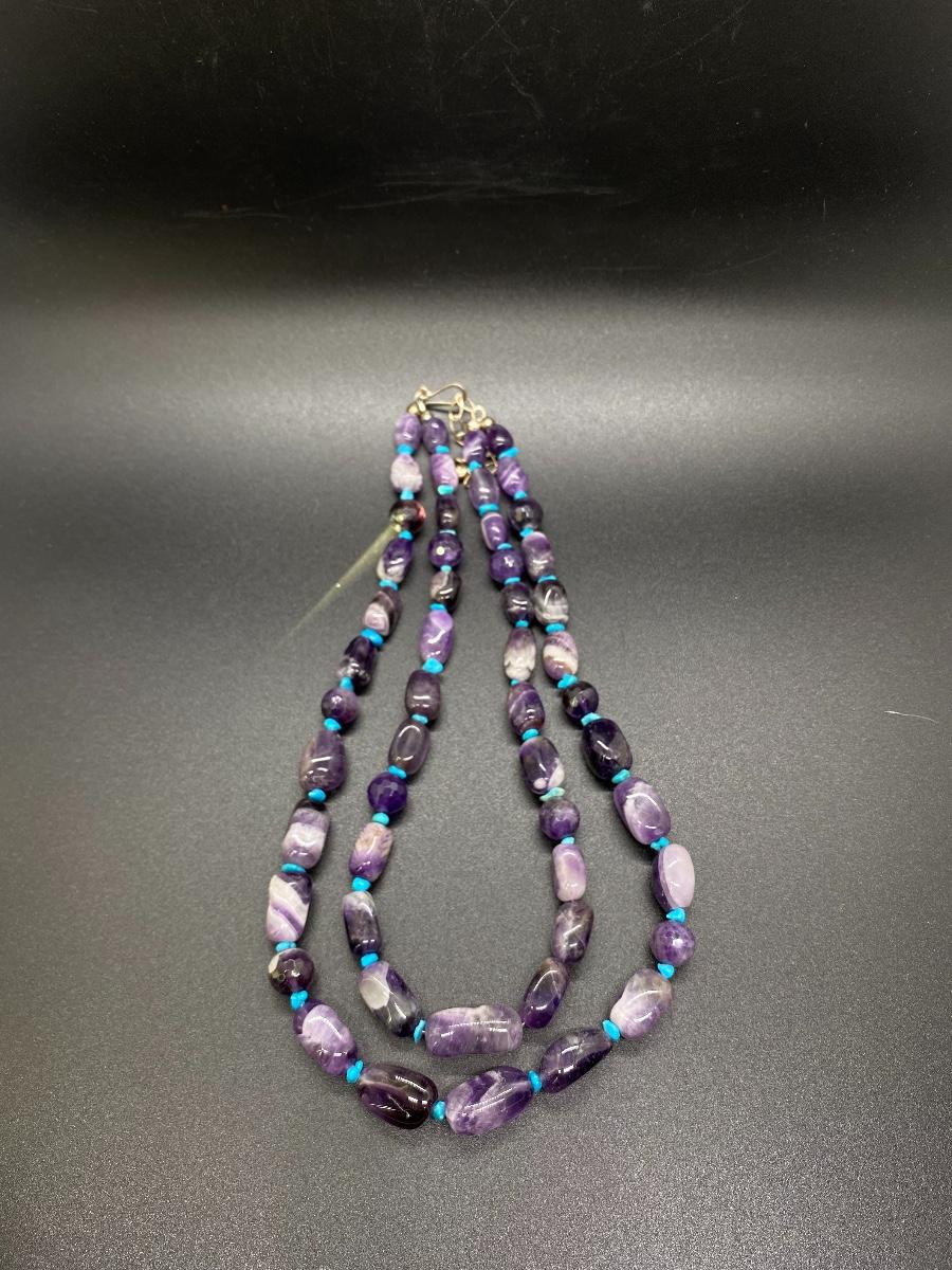 Beautiful double strand necklace of polished and cut amethyst beads. Separated by small turquoise disks. Sits about collar bone. Could be taken apart and repurposed to other pieces.