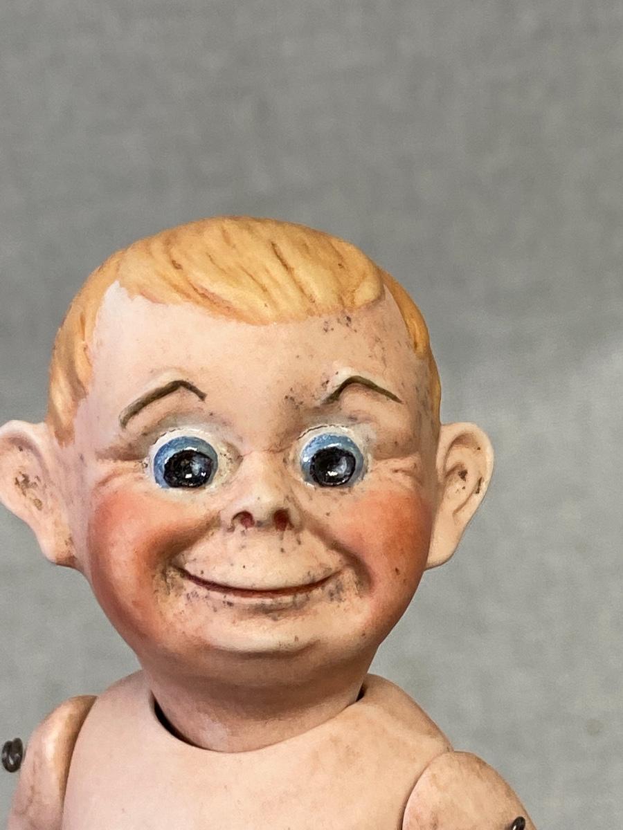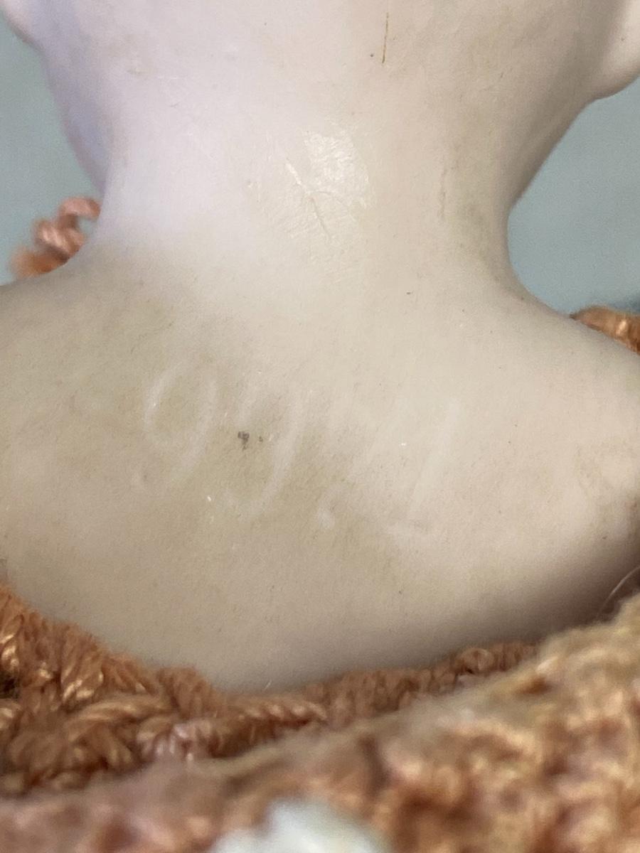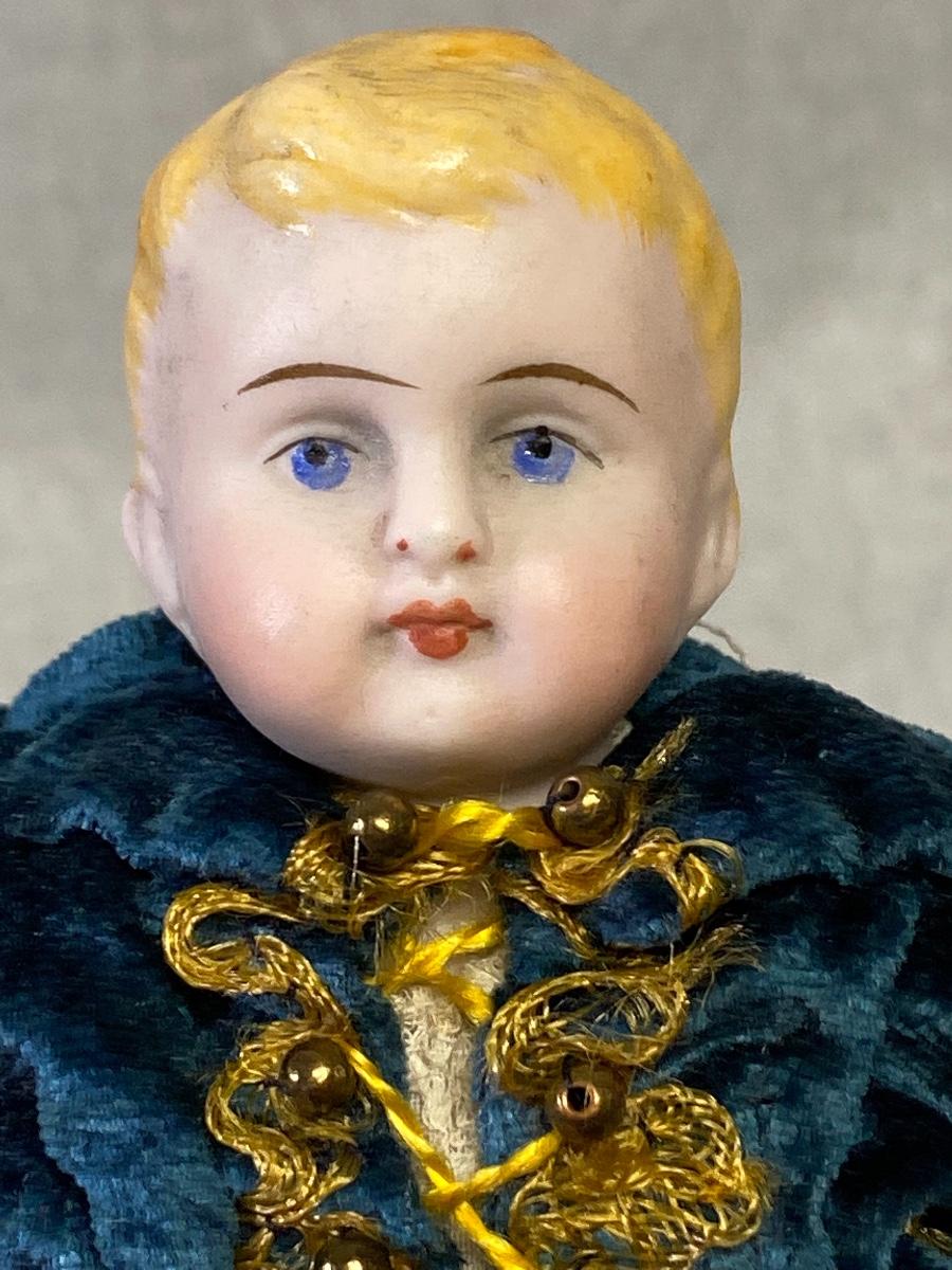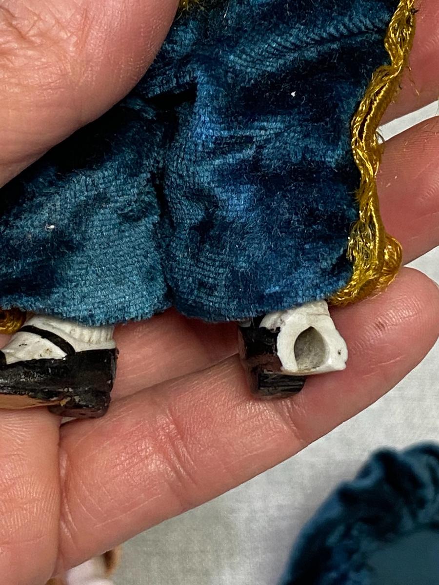 Set of 3 dollhouse sized dolls. All very different from the other. Each has signs of age. The Blue Boy doll does have a broken foot and damaged thumb. About 6" size. Only the girl has some sort of marking.