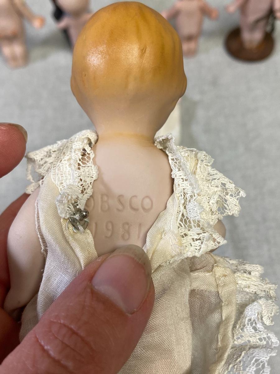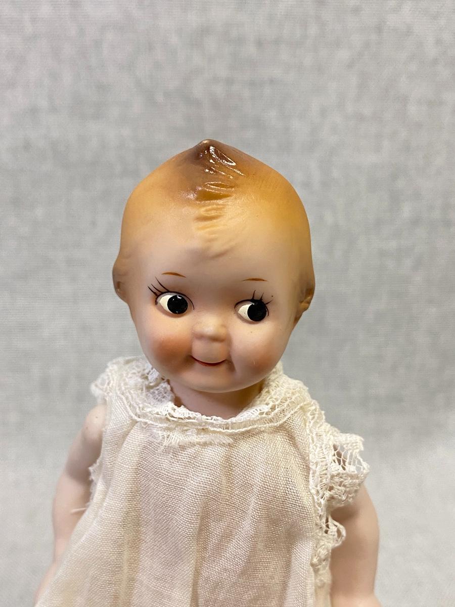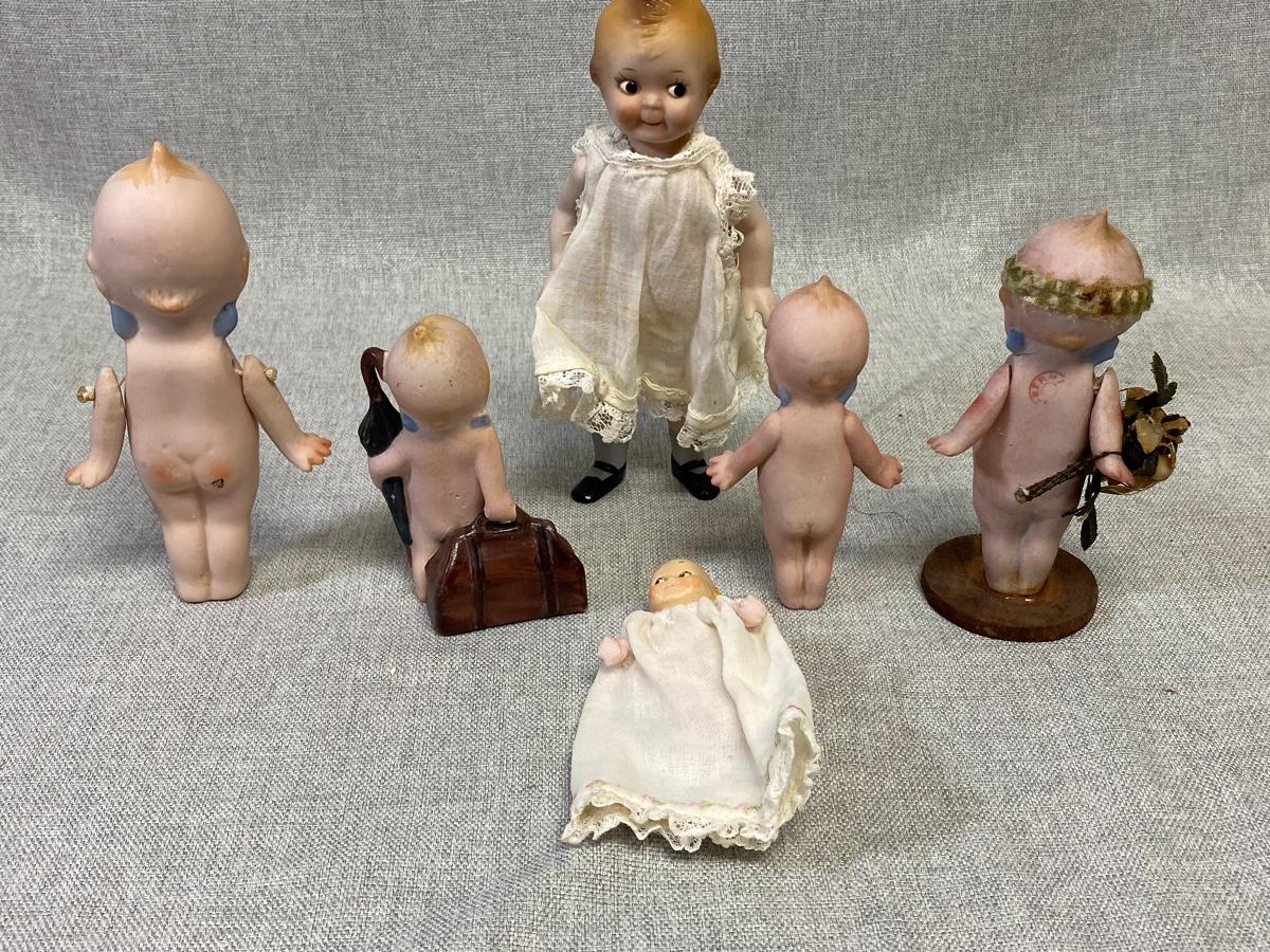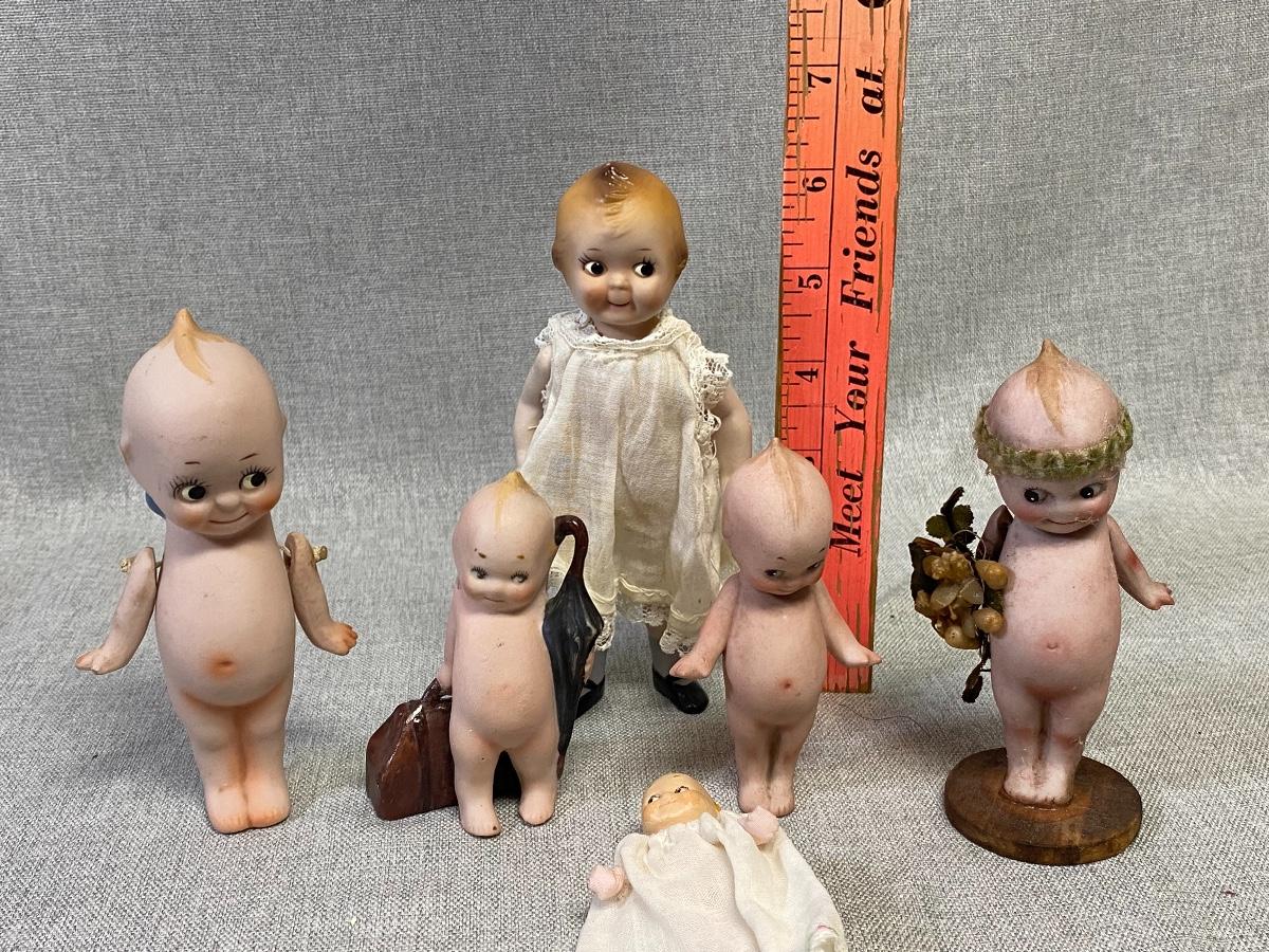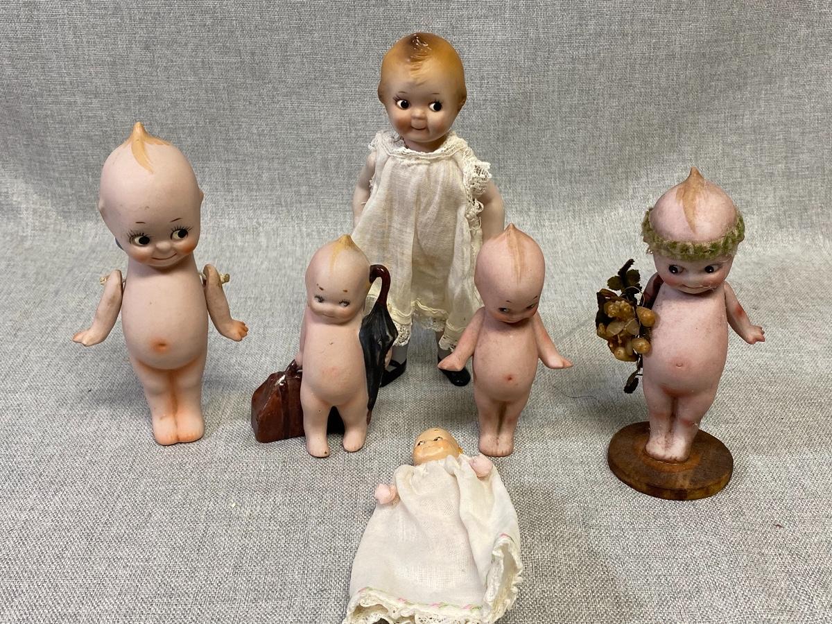 Mixed lot of Kewpie style dolls. 6 dolls total All are bisque except the tiny baby is composite head with soft body. All are in good vintage condition, light wear from age. Tall doll in the middle is 1981 BSCO doll.
