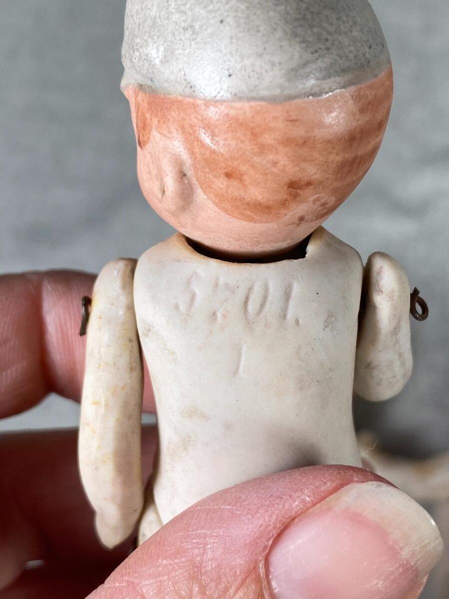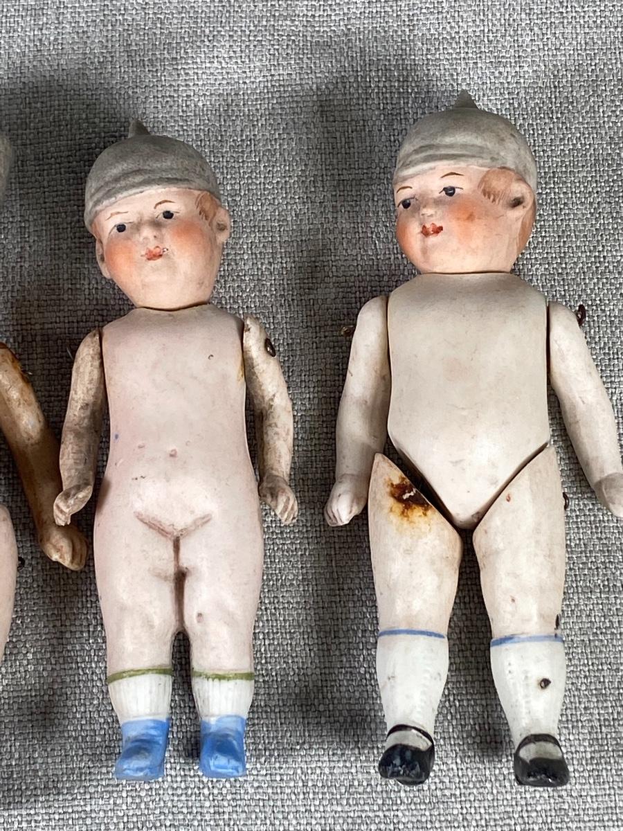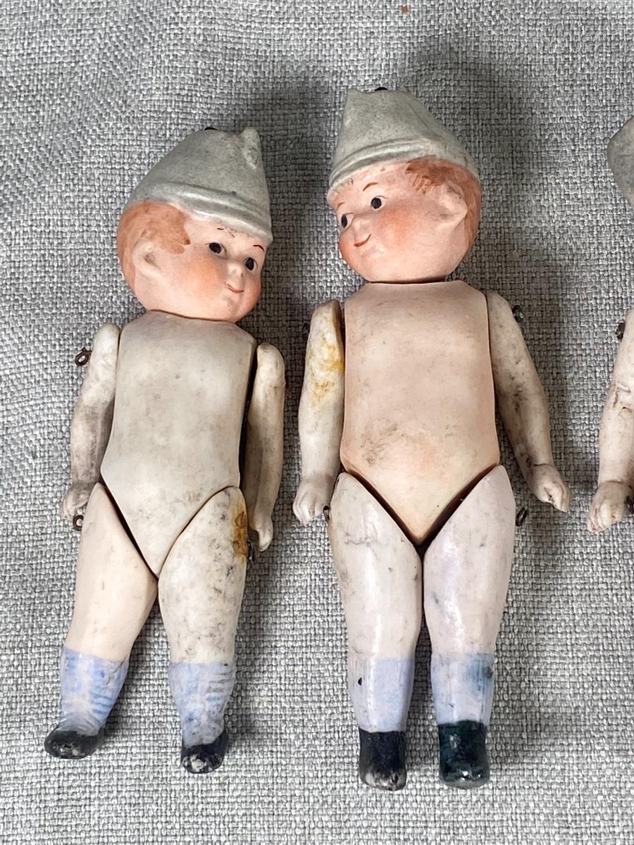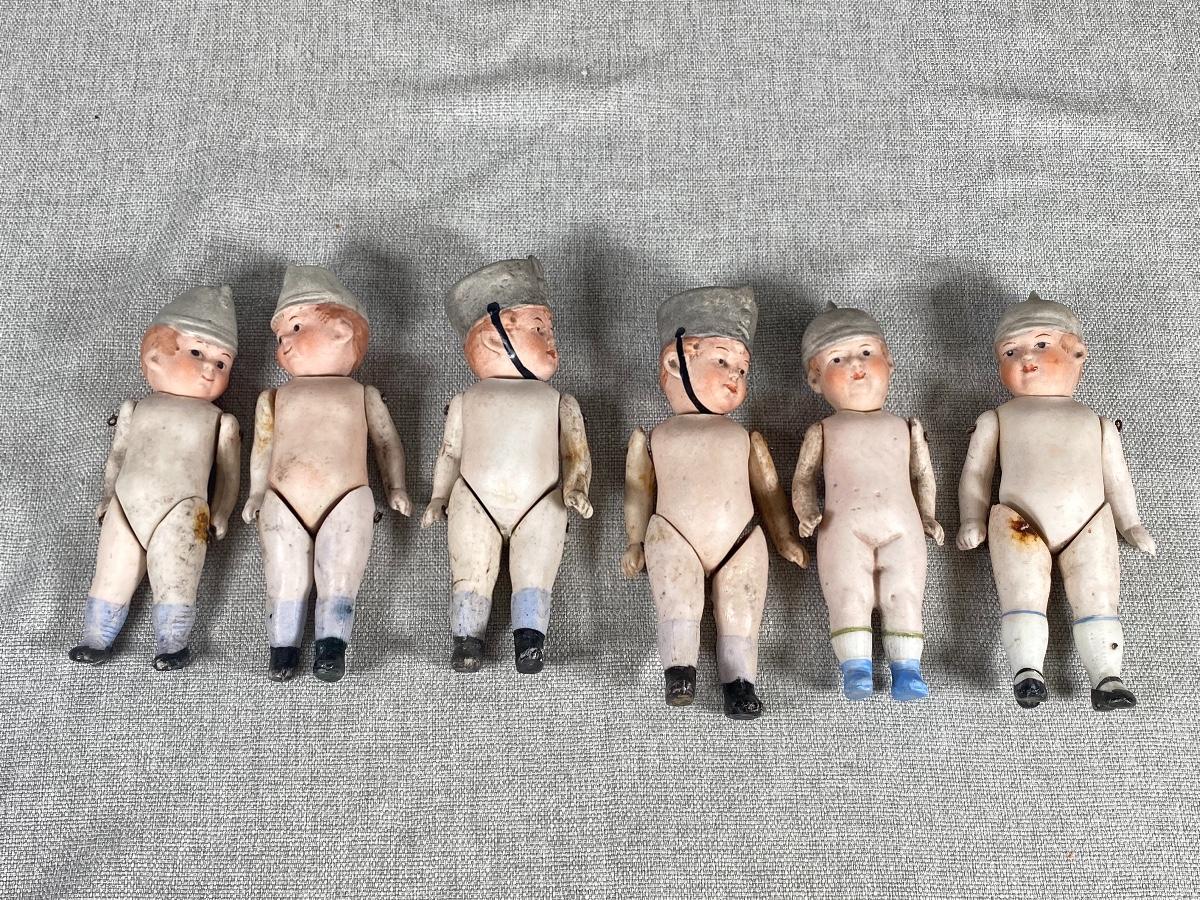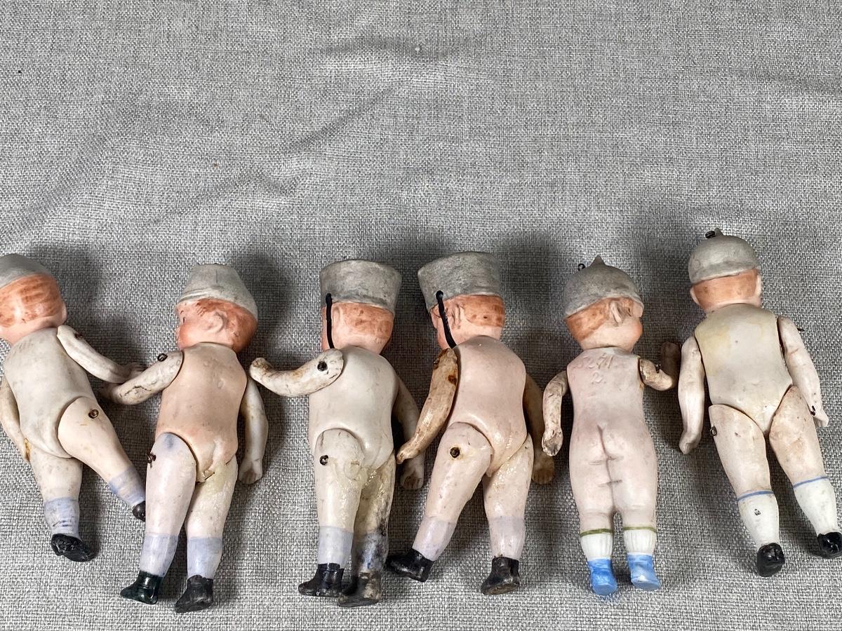 Set of 6 jointed bisque dollhouse dolls. All are about 4" size. Painted features, socks and shoes. All wearing hats. Signs of age. A couple are marked on the back.