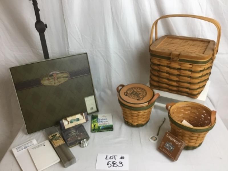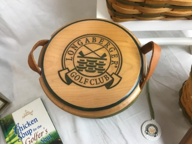 This gift lot has 3 Longaberger Baskets in various sizes ( 1 smaller basket has Golf Club Lid, plastic & fabric liners, 1 smaller basket has plastic liner only, 1 larger basket has hinged lid and plastic liner, 2 Tie Ons )