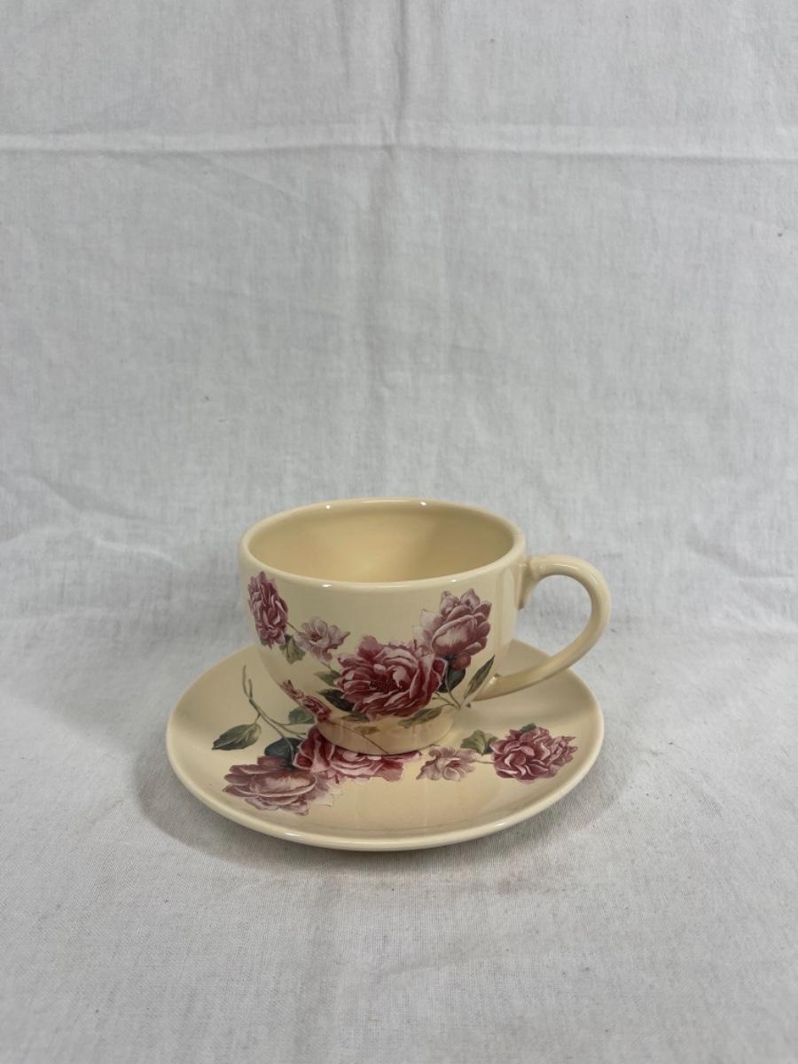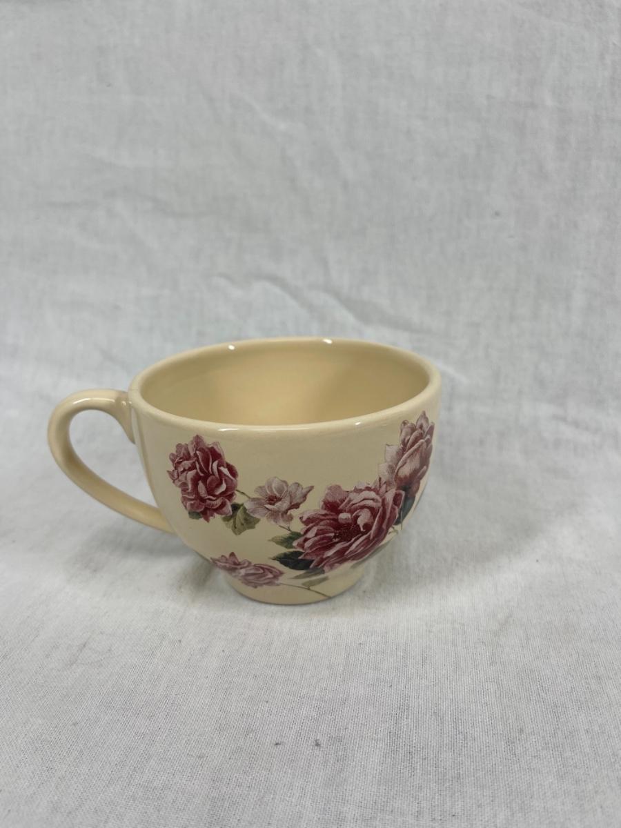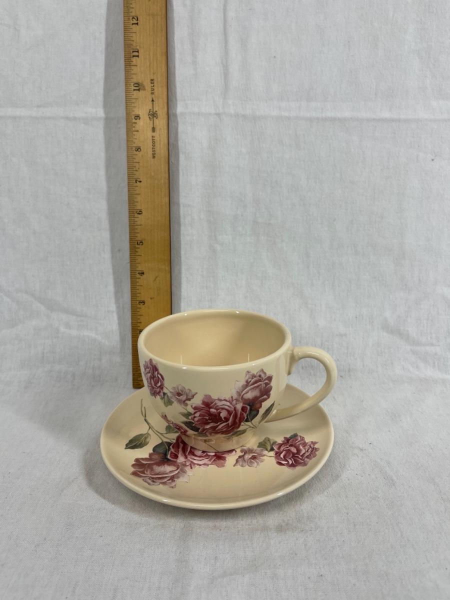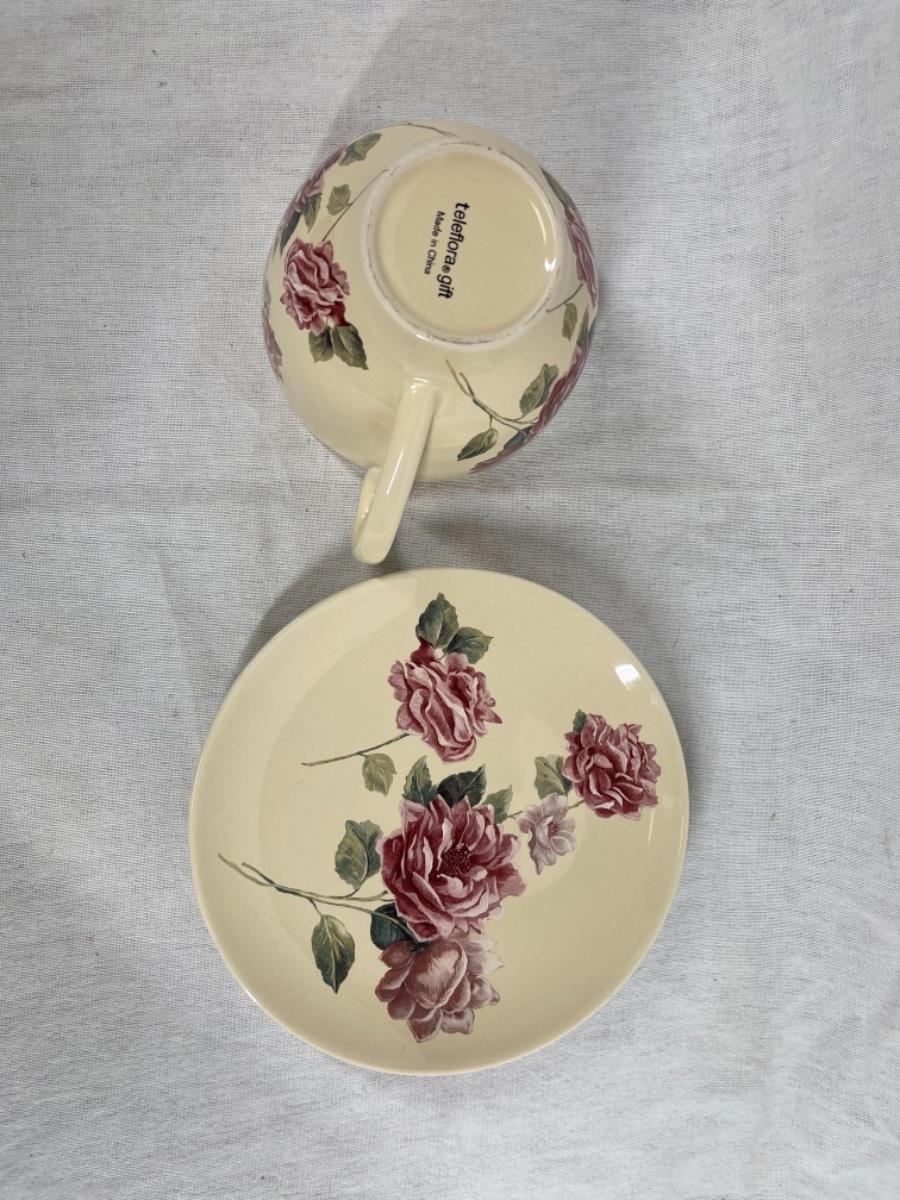 Off white with purple flowers teacup and saucer from Teleflora Gifts. Good condition.