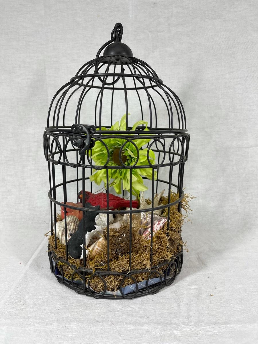 Black metal wire bird cage. Can be hung or shelf sitting. Currently has moss and fake birds in it, can be repurposed. About 14" size.