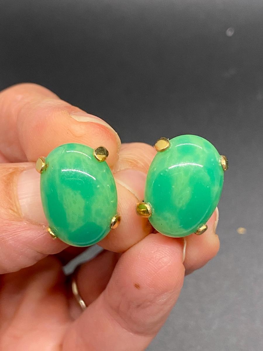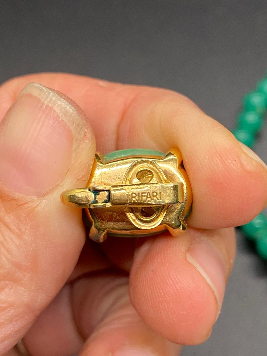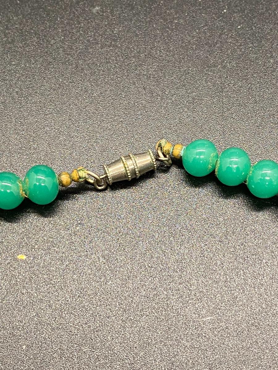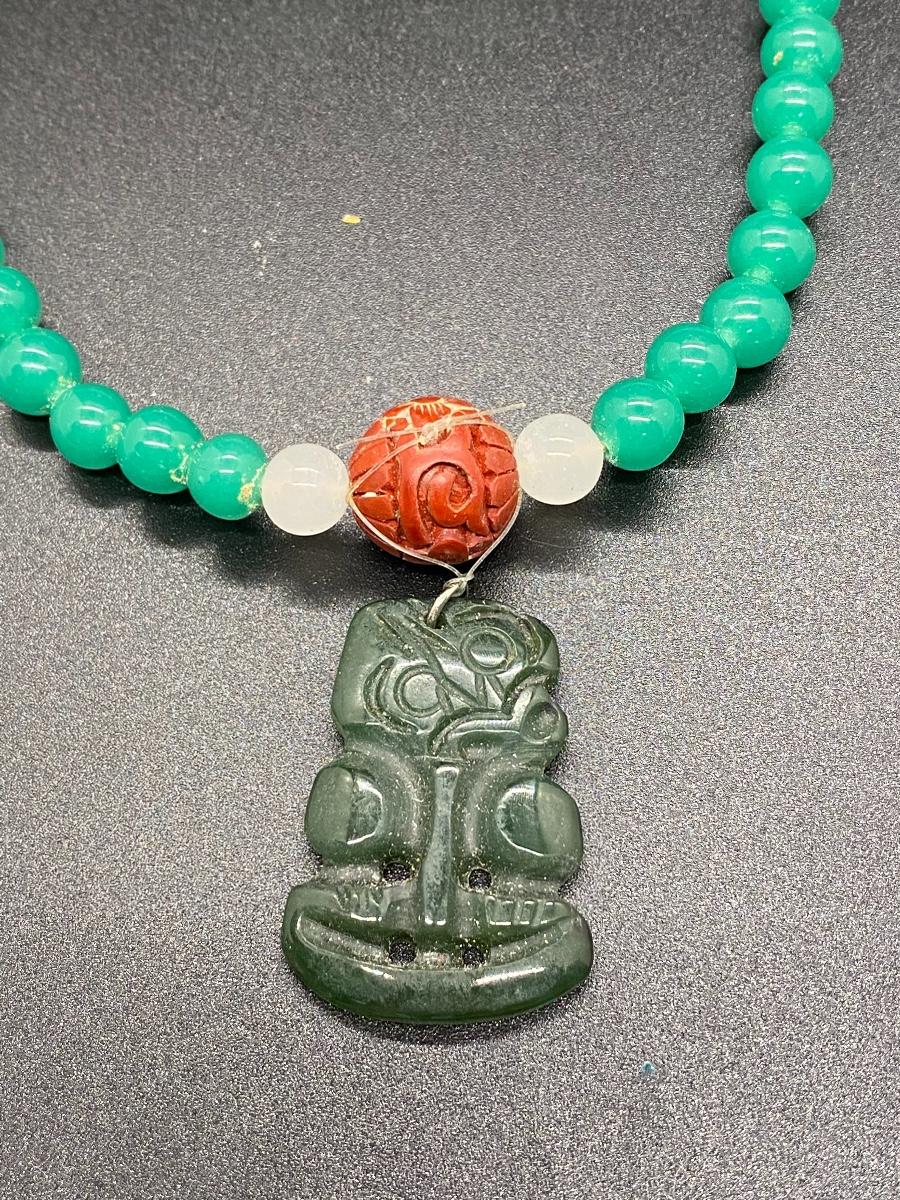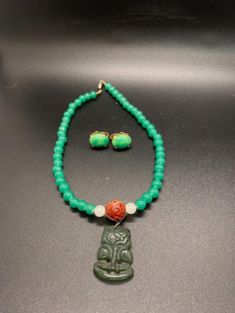 Vintage Beaded Jade Cinnabar Pendant Necklace & Earrings. The pendant was added on to the necklace, you can see the string used to attach it. The earrings are Trifari clip style, more then likely with faux stone.