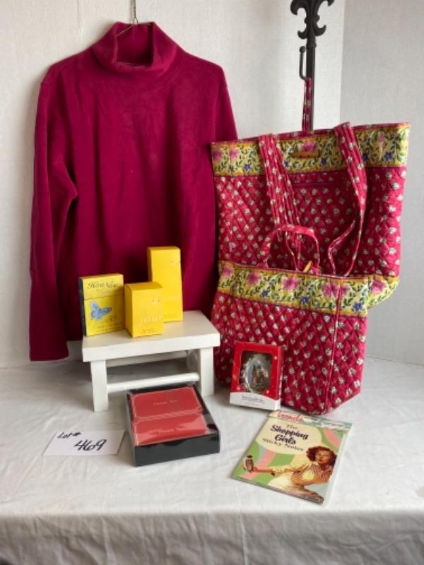 Maggie B handbags set , Mary Inglebrit Ornament, thank you cards, Jour perfume and shower gel from Mary Kay, cards, lands end fleece pullover size extra large