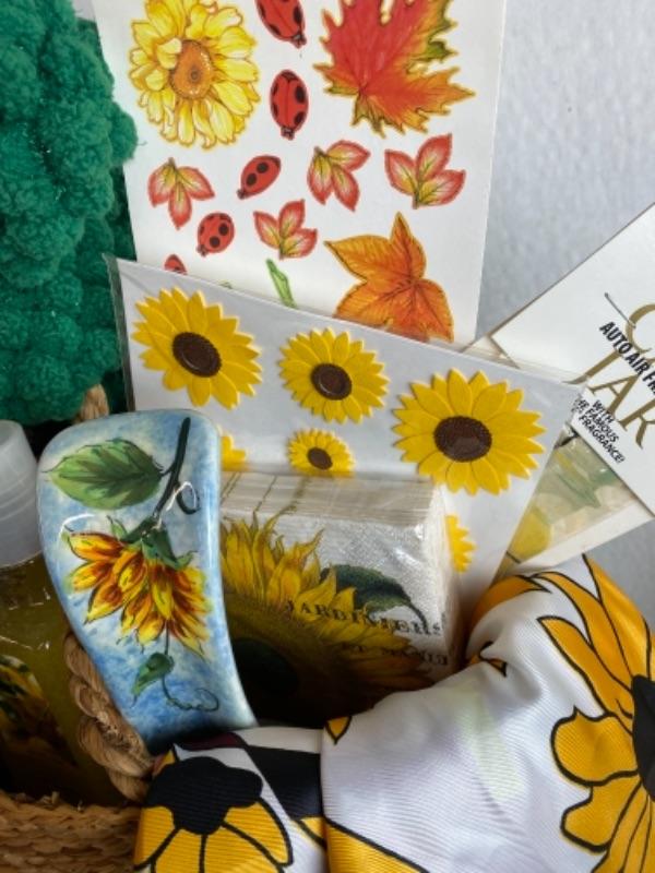 Sunflower gift basket lot with napkins, lotion, coasters, sunflower mirror, sunflower plate sunflower Maryland scarf, Pewter Stand, and much more