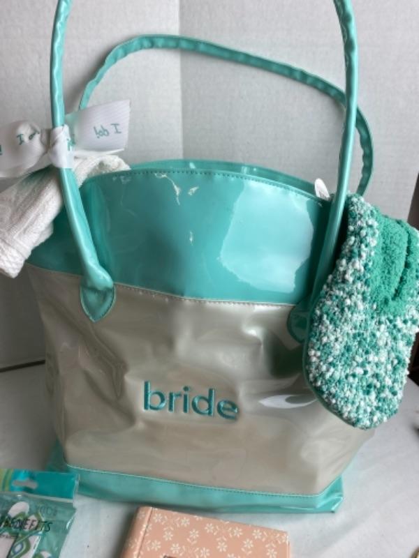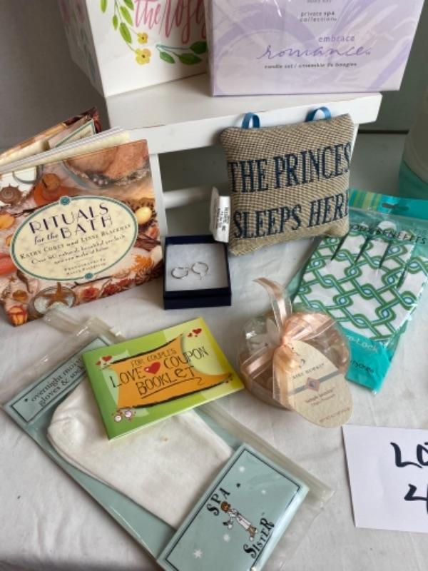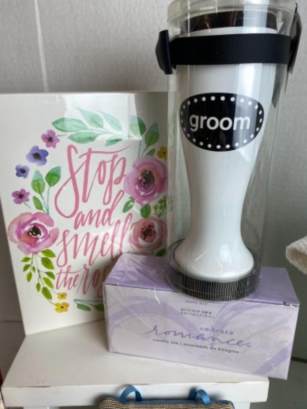 Brad gift bag with wedding planner, pillow, groom Pilsner cup , spa sister , sterling silver hoops , Mary Kay embrace romance candle set ,socks.