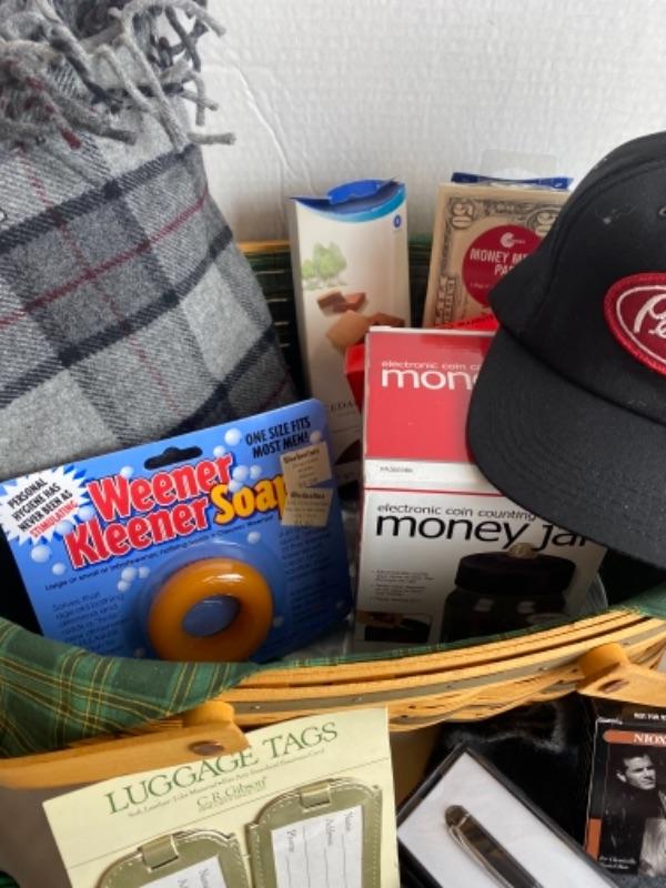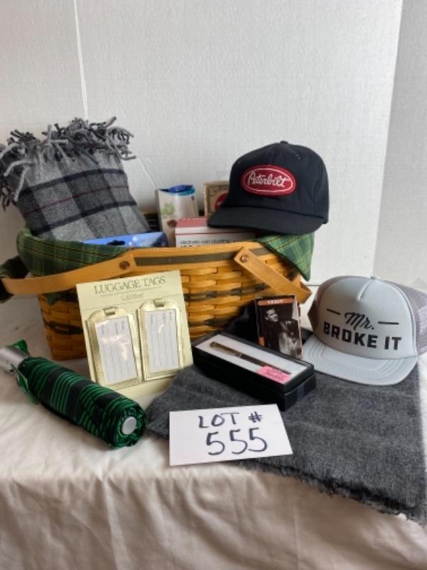 Longaberger Men’s gift basket lot with hats, ink pen, luggage tags, umbrella, will throw, money jar, and much more