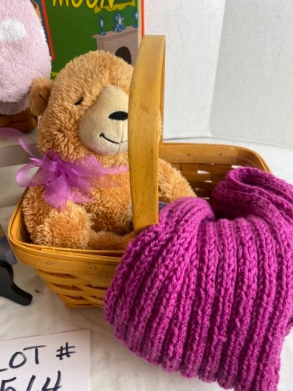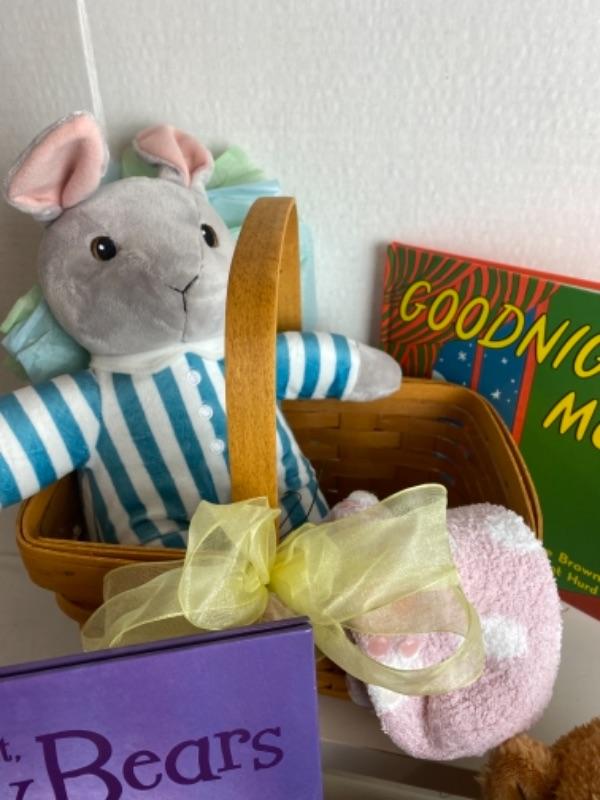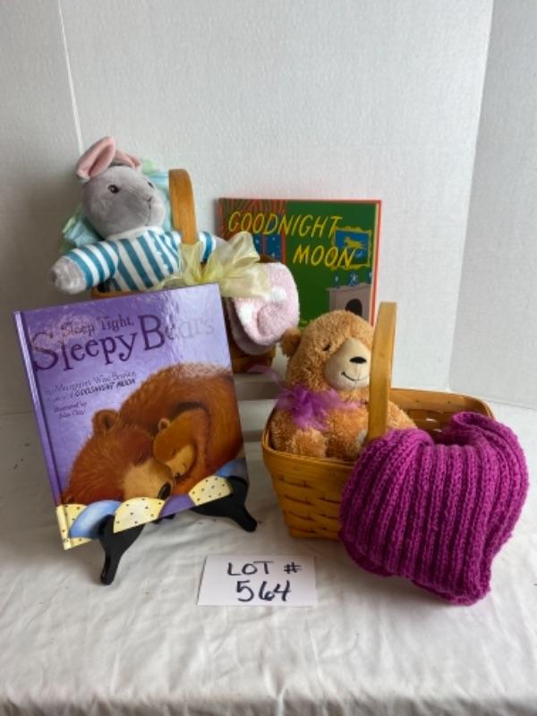 Longaberger baskets with bear and book and bunny with storybook comes with scarf and socks