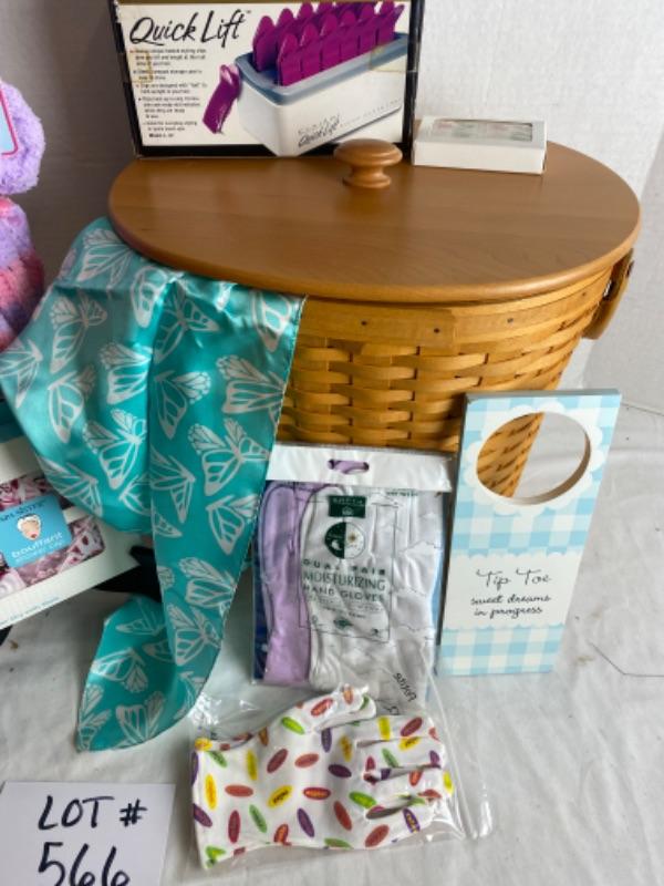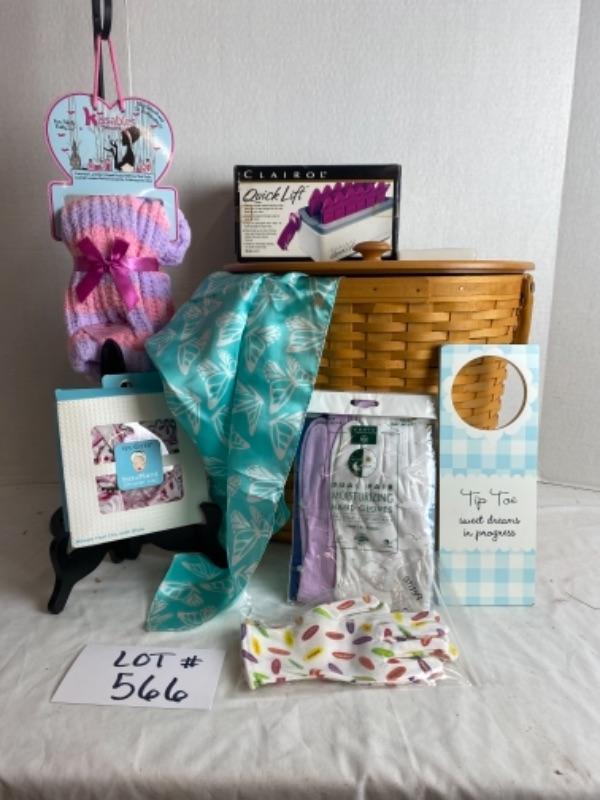 Longaberger Spa gift basket with socks lavender infused, butterfly scarf, shower cap, moisturizing hand gloves, sign to hang on your door that says tiptoe sweet dreams and progress, Clairol quick left heated styling clips And much more