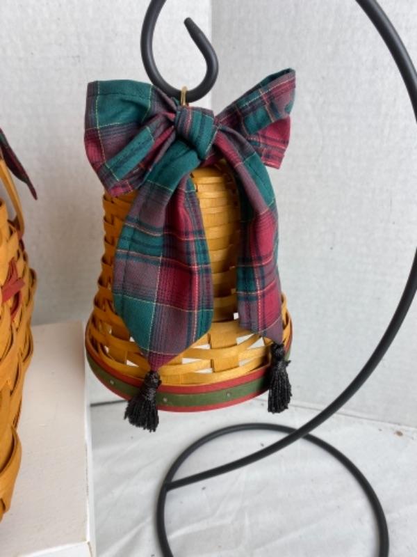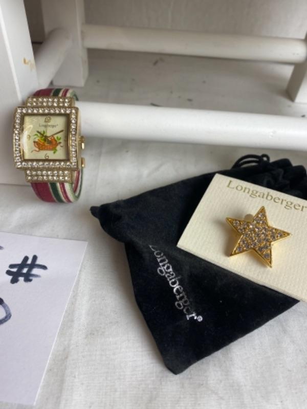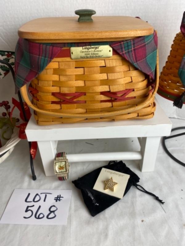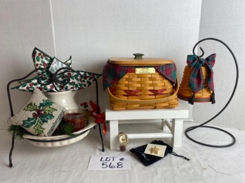 Longaberger Gift basket line with deck the halls 2000 edition basket, star pin, watch, oval quiche dish, milk pitcher ,pillow, pie stand and much more