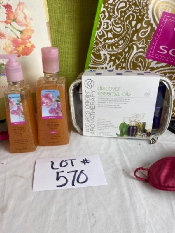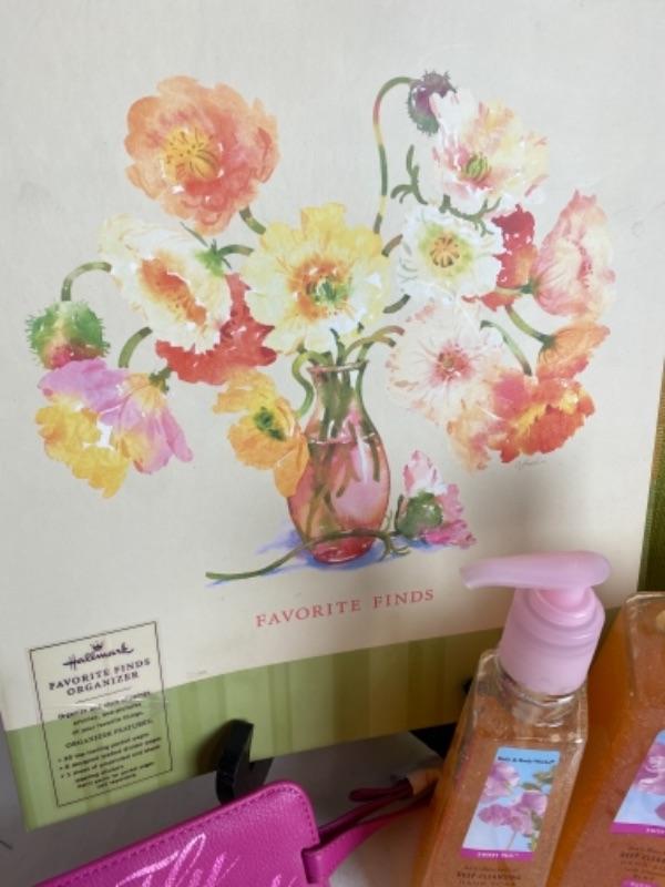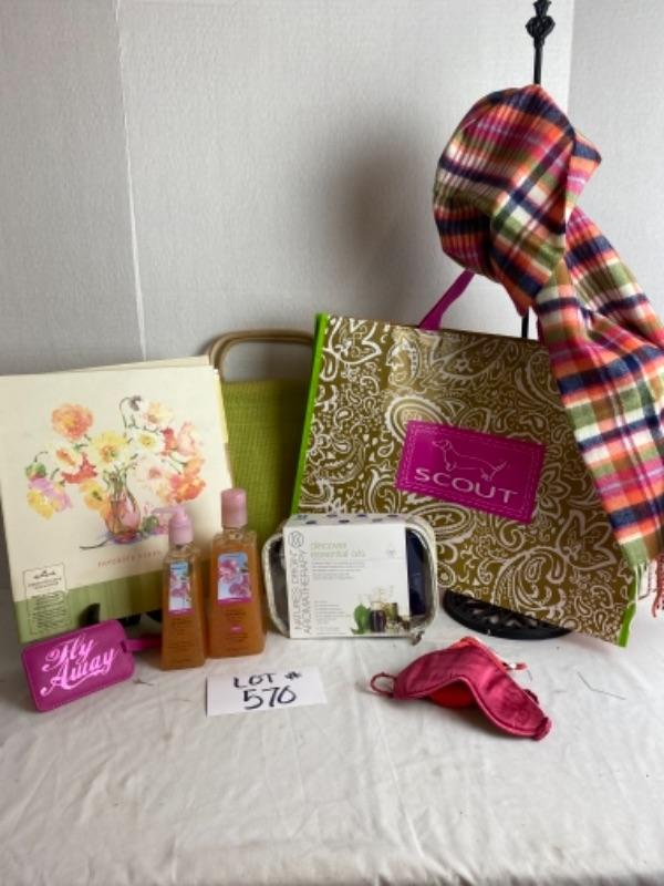 SCOUT giftbag set Hallmark favorite find organizer, Bath and body Works sweet pea hand soap and deep cleansing, essential oil’s, pastel plaid scarf and lots more