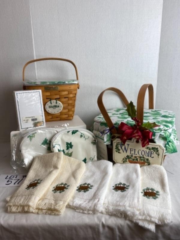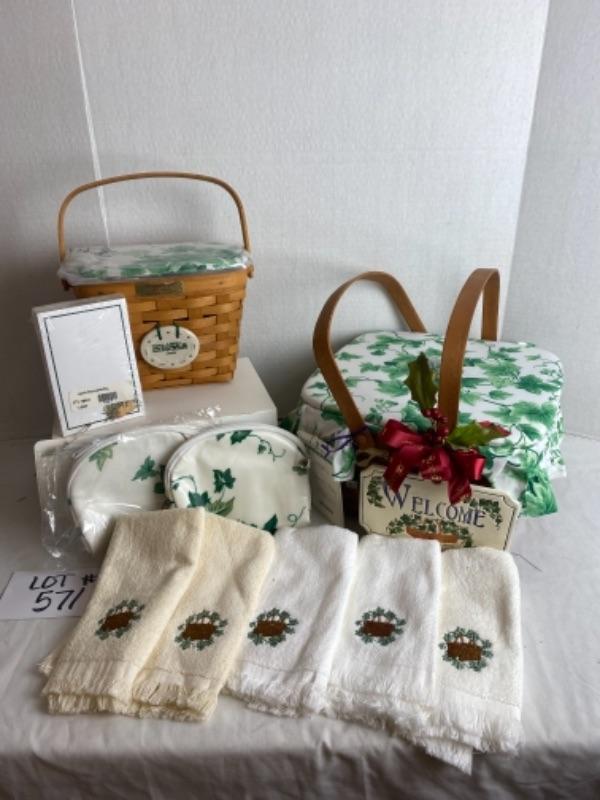 Longaberger Green and ivy gift basket lot cake basket with tour basket have upholstered wood tops, two cosmetic bags five terry cloth wash cloths, notepad set, pottery welcome sign