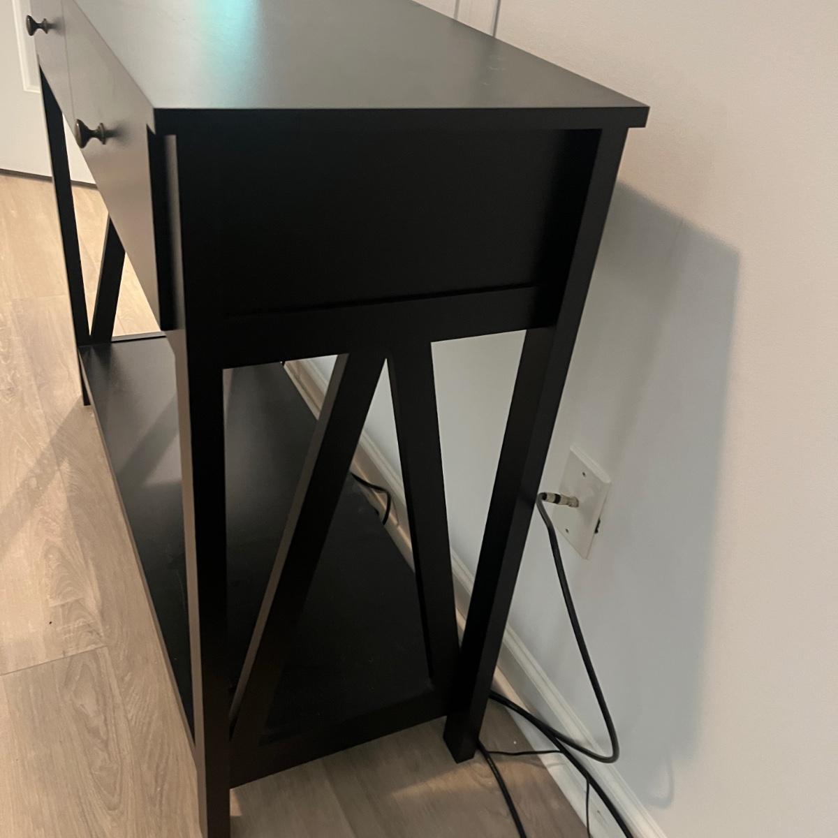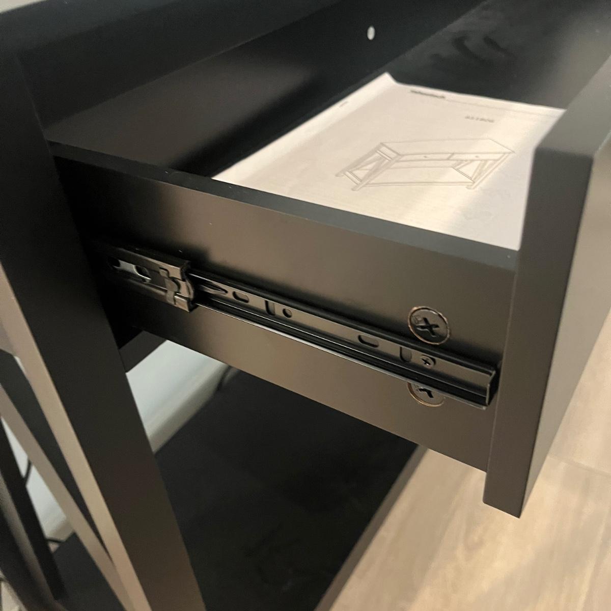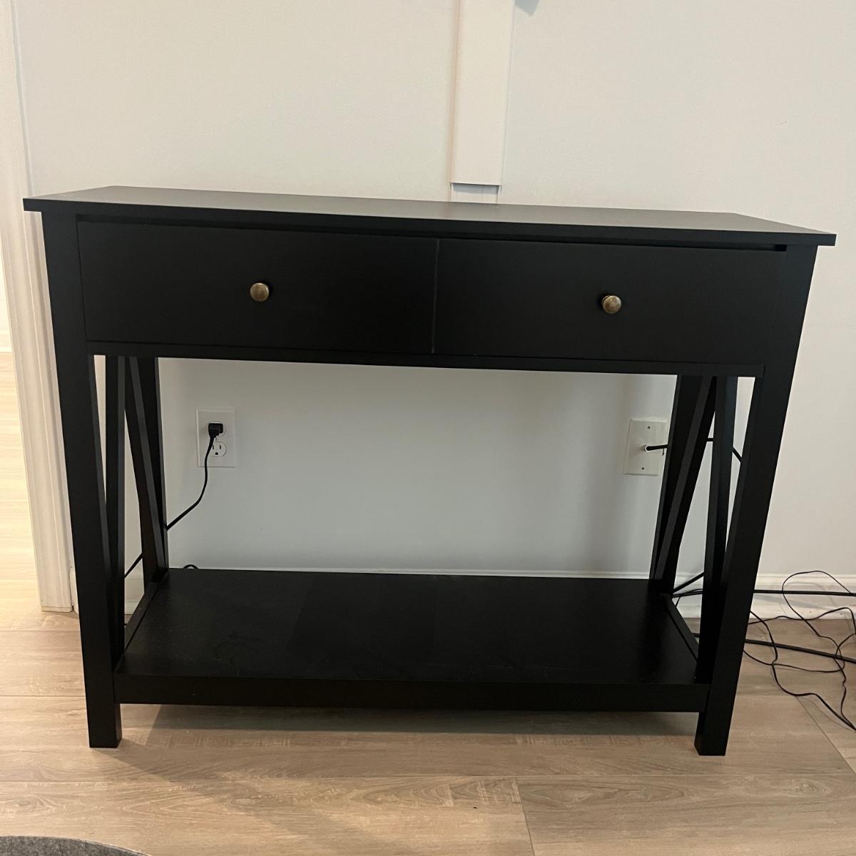 Lot includes a yaheetech console table with one drawer and a shelf underneath. Unit is black pressed wood and measures 39” x 14” x 31”H.