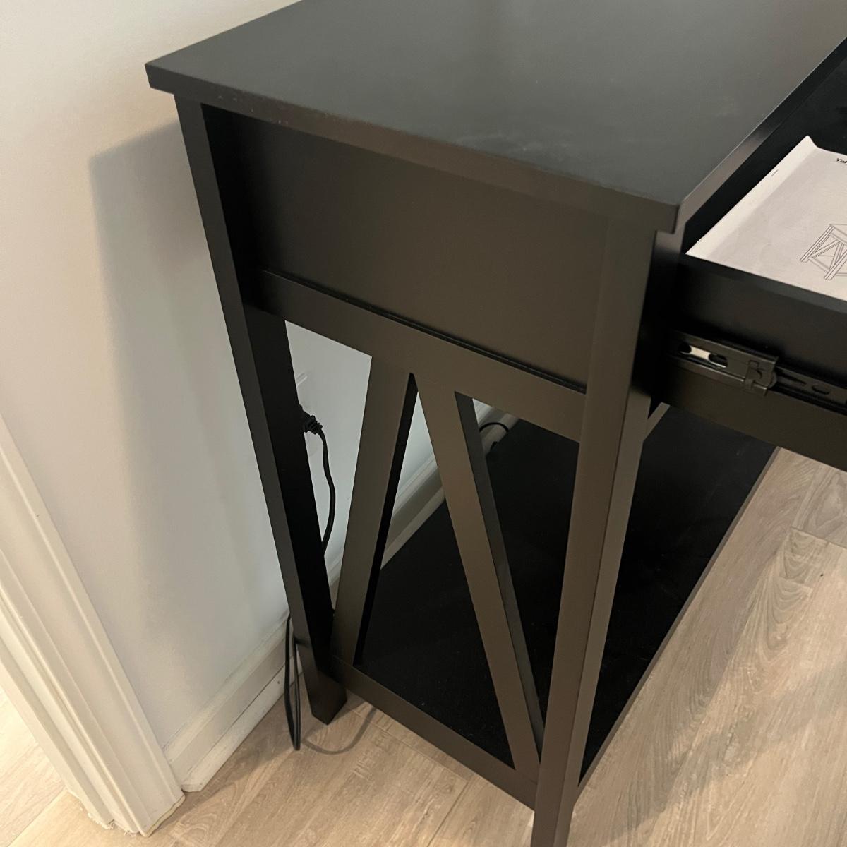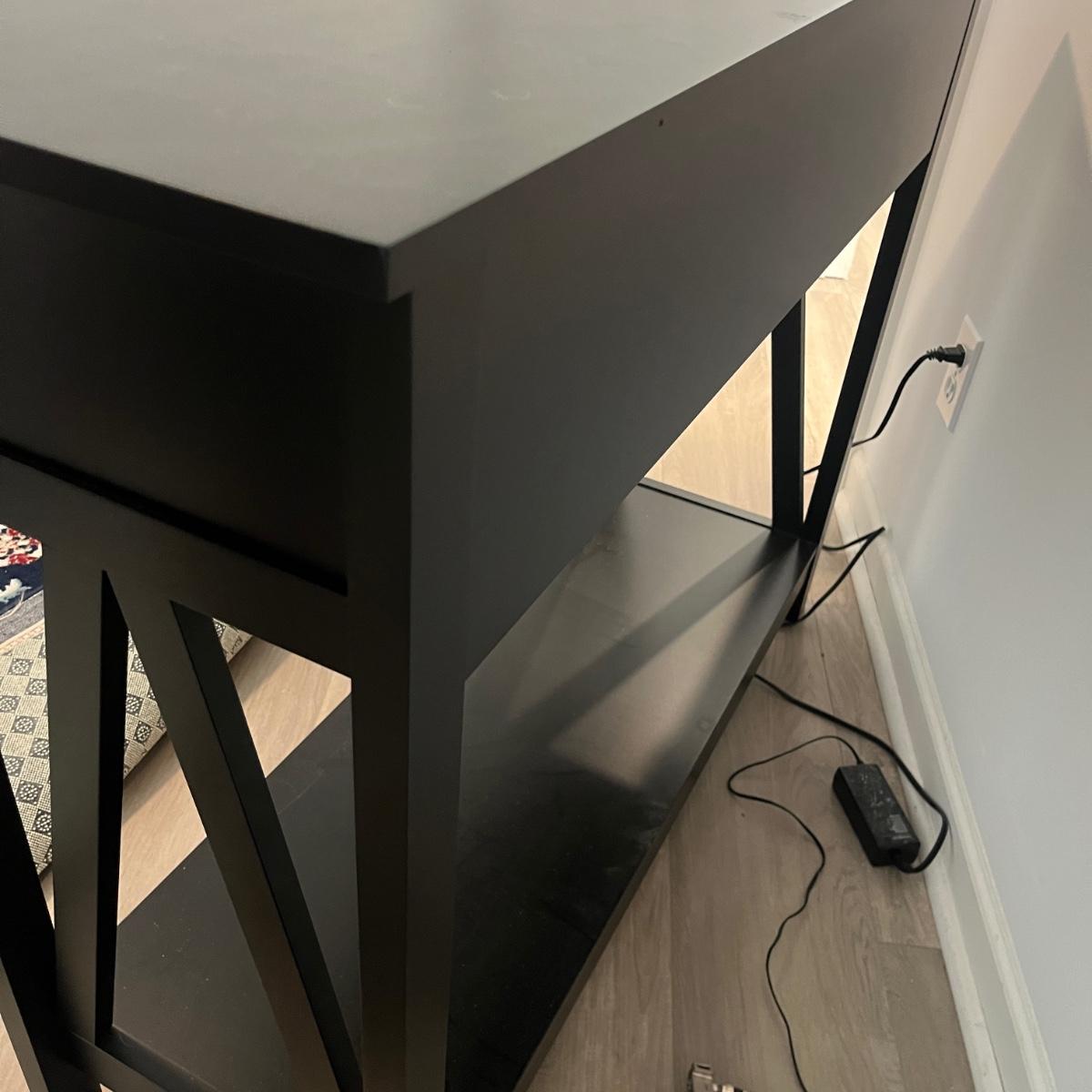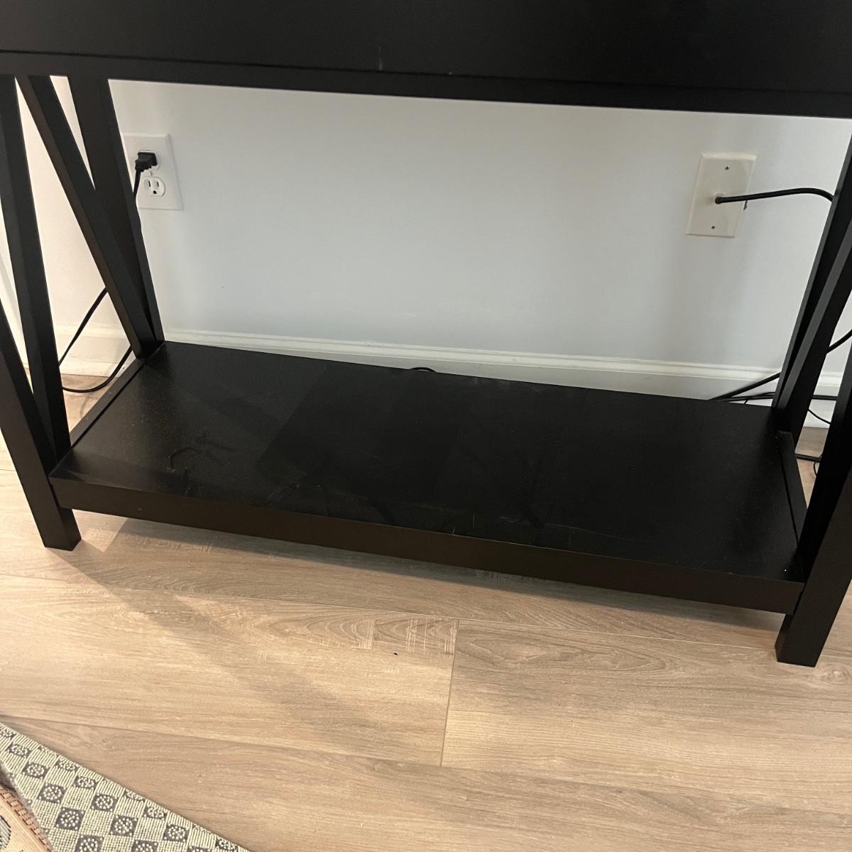 Lot includes a yaheetech console table with one drawer and a shelf underneath. Unit is black pressed wood and measures 39” x 14” x 31”H.