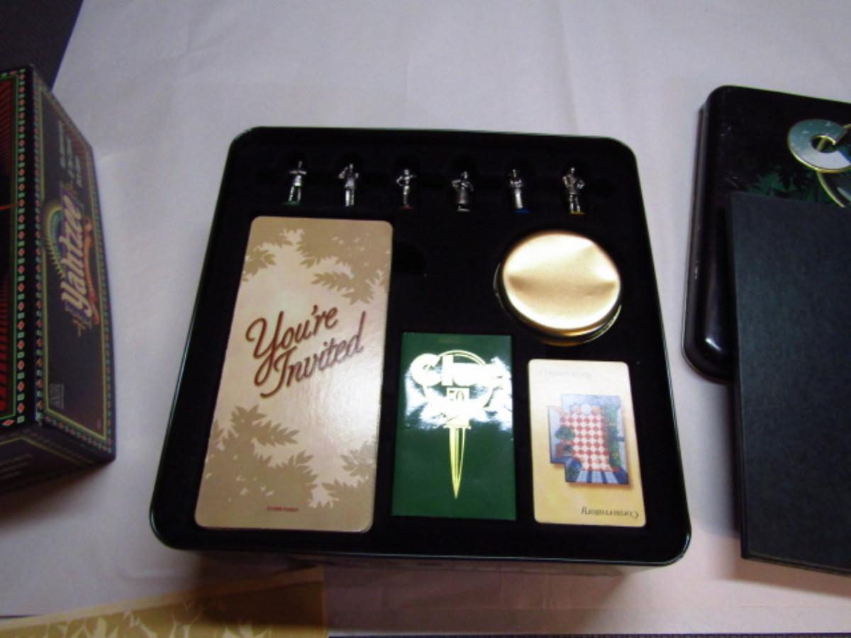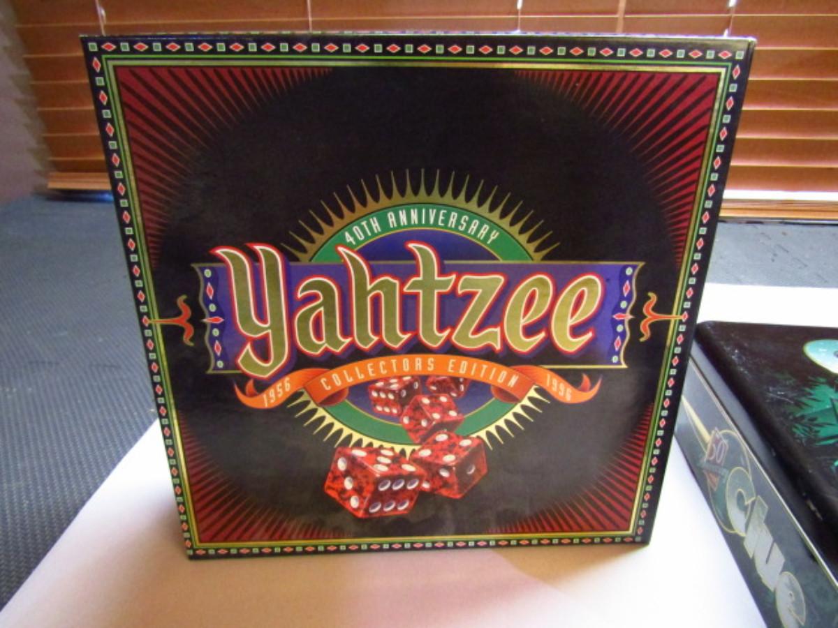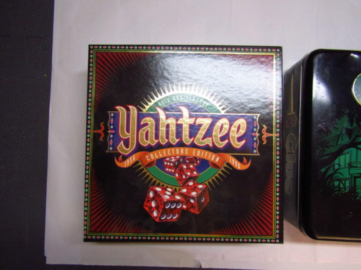Yahtzee and Clue Boxed Games- Anniversary Editions (G). Yahtzee 40th Anniversary Collector's Edition is in cardboard box and appears to contain all pieces. Clue 50th Anniversary Edition is a numbered set in metal box and appears to be complete except for one pencil.