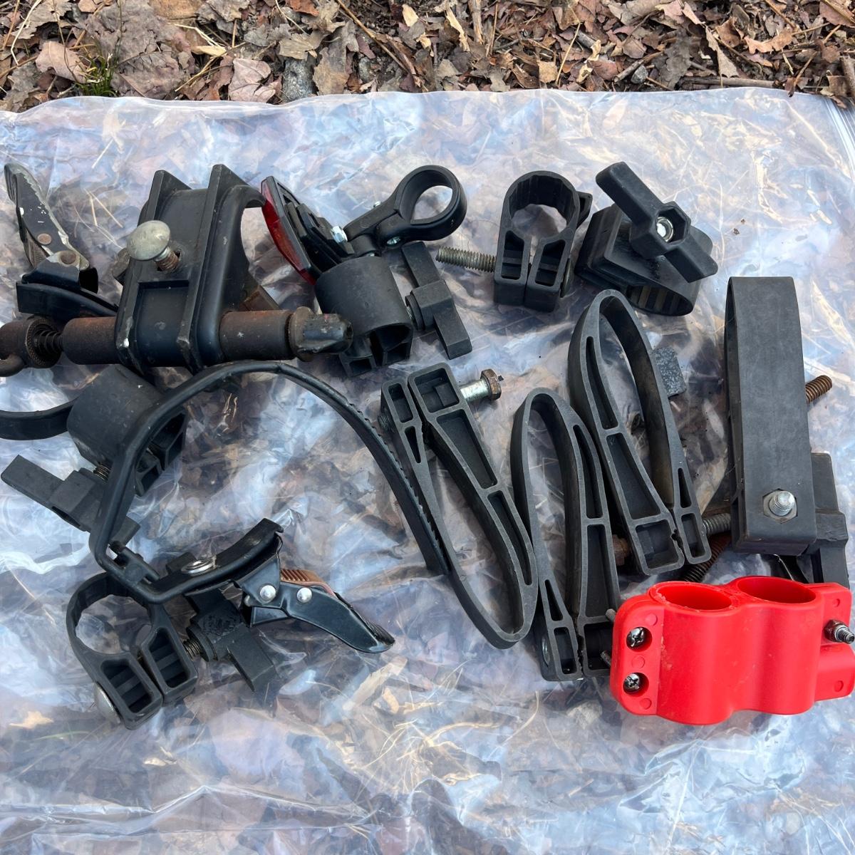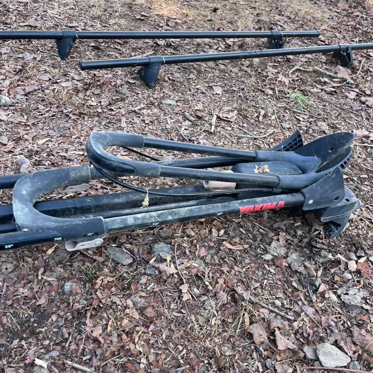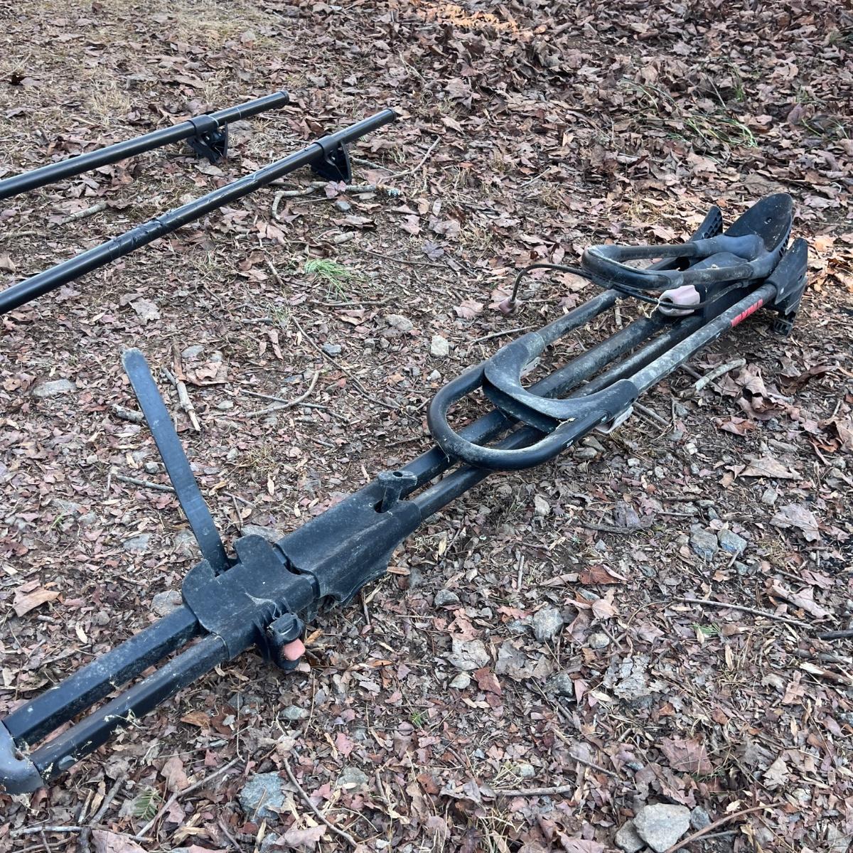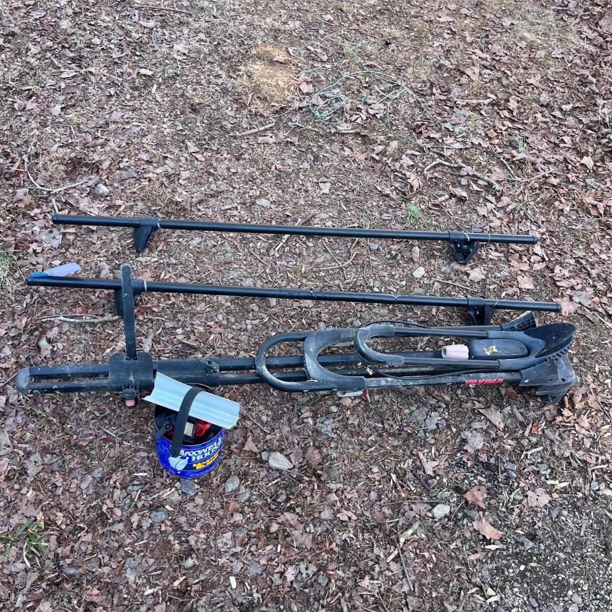 Lot includes Two 56” long racks, Yakima Bike Rack and a bag of odds and ends.