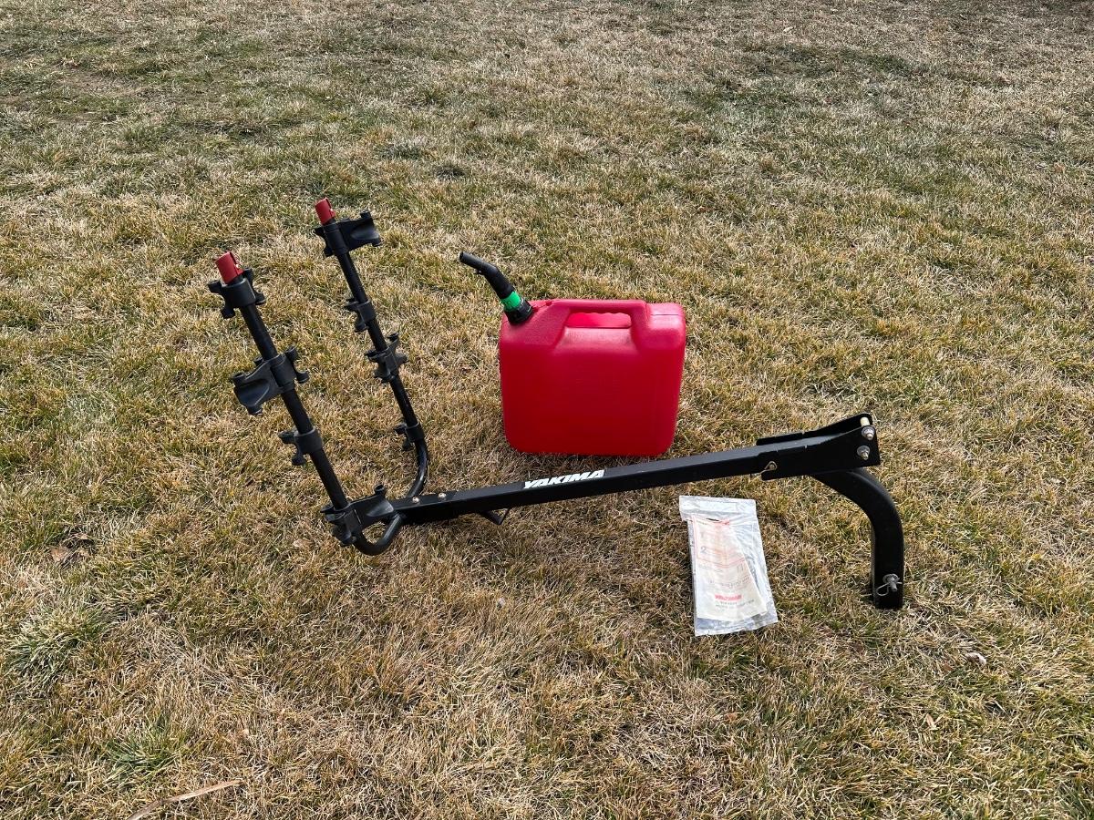 YAKIMA TRAILER HITCH MOUNT BIKE RACK AND GAS CONTAINER