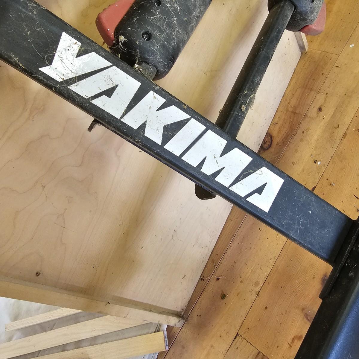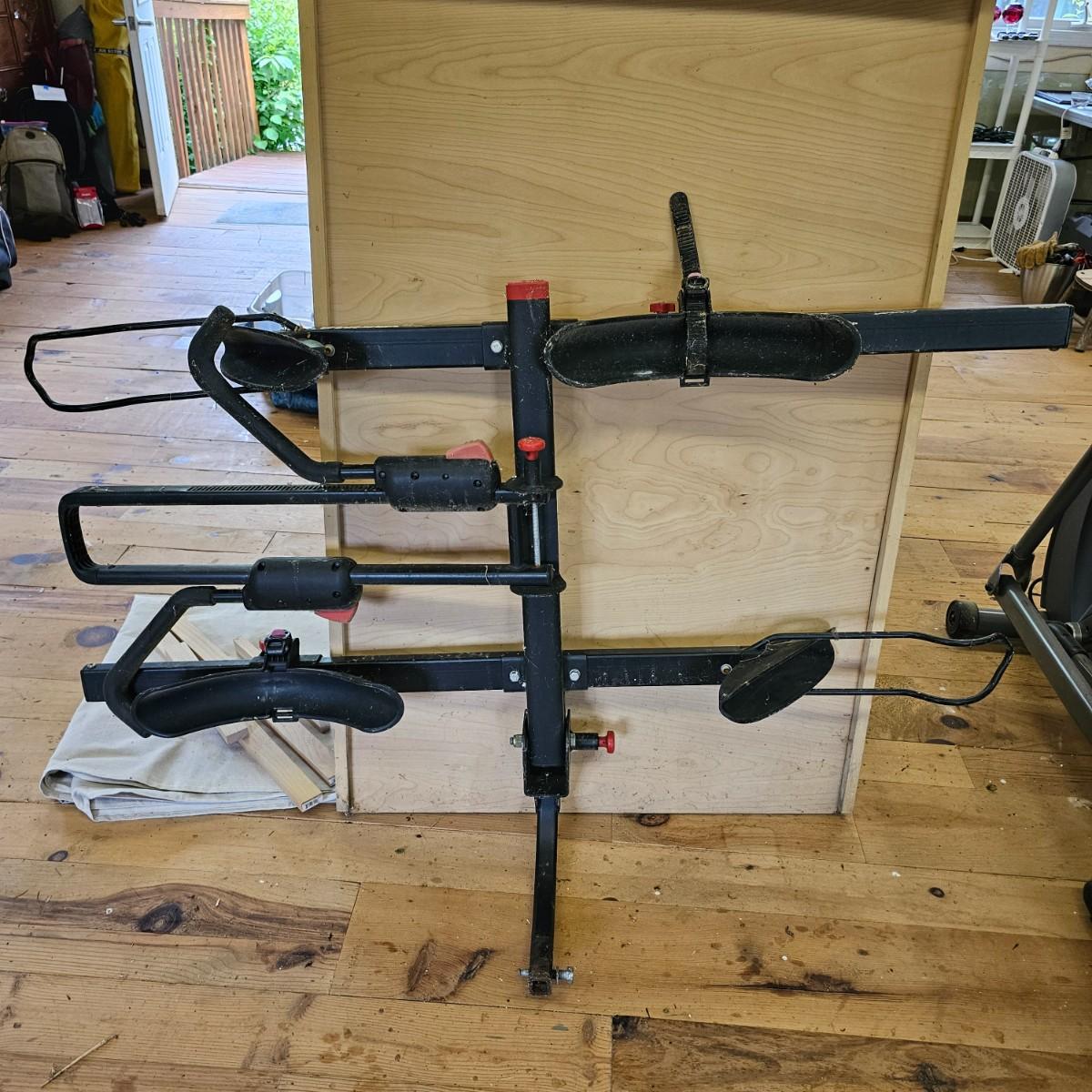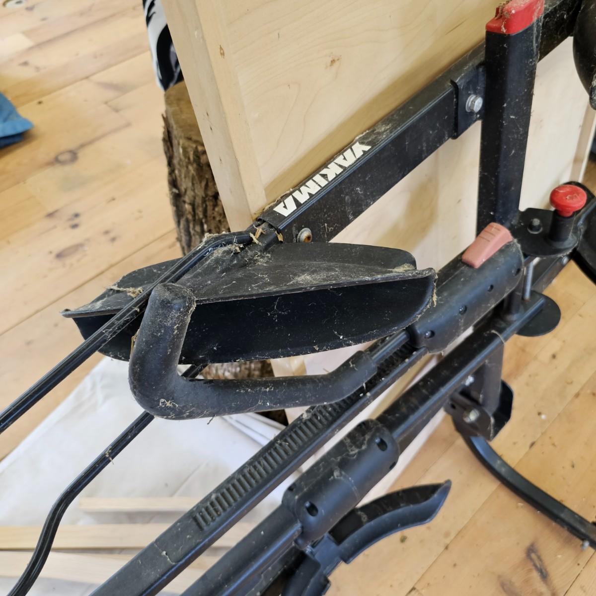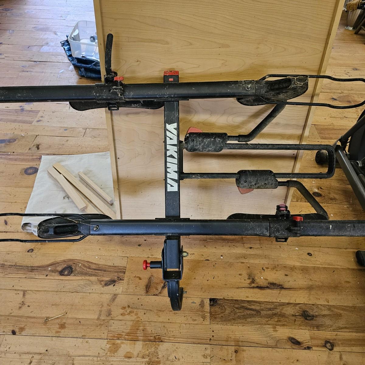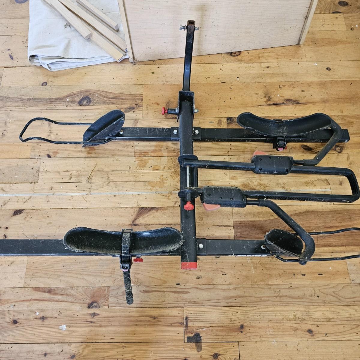 A rear hitch style Yakima car carrier for two bicycles. Receiver post is 1.25" sq. Bicycles sit opposing each other, one each direction. Swing up frame/handlebar support and wheel pockets. One pocket missing strap. Unit measures 54" x 35". See photos for details. Local pickup only.