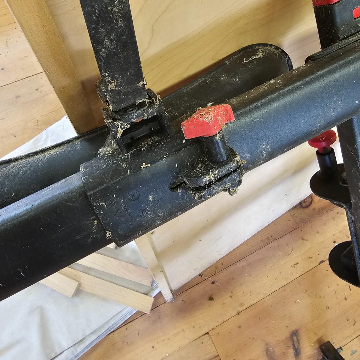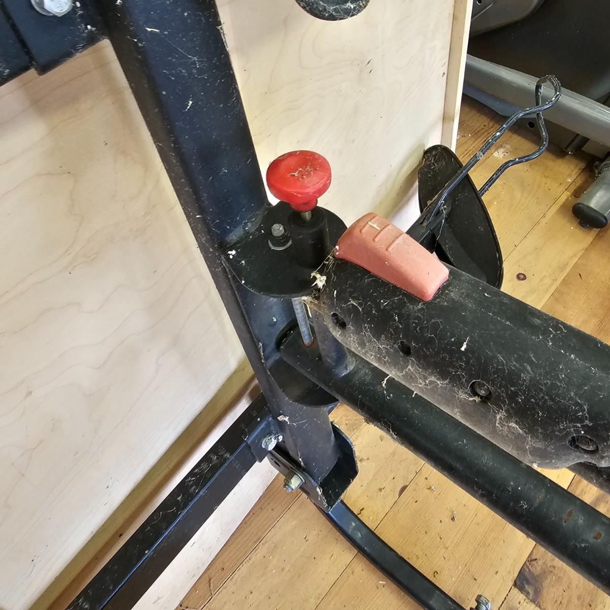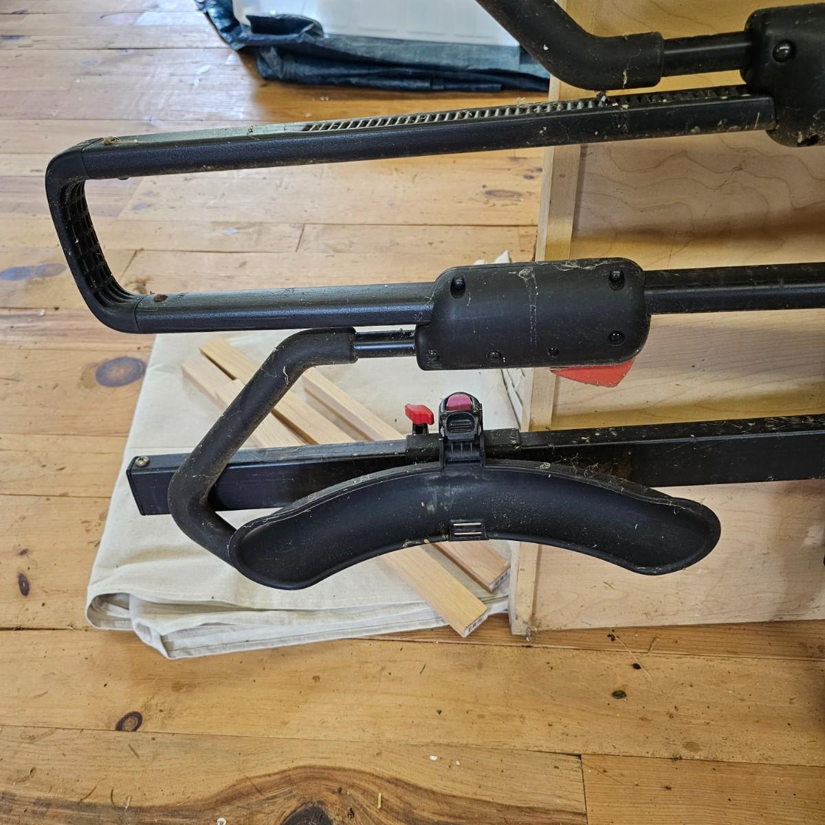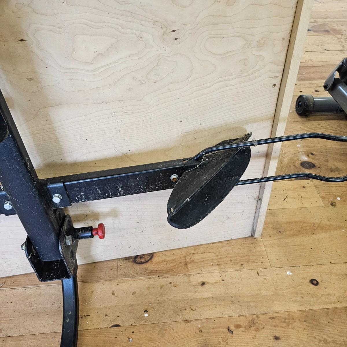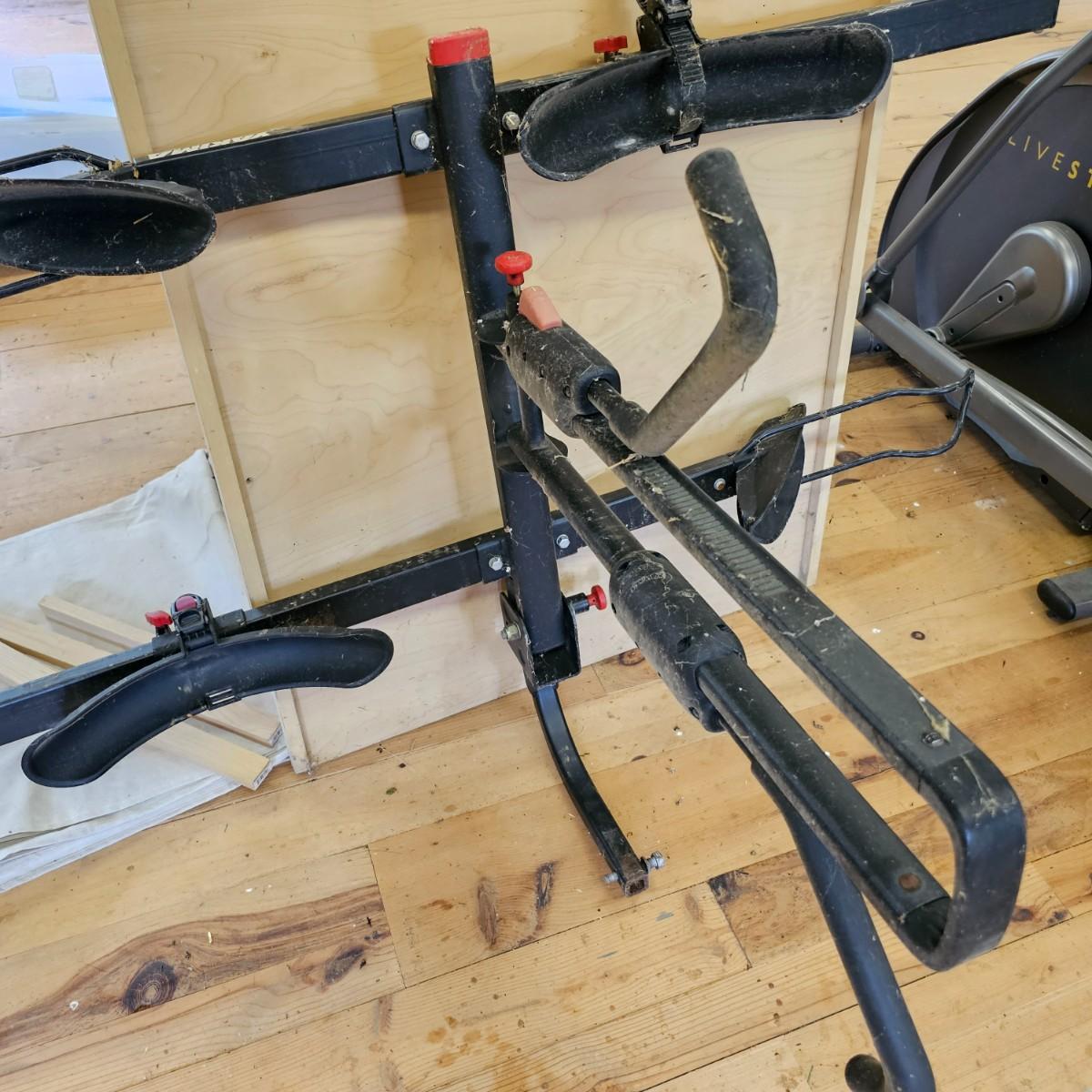 A rear hitch style Yakima car carrier for two bicycles. Receiver post is 1.25" sq. Bicycles sit opposing each other, one each direction. Swing up frame/handlebar support and wheel pockets. One pocket missing strap. Unit measures 54" x 35". See photos for details. Local pickup only.