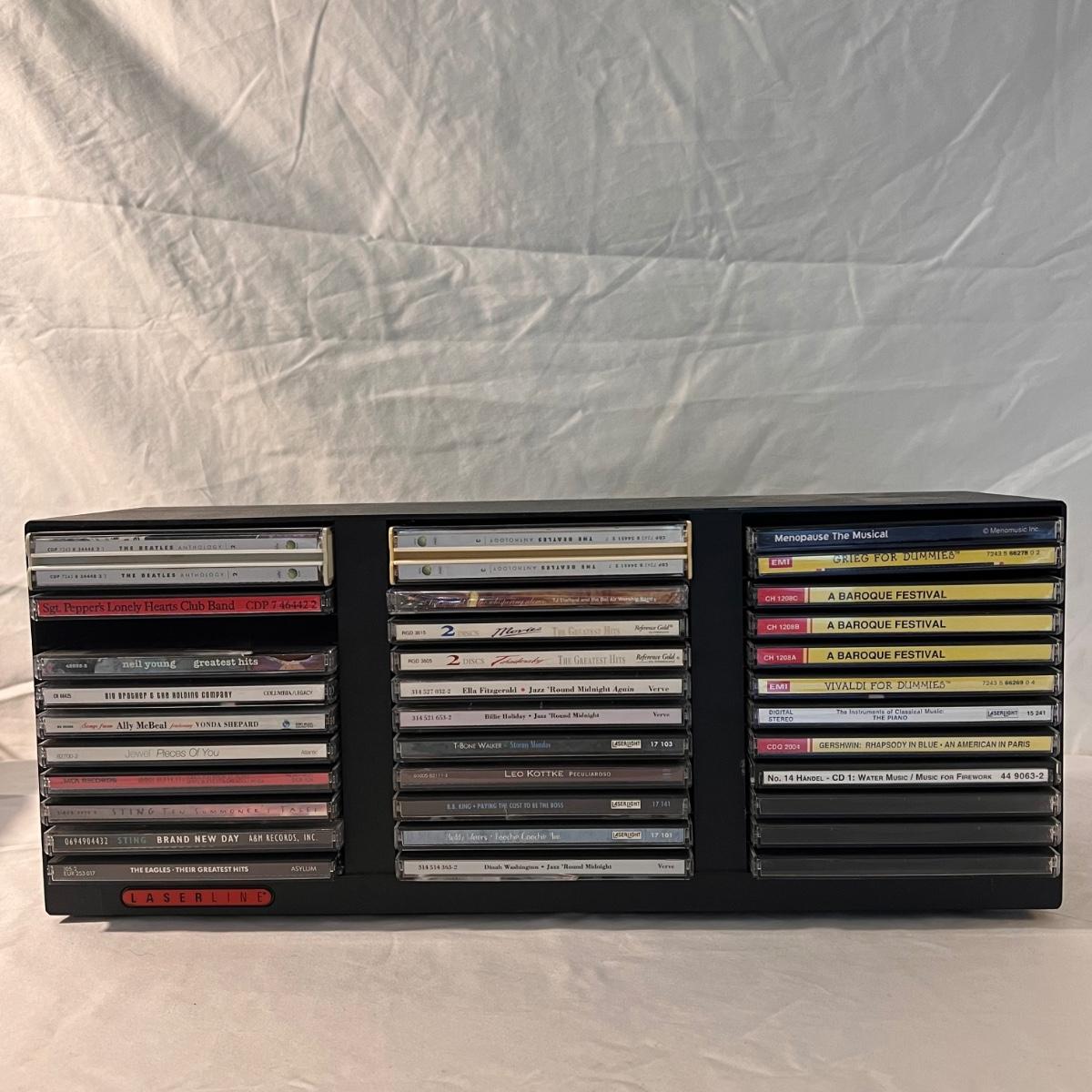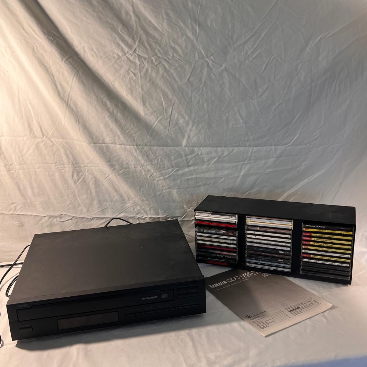 This lot includes a Yamaha Compact Disc Player with manual, and a Laser Line CD holder with a handful of CDs. The CDs include a mix of The Beatles, Ella Fitzgerald, Billie Holiday, Jimmie Buffett, and more. The CD holder measures 17” x 5”x 7”H . The Disc Player measures 17” x 15” x 4”H and it powered on when plugged in. Shipping available.
