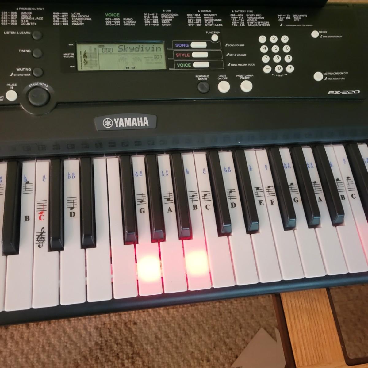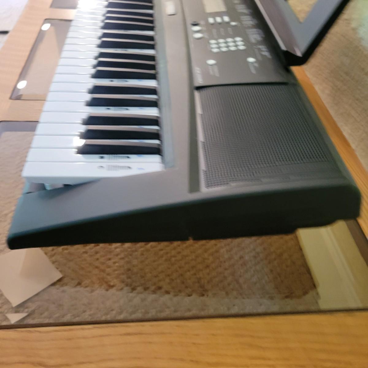 A Yamaha digital piano that powered on when plugged in. This electric piano feature keys that light up for easy learning, an assortment of demos, styles and assorted instruments. Included is a song book. This item measures approximately 37" x 14" x 11 5"H. Shipping available