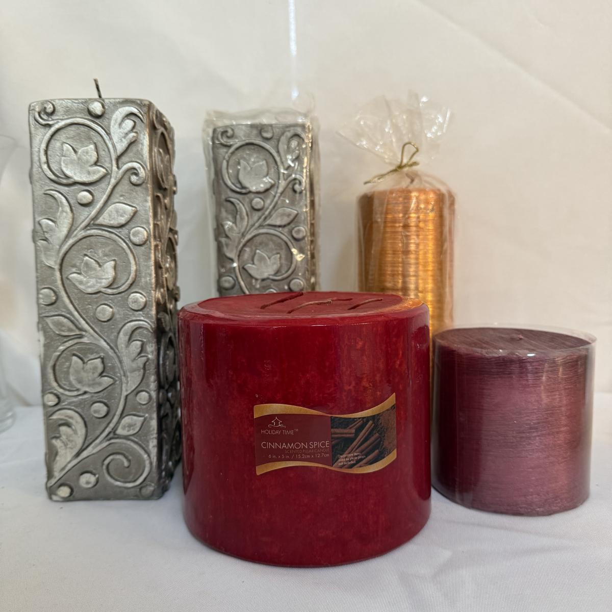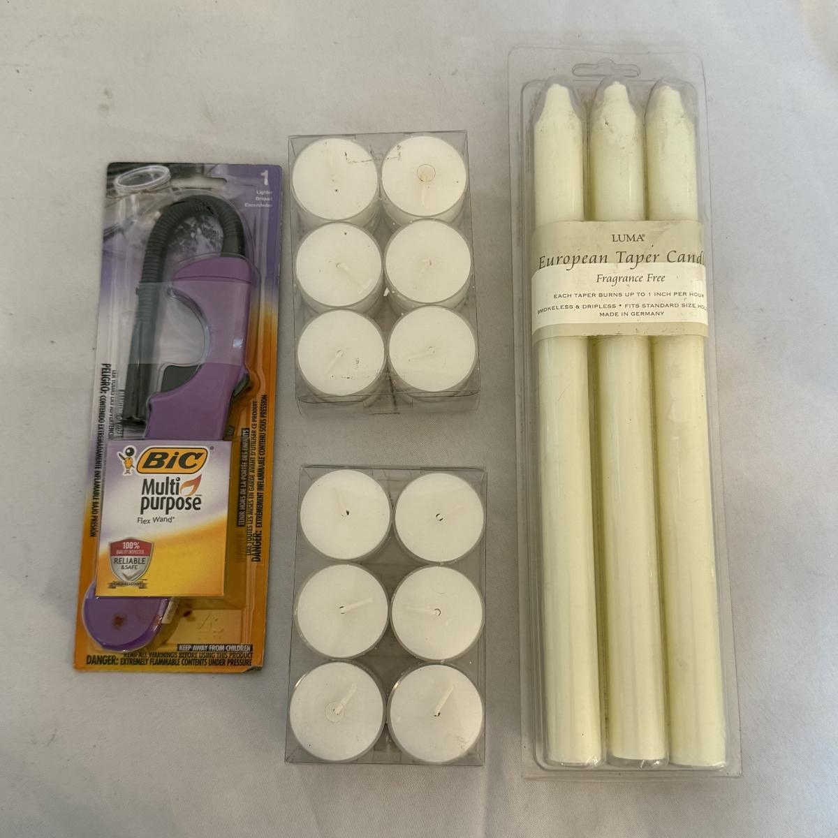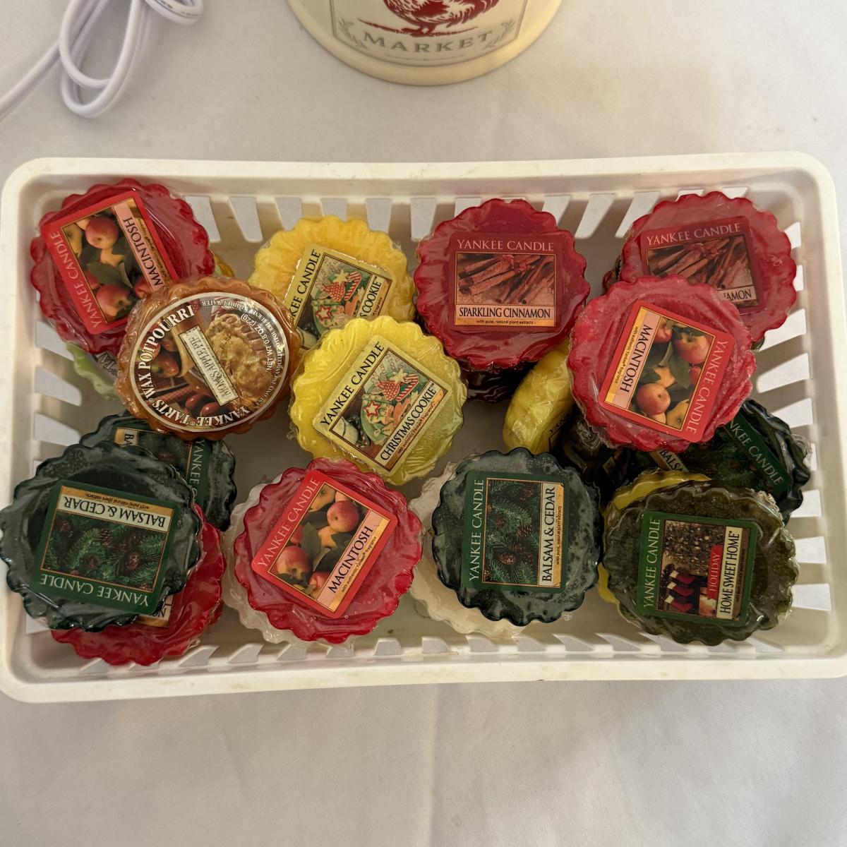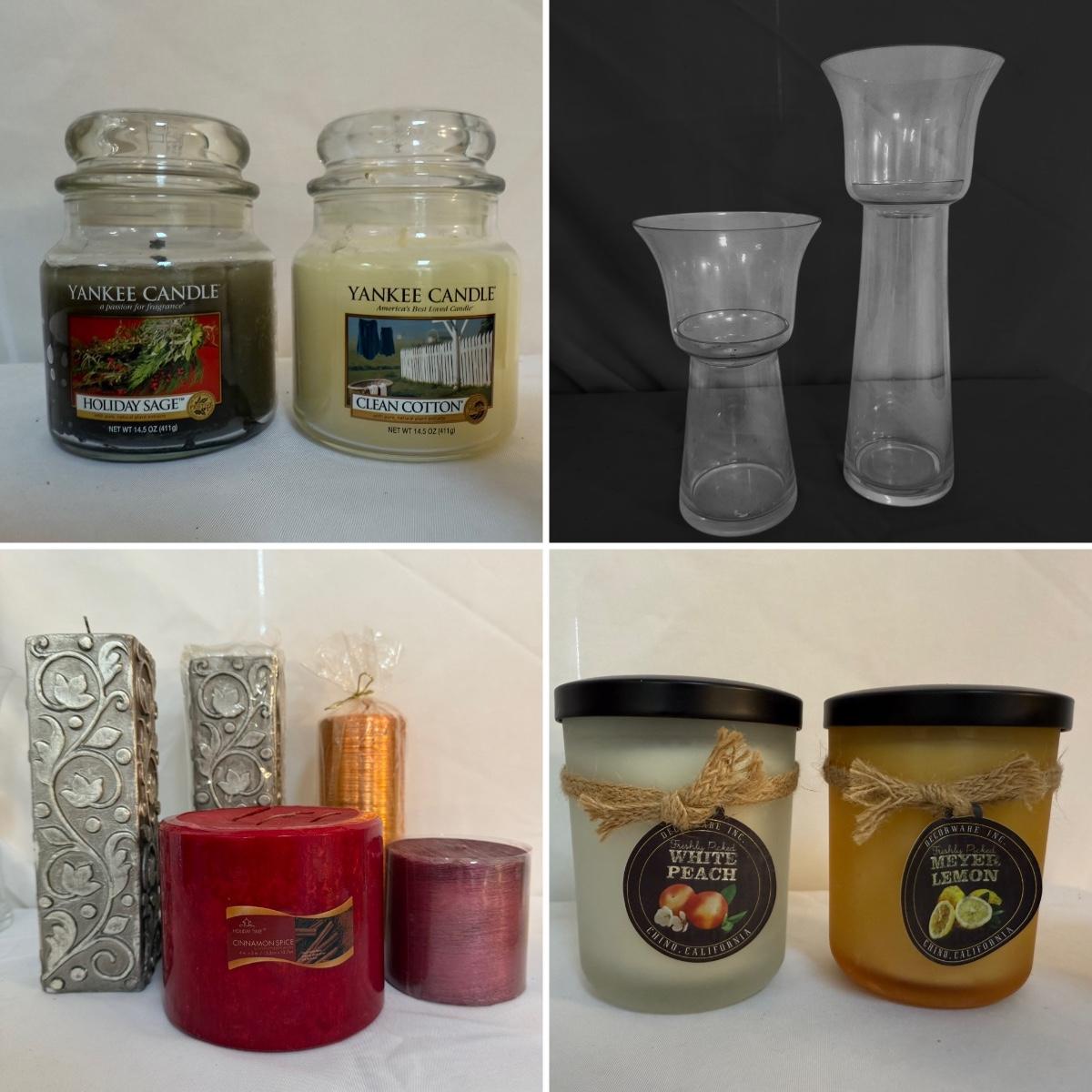 This large collection of candles and candle decor includes five jarred candles from Yankee Candle, Bath & Body Works, and Decorware Inc., five more large candles, plus a package of Luma European taper candles and two 12-packs of tea lights, and 30 Yankee Candle wax melt tarts. Electric wax warmer powered on when plugged in. Also included are a variety of glass candle holders, decorative glass gems, and a Bic Flex Wand lighter. For reference, the largest glass candle holder holding the copper colored candle measures 8”D x 15.75”H.