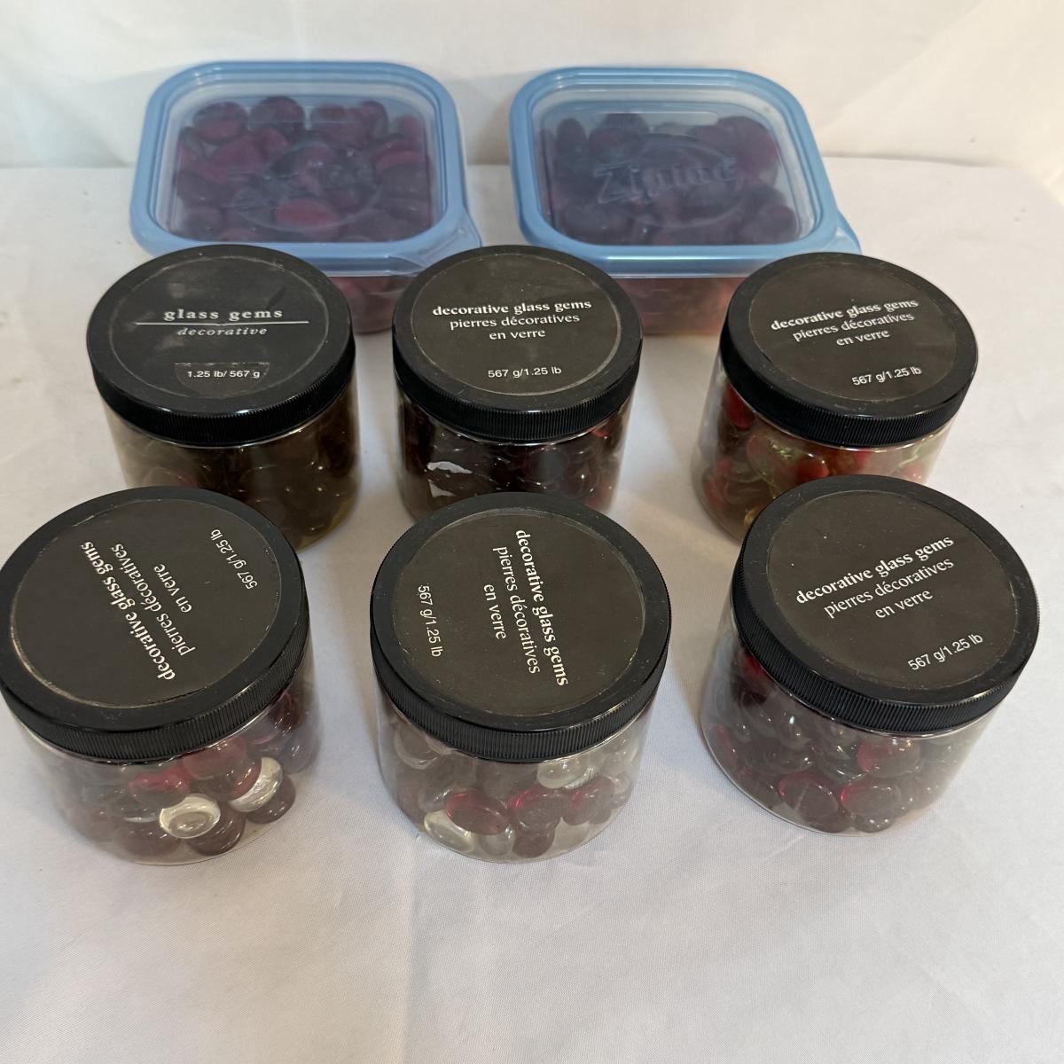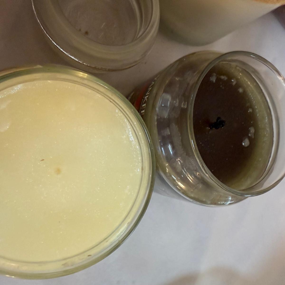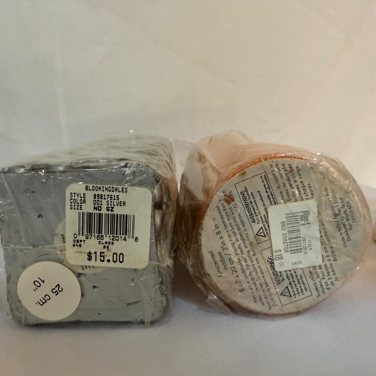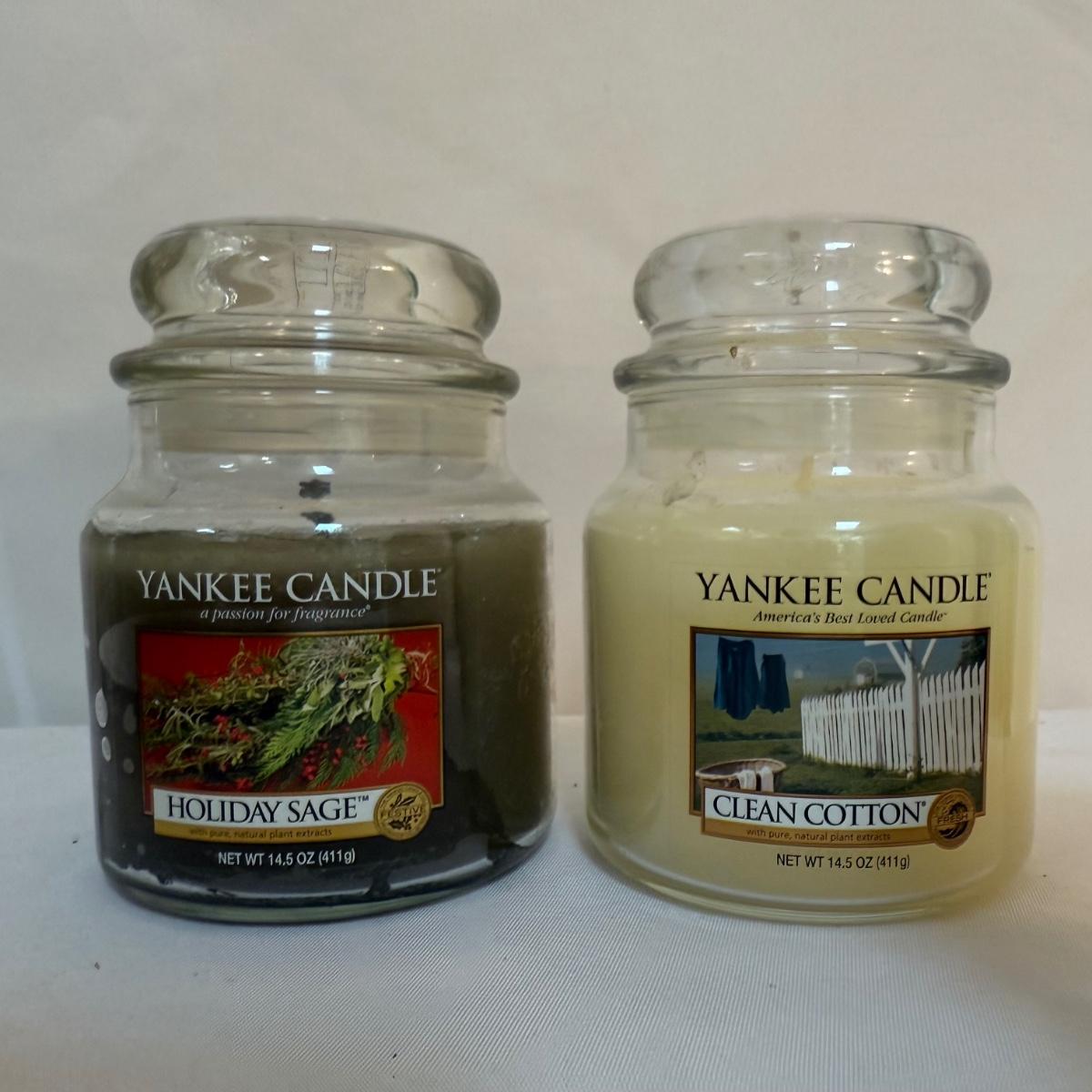 This large collection of candles and candle decor includes five jarred candles from Yankee Candle, Bath & Body Works, and Decorware Inc., five more large candles, plus a package of Luma European taper candles and two 12-packs of tea lights, and 30 Yankee Candle wax melt tarts. Electric wax warmer powered on when plugged in. Also included are a variety of glass candle holders, decorative glass gems, and a Bic Flex Wand lighter. For reference, the largest glass candle holder holding the copper colored candle measures 8”D x 15.75”H.