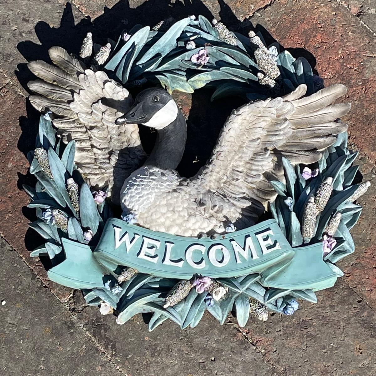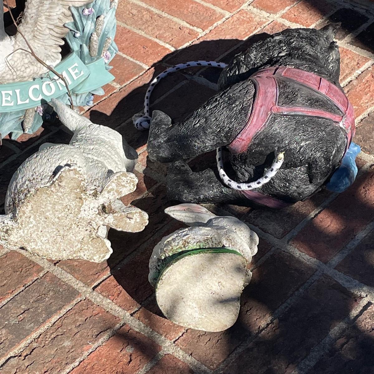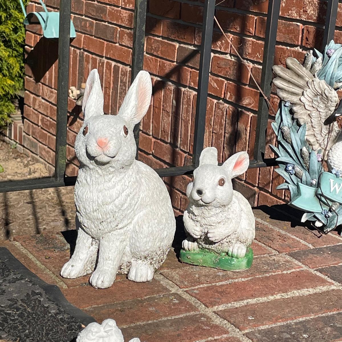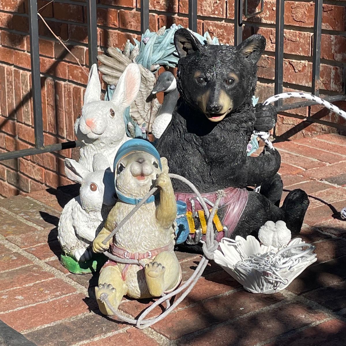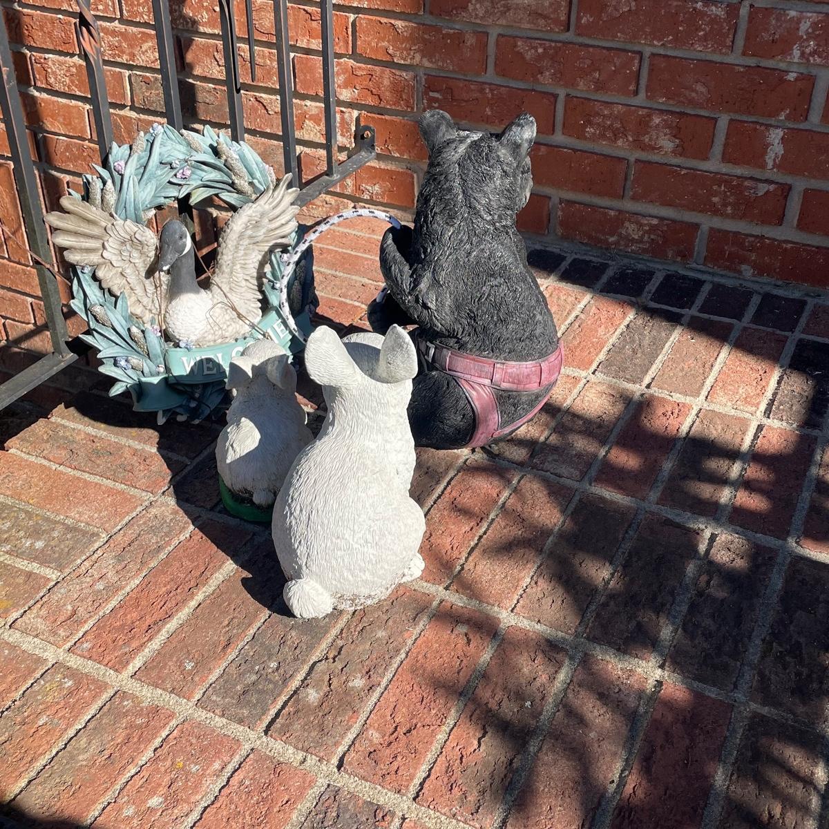 Six adorable yard art critters here to make you smile. Most items appear to be a resin type material except for the two bunnies which are heavier from a cement like material. Canada goose welcome sign does not currently have a way to hang it. A heavy resin tortoise sprinkler was added to this lot later, it measures 7” x 6” x 5”.