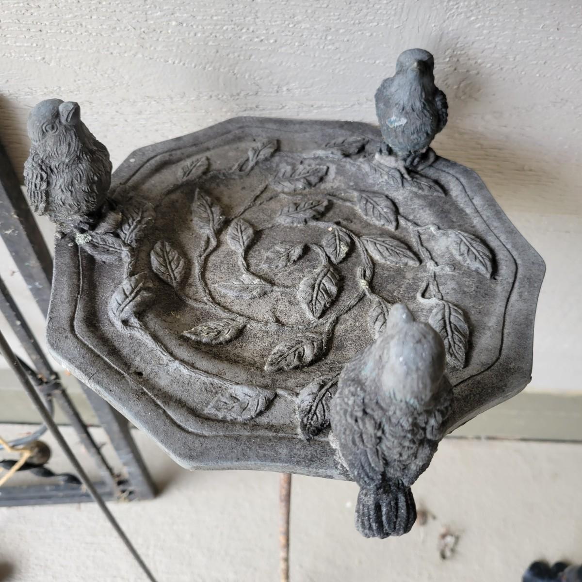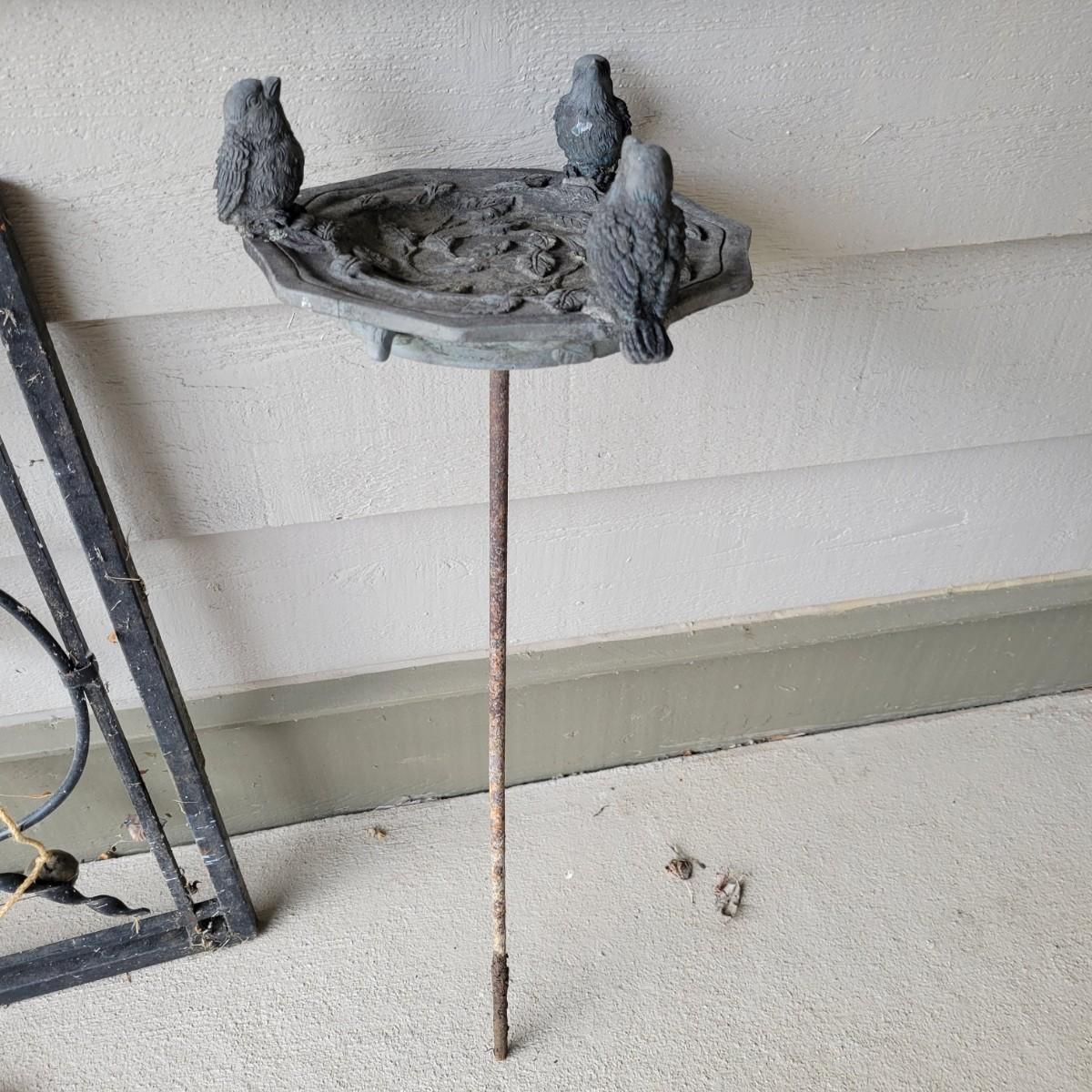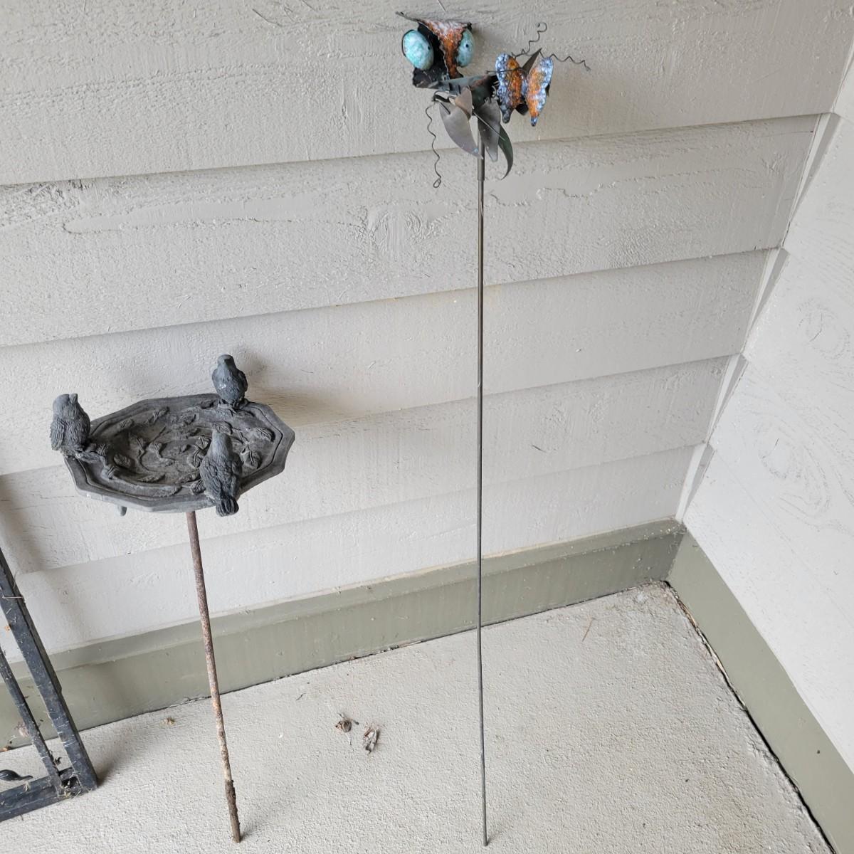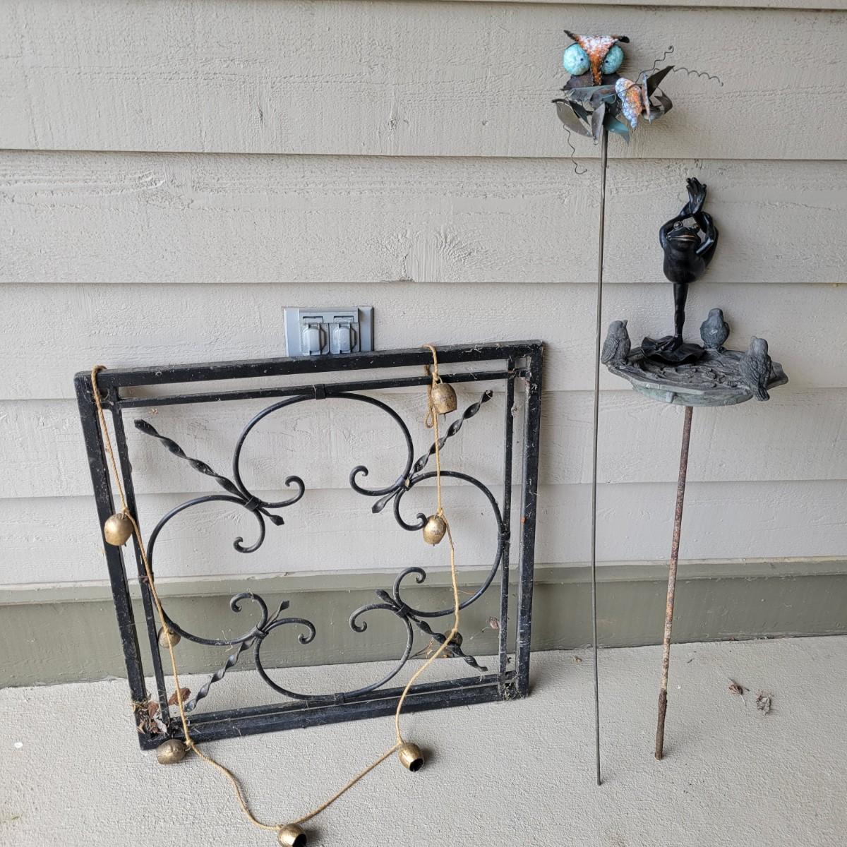 An assortment of yard decor items. Included is a small wooden frog, a plastic cast bird bath with three birds on a stake, a metal butterfly on a stake, a string of metal bells with a beautiful chime and a wrought iron panel. Panel measures approximately 24" x 1" x 24"H. Local pickup only