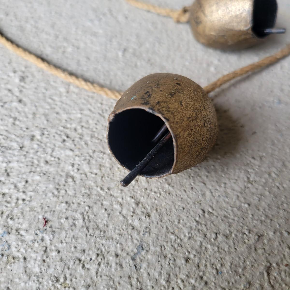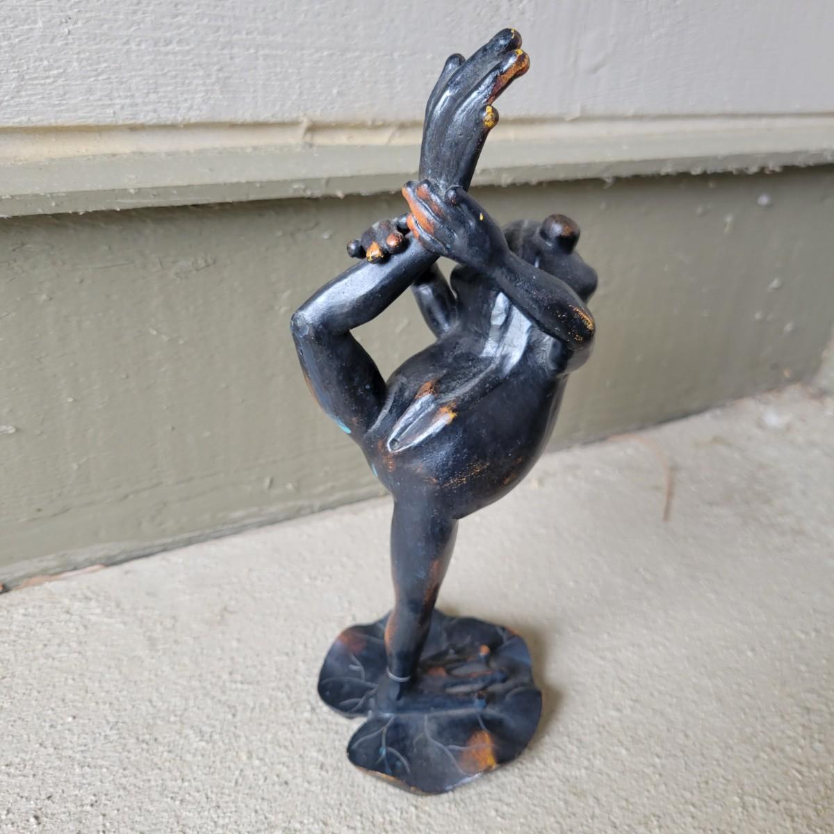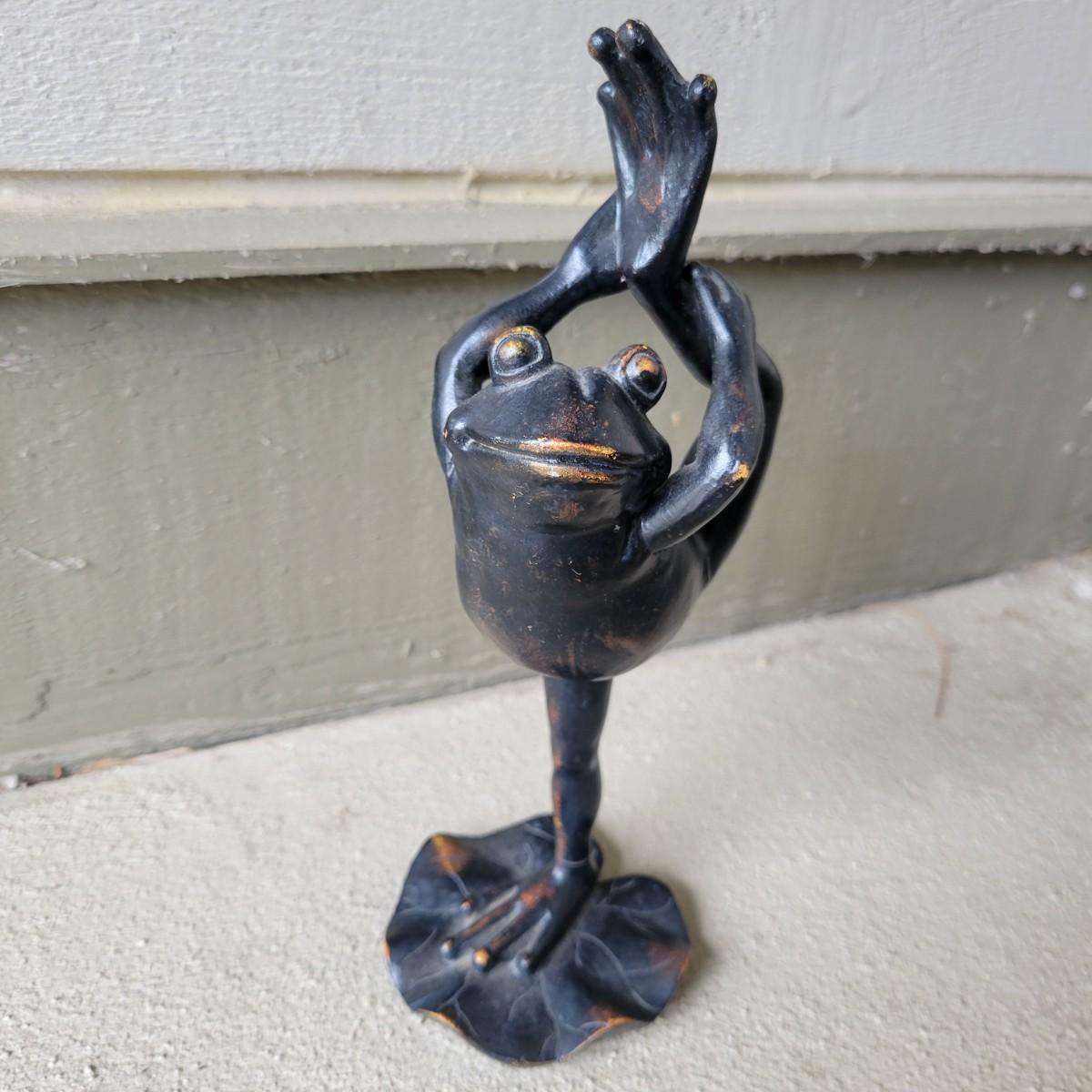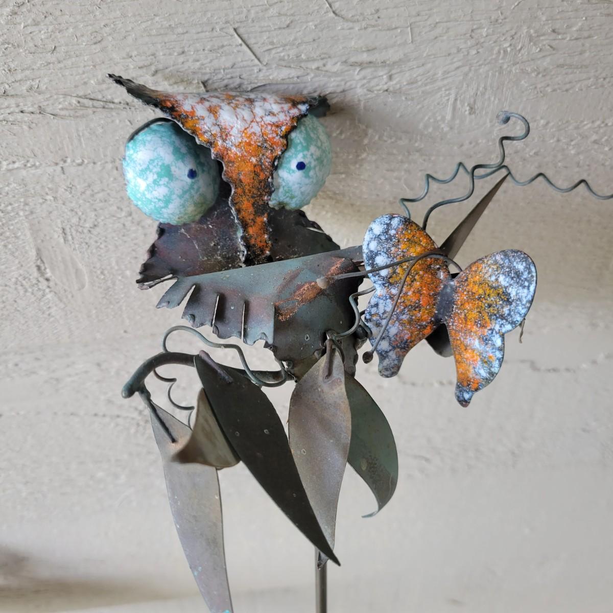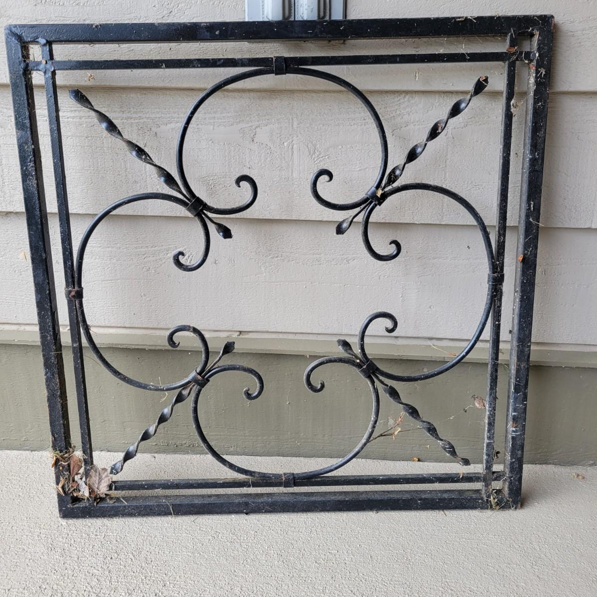 An assortment of yard decor items. Included is a small wooden frog, a plastic cast bird bath with three birds on a stake, a metal butterfly on a stake, a string of metal bells with a beautiful chime and a wrought iron panel. Panel measures approximately 24" x 1" x 24"H. Local pickup only