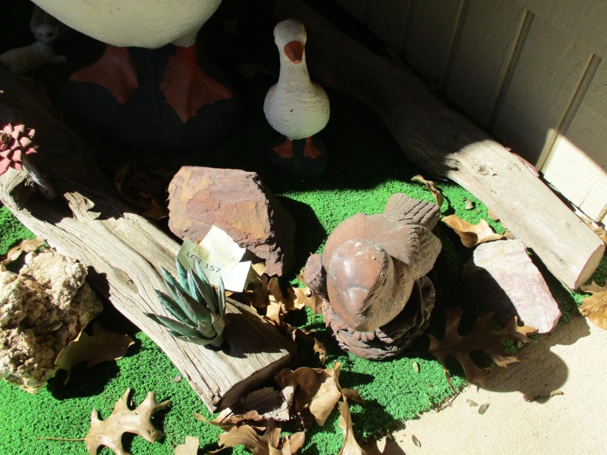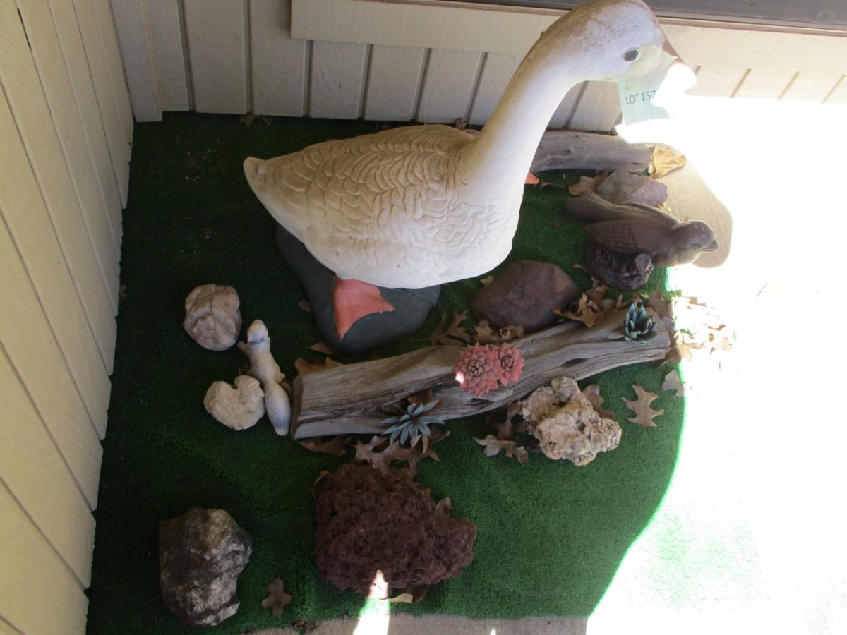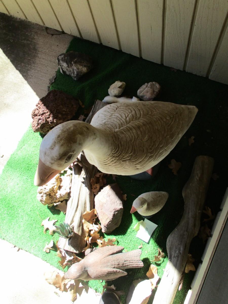 Cement Geese. Logs. rocks. Squirrel Small bird. Green Carpet Square
