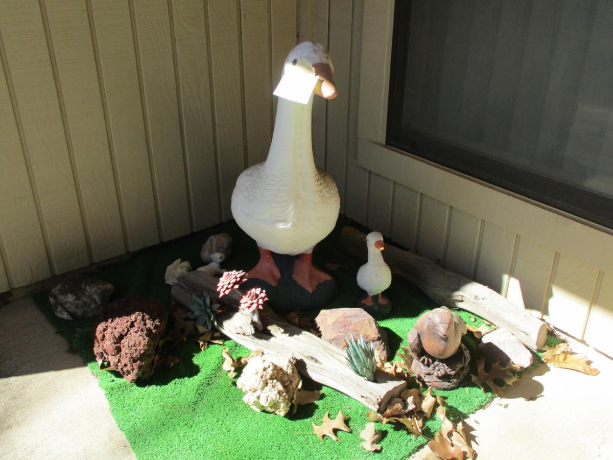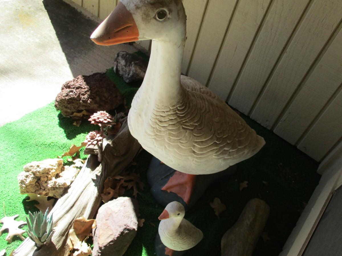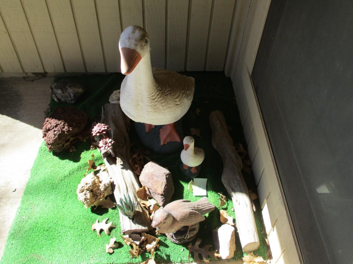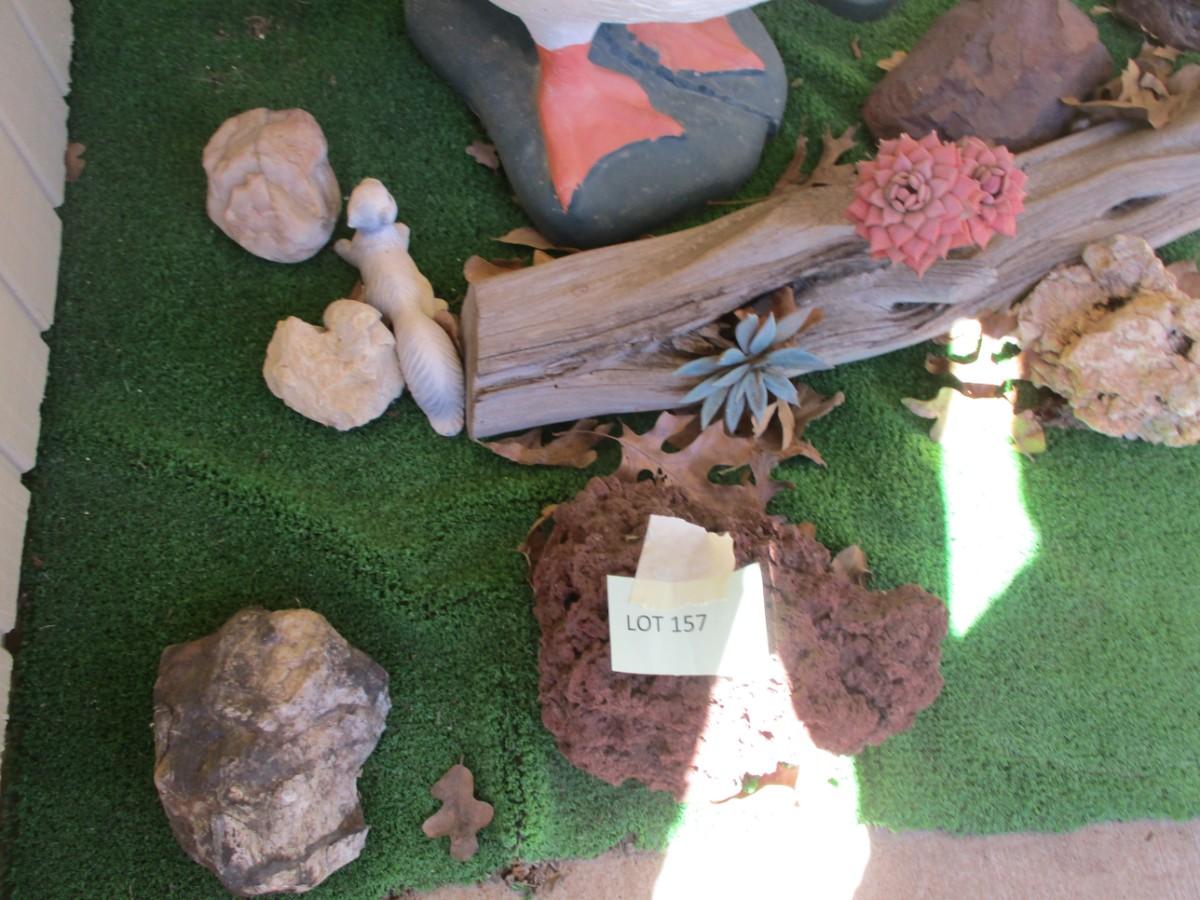 Cement Geese. Logs. rocks. Squirrel Small bird. Green Carpet Square