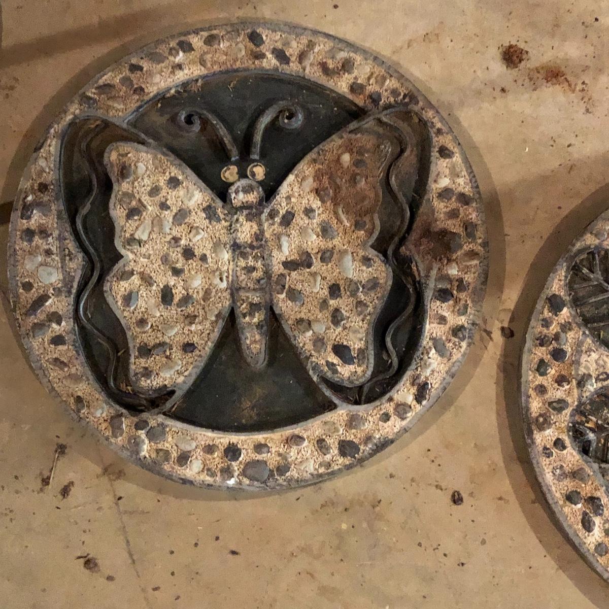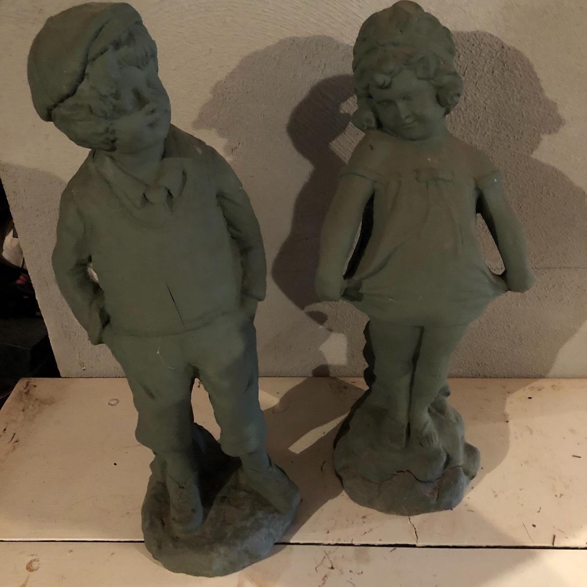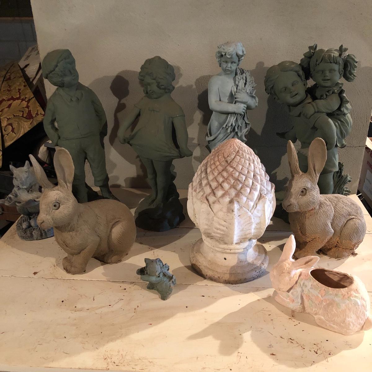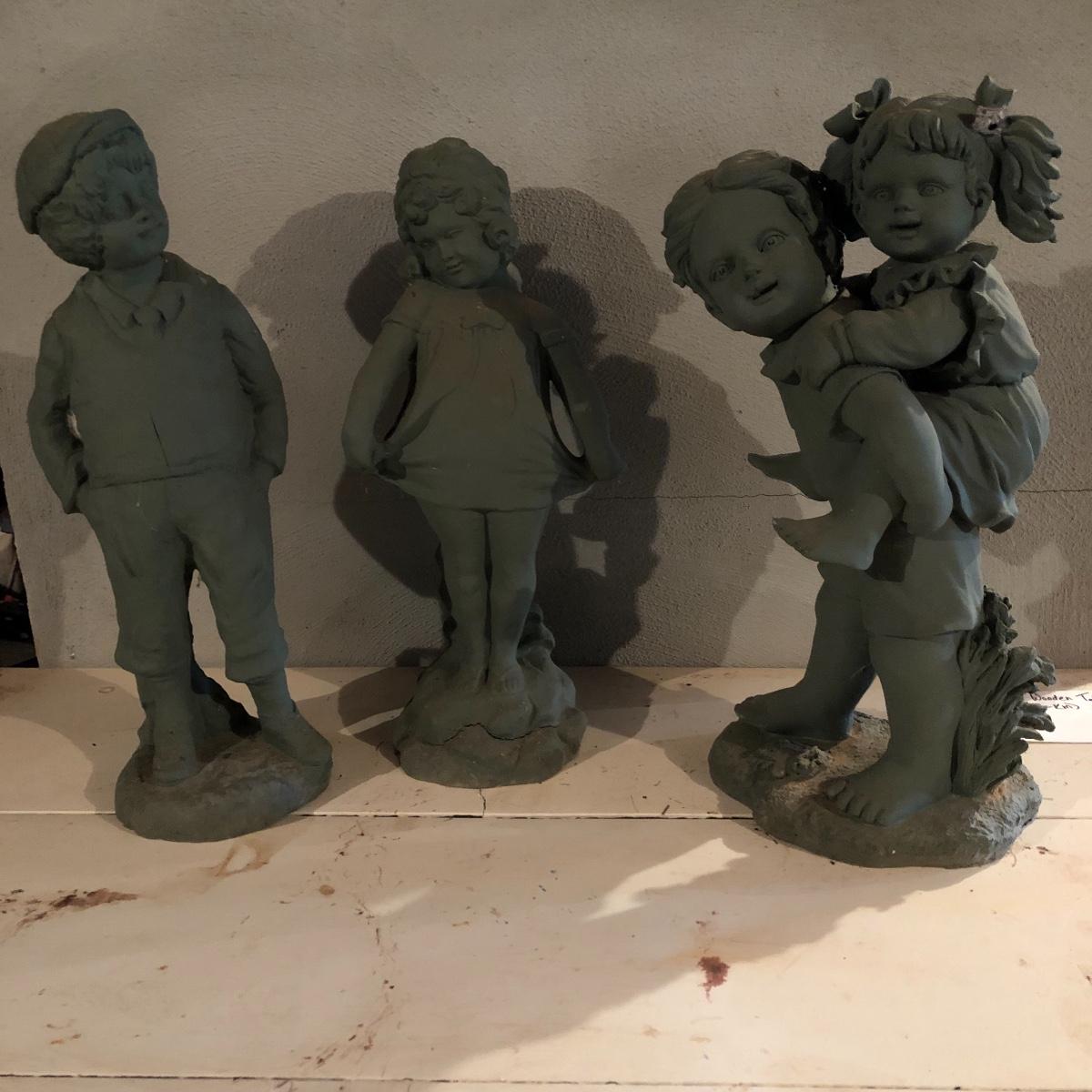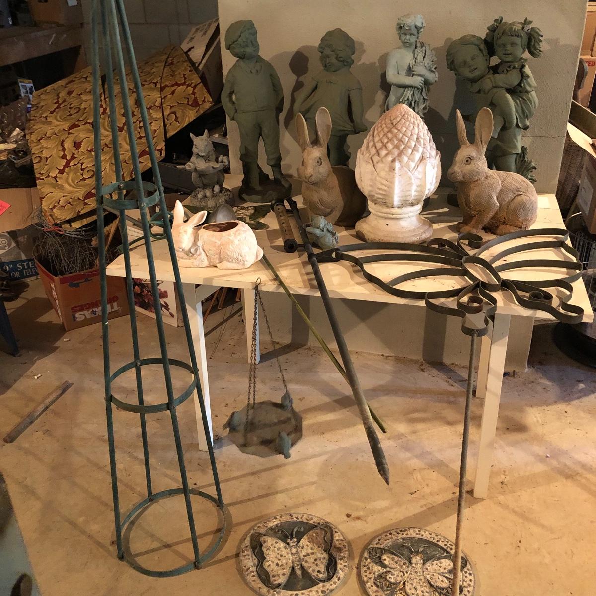 There are three figurines of children: two are heavy and could be concrete and the piggyback figurine is lighter and plastic. They are about 22” tall. The darker green children seem vintage. Note the broken hair ribbon on the piggy back figurine. There are four bunnies; two are similar (plastic filled with sand). There are yard plaques or stepping stones, a bird bath (hangs), a metal tripod, two metal butterflies and more! Local pick up only.