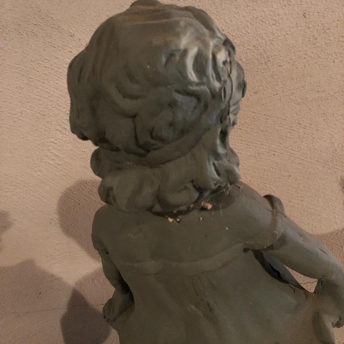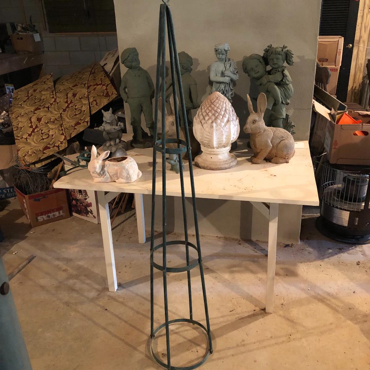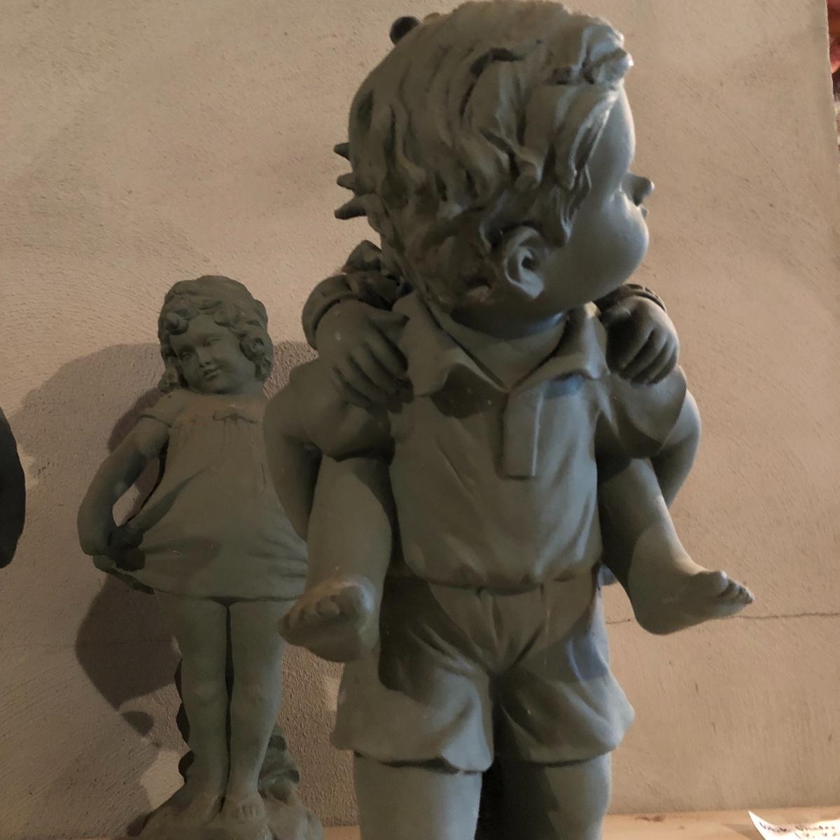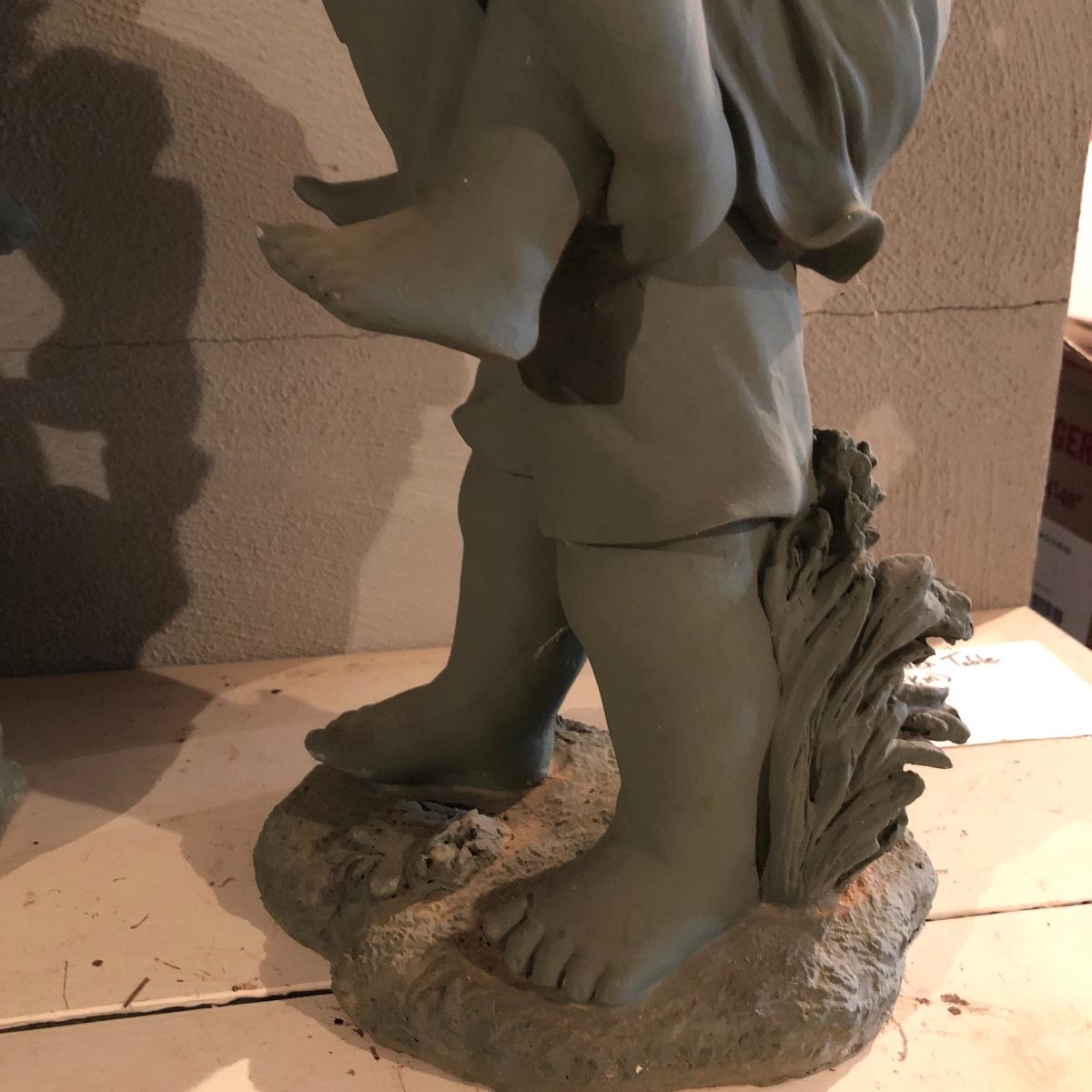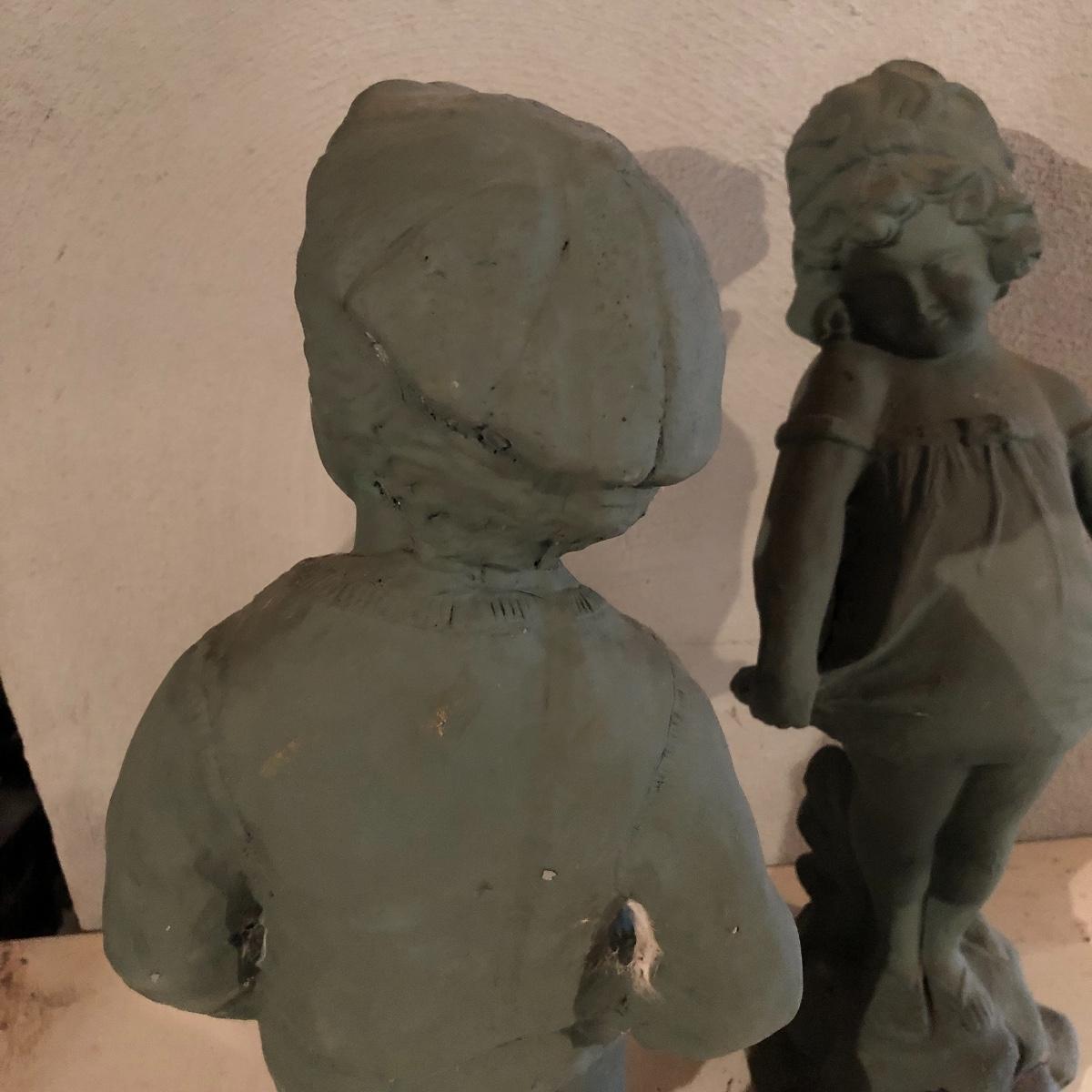 There are three figurines of children: two are heavy and could be concrete and the piggyback figurine is lighter and plastic. They are about 22” tall. The darker green children seem vintage. Note the broken hair ribbon on the piggy back figurine. There are four bunnies; two are similar (plastic filled with sand). There are yard plaques or stepping stones, a bird bath (hangs), a metal tripod, two metal butterflies and more! Local pick up only.