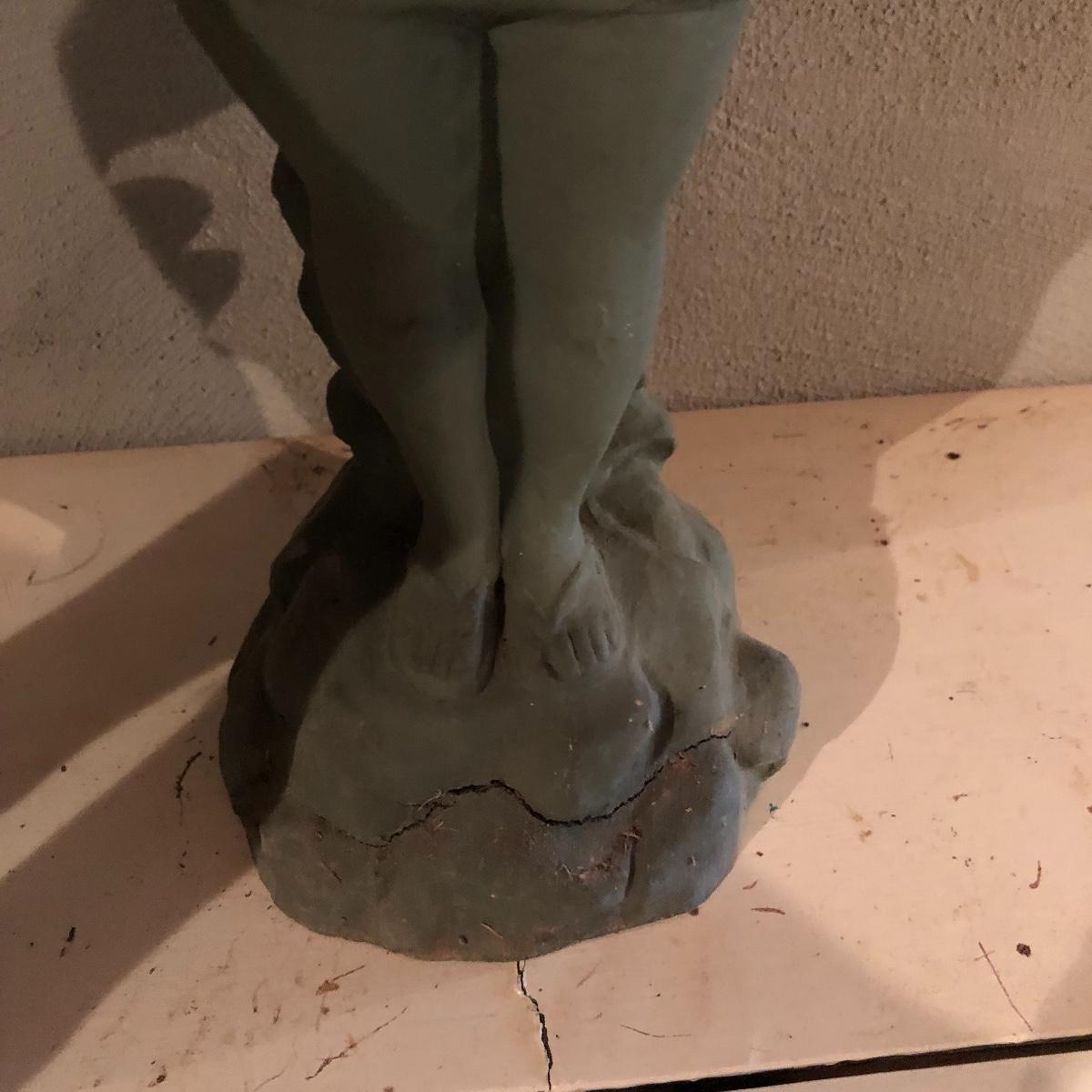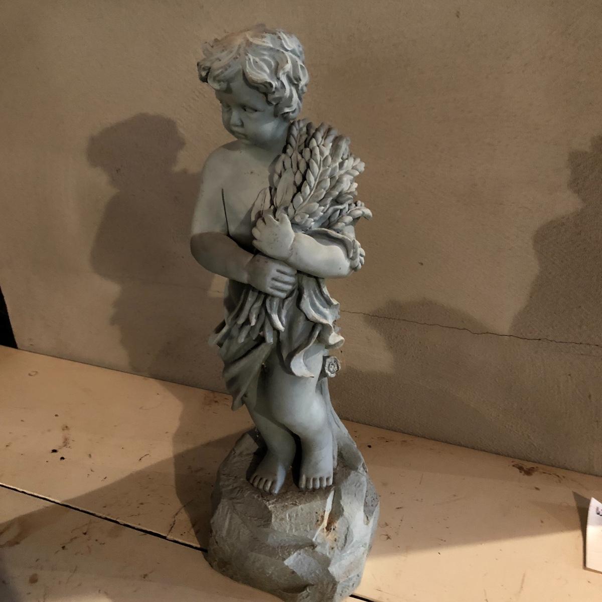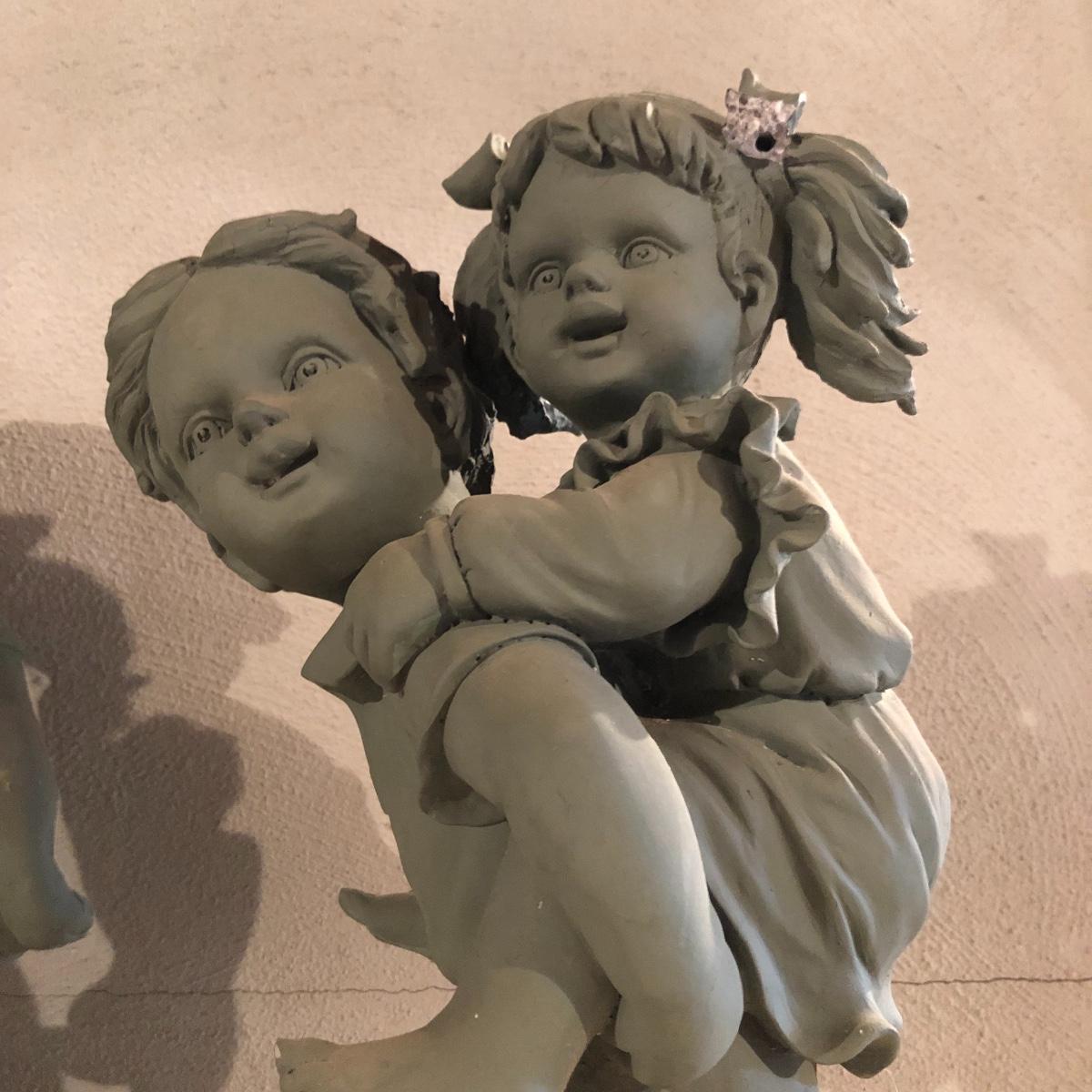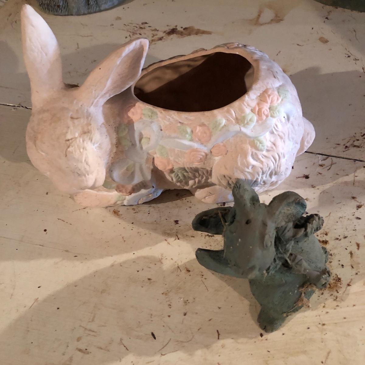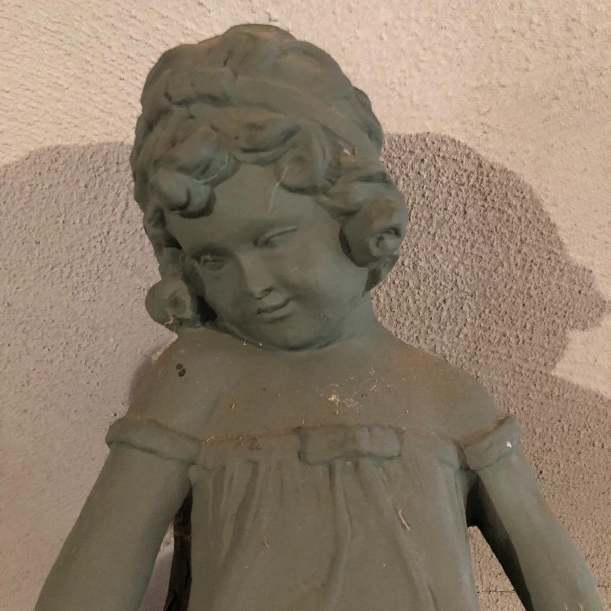 There are three figurines of children: two are heavy and could be concrete and the piggyback figurine is lighter and plastic. They are about 22” tall. The darker green children seem vintage. Note the broken hair ribbon on the piggy back figurine. There are four bunnies; two are similar (plastic filled with sand). There are yard plaques or stepping stones, a bird bath (hangs), a metal tripod, two metal butterflies and more! Local pick up only.