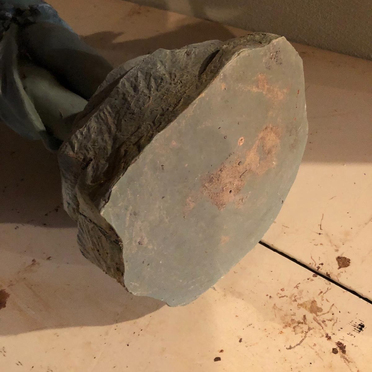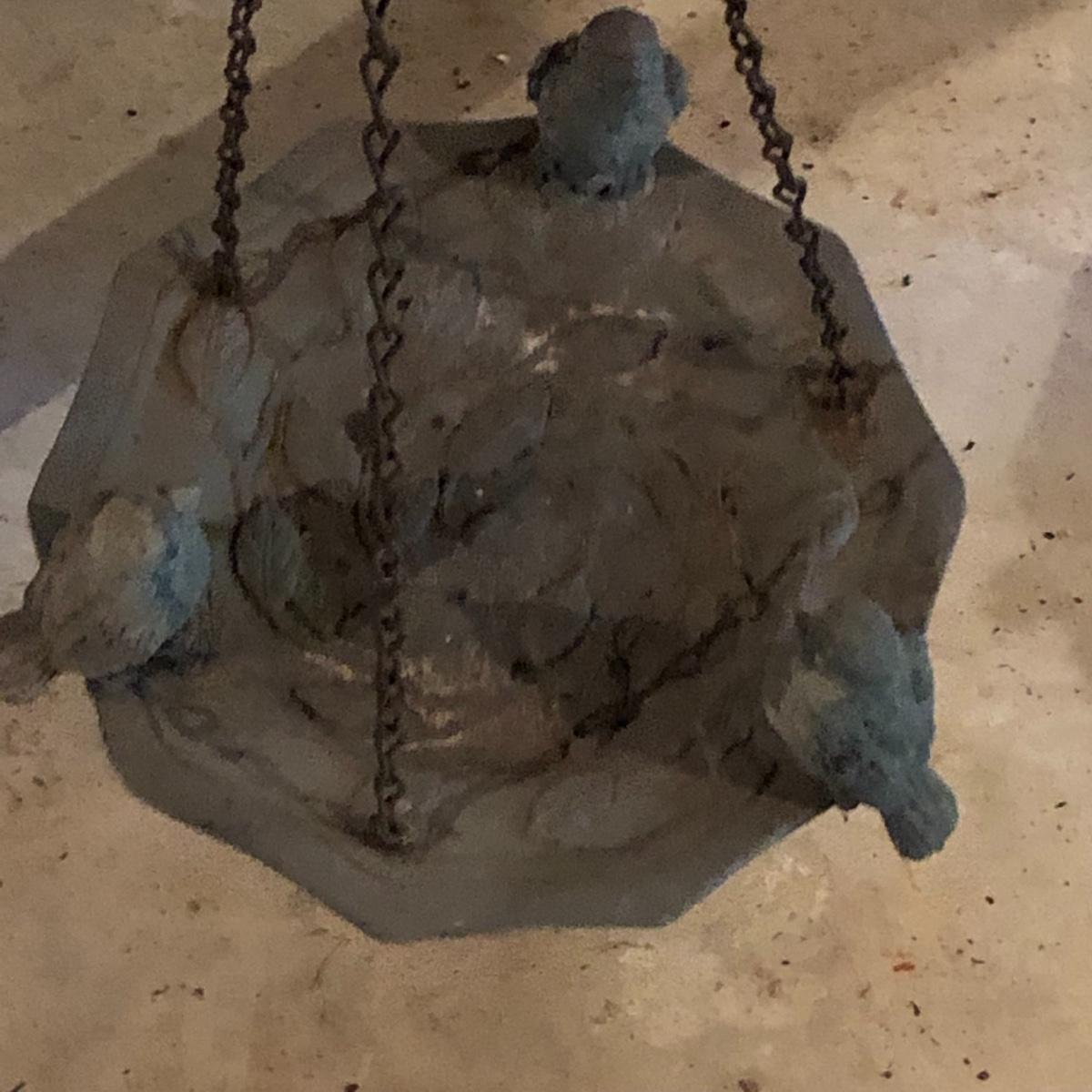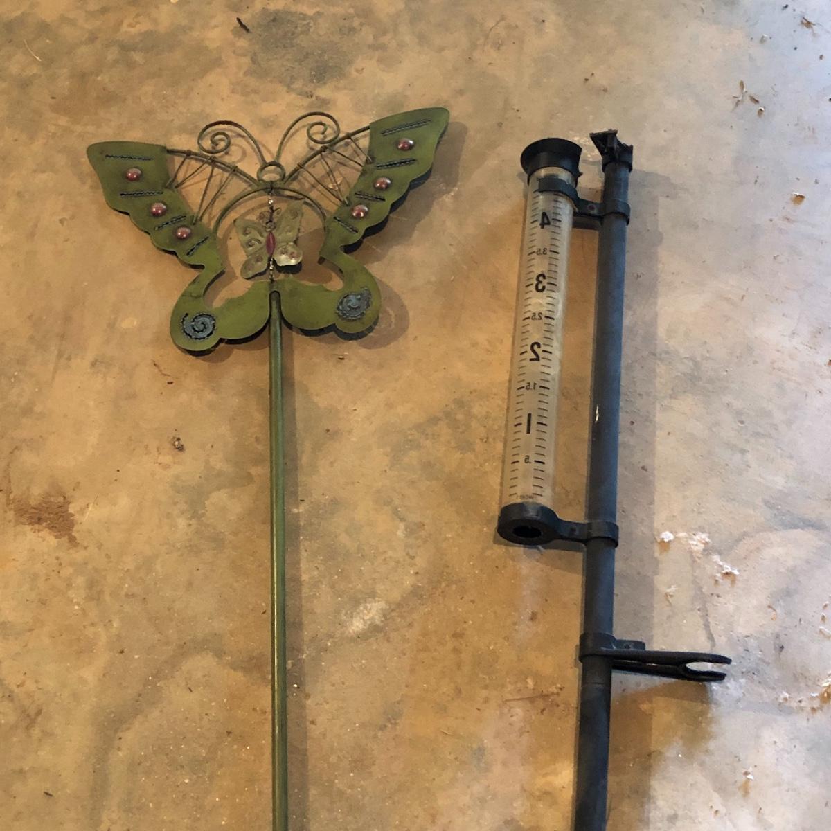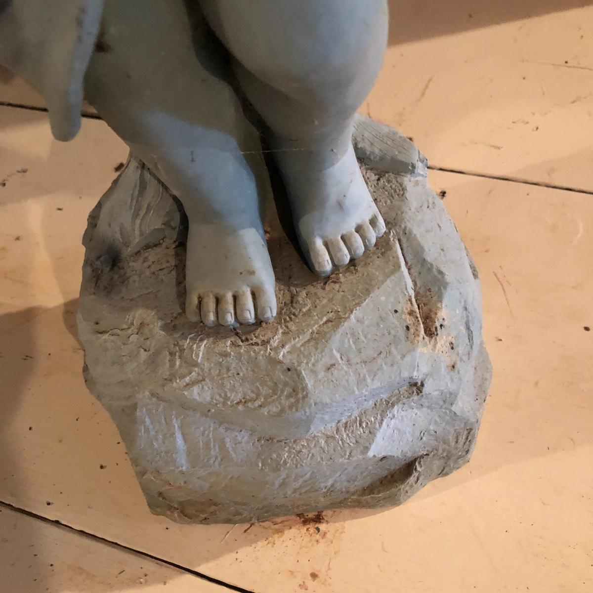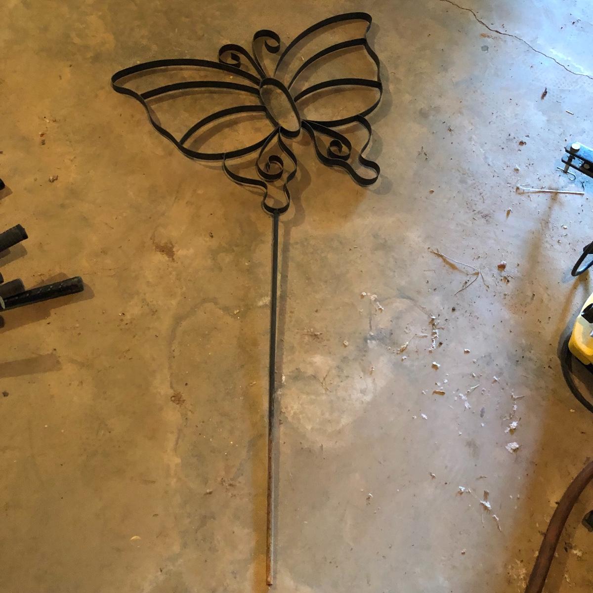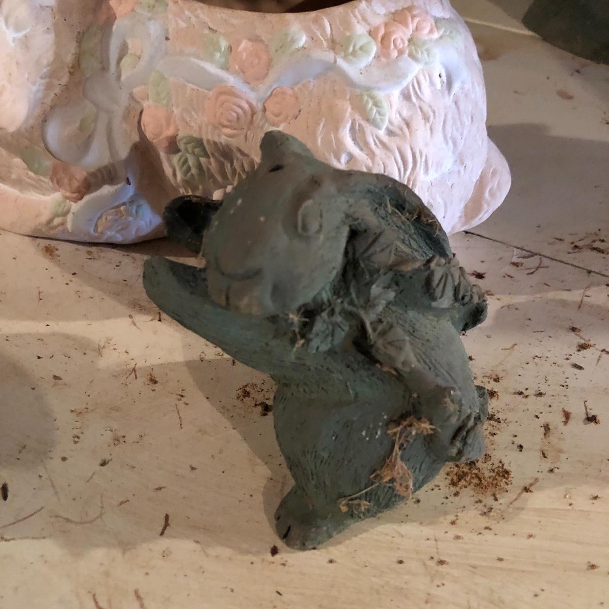 There are three figurines of children: two are heavy and could be concrete and the piggyback figurine is lighter and plastic. They are about 22” tall. The darker green children seem vintage. Note the broken hair ribbon on the piggy back figurine. There are four bunnies; two are similar (plastic filled with sand). There are yard plaques or stepping stones, a bird bath (hangs), a metal tripod, two metal butterflies and more! Local pick up only.
