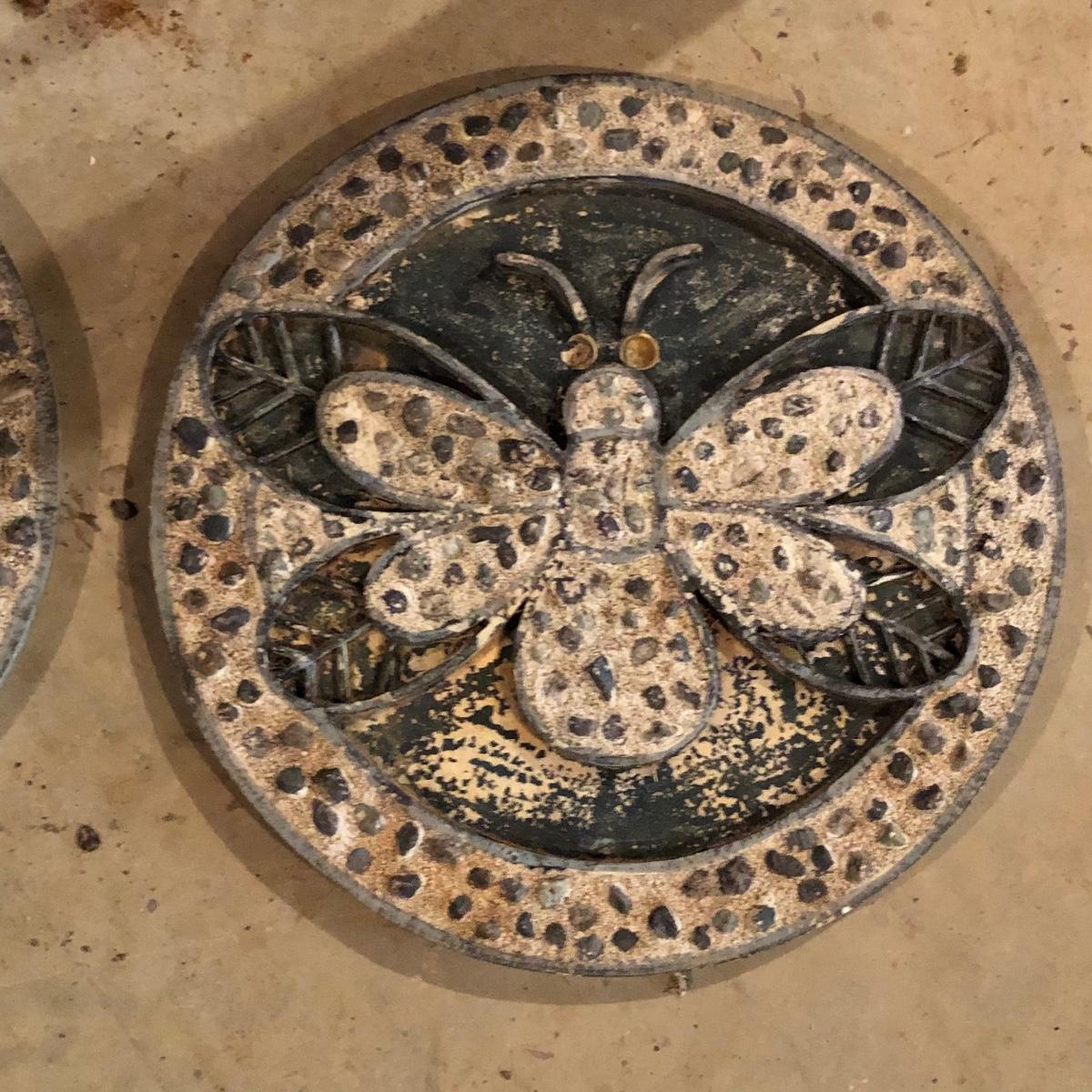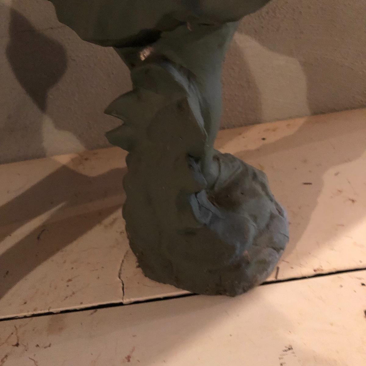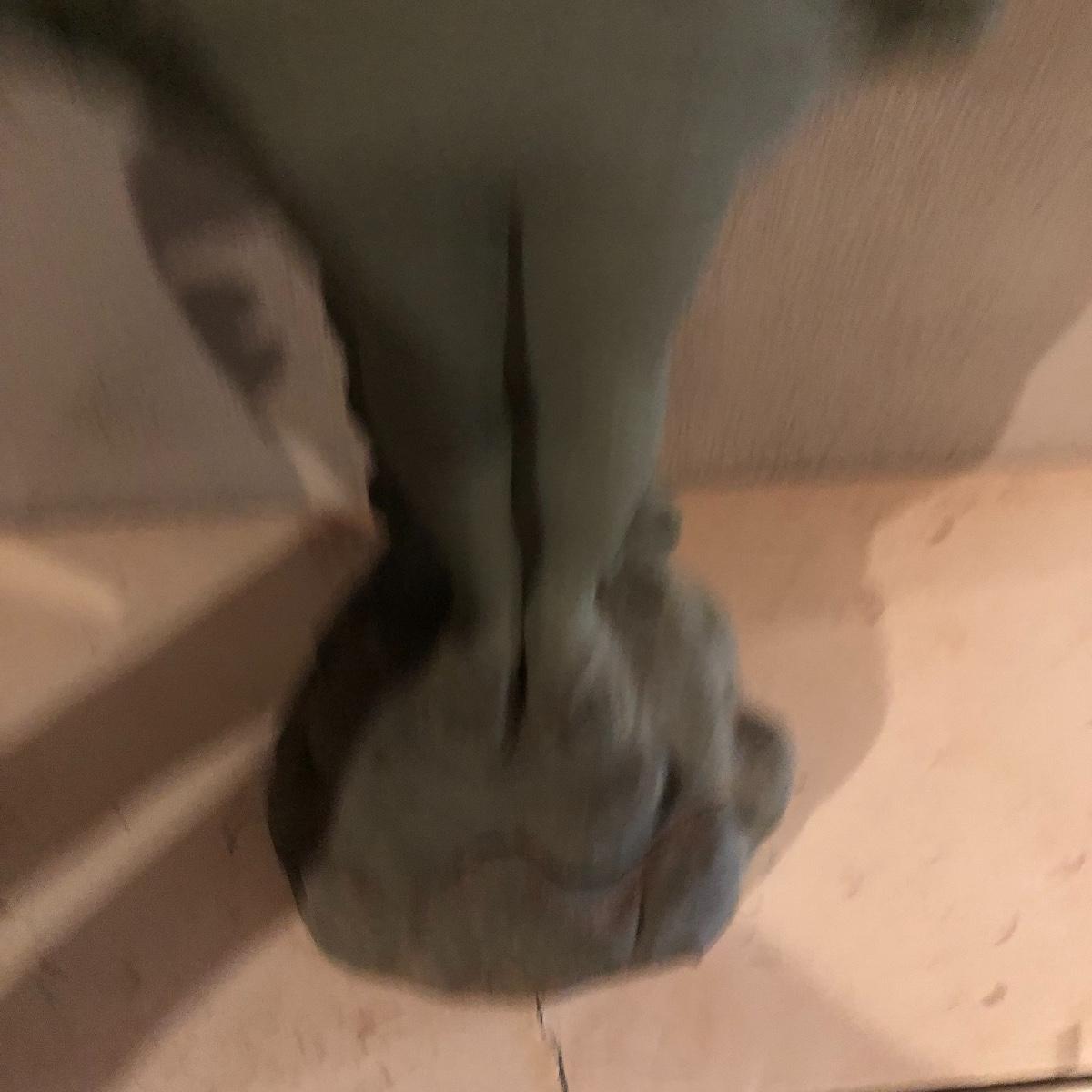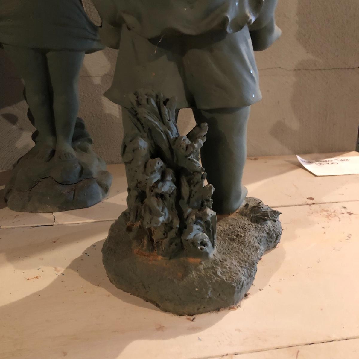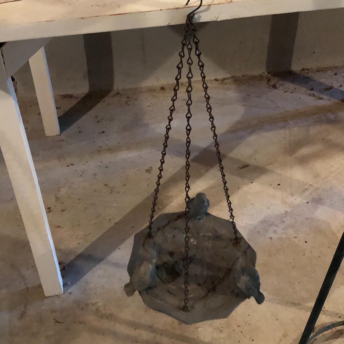 There are three figurines of children: two are heavy and could be concrete and the piggyback figurine is lighter and plastic. They are about 22” tall. The darker green children seem vintage. Note the broken hair ribbon on the piggy back figurine. There are four bunnies; two are similar (plastic filled with sand). There are yard plaques or stepping stones, a bird bath (hangs), a metal tripod, two metal butterflies and more! Local pick up only.
